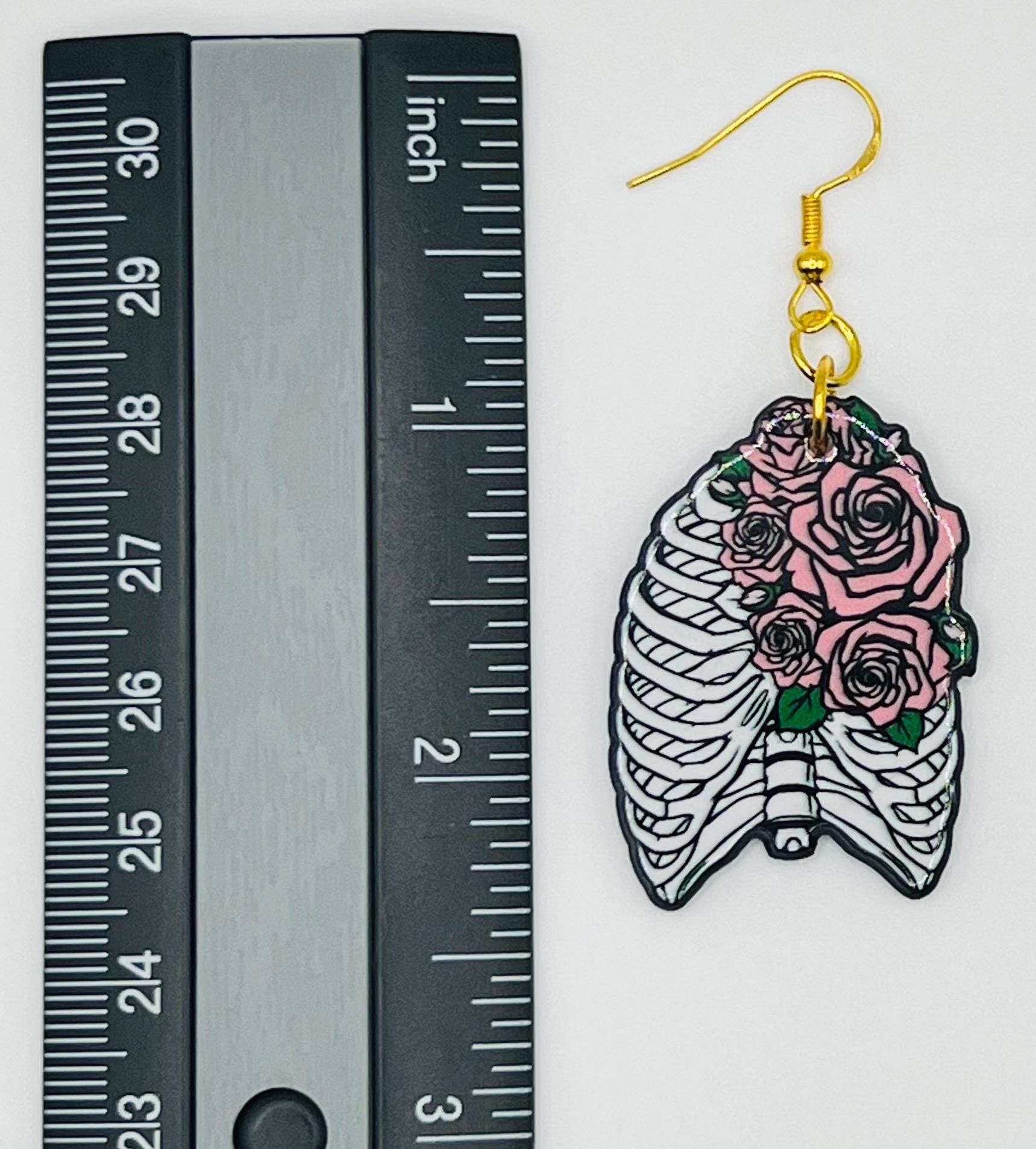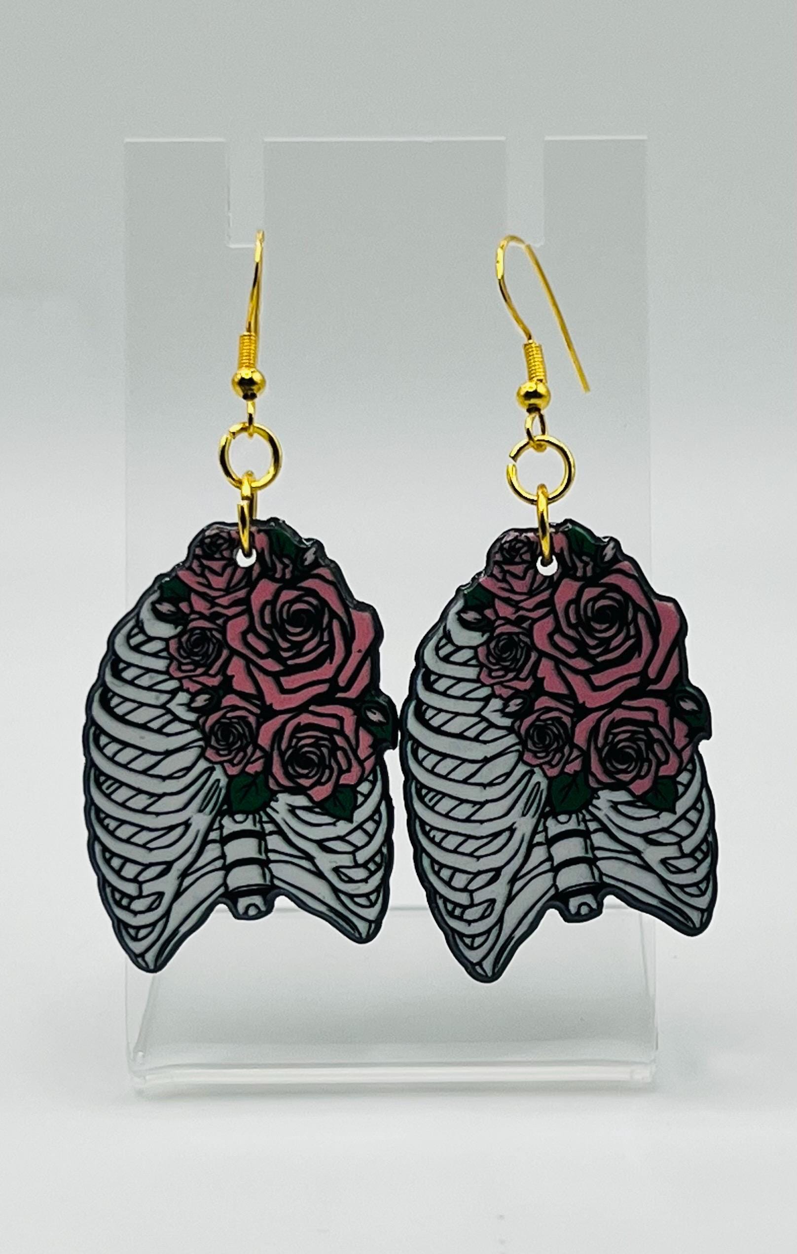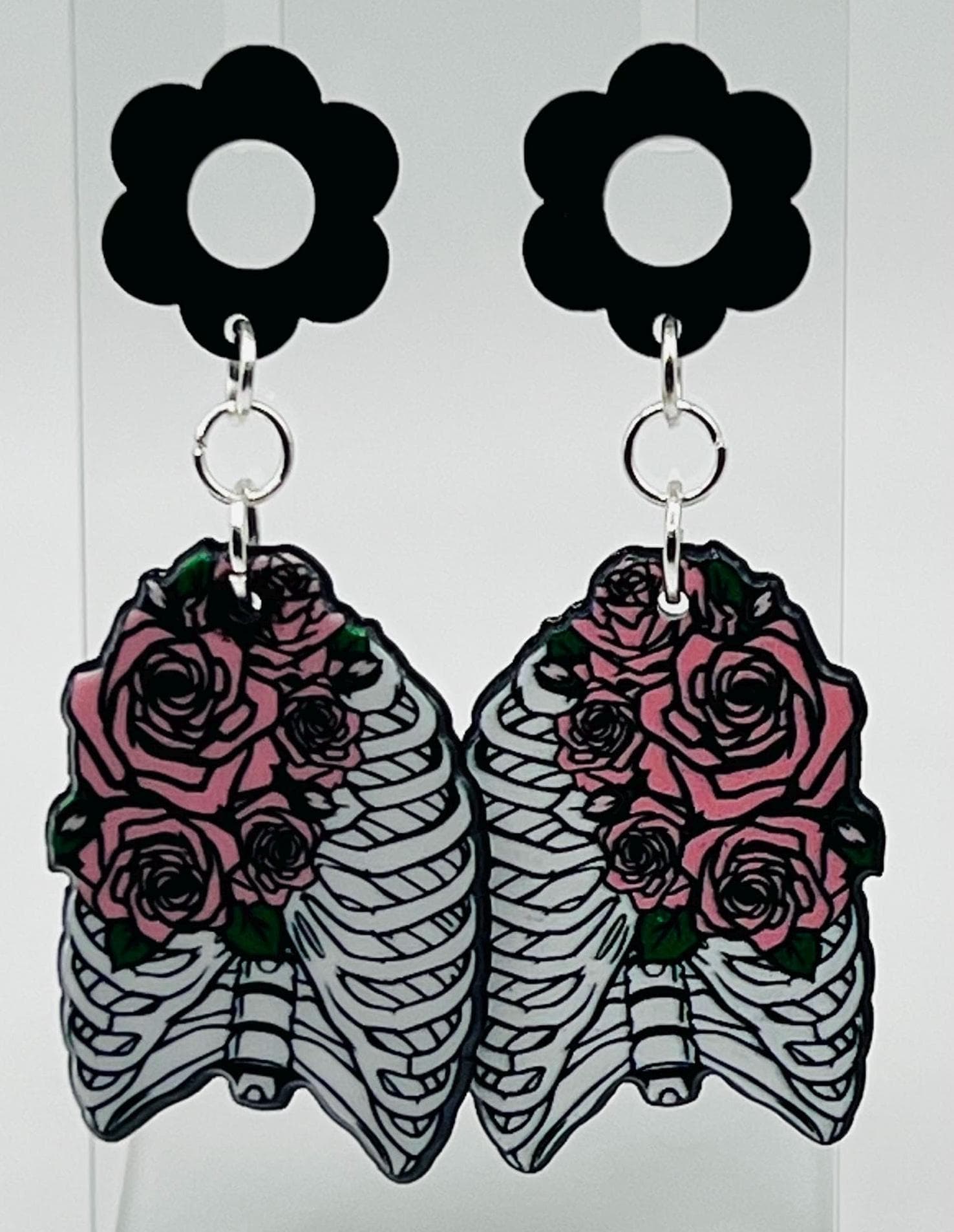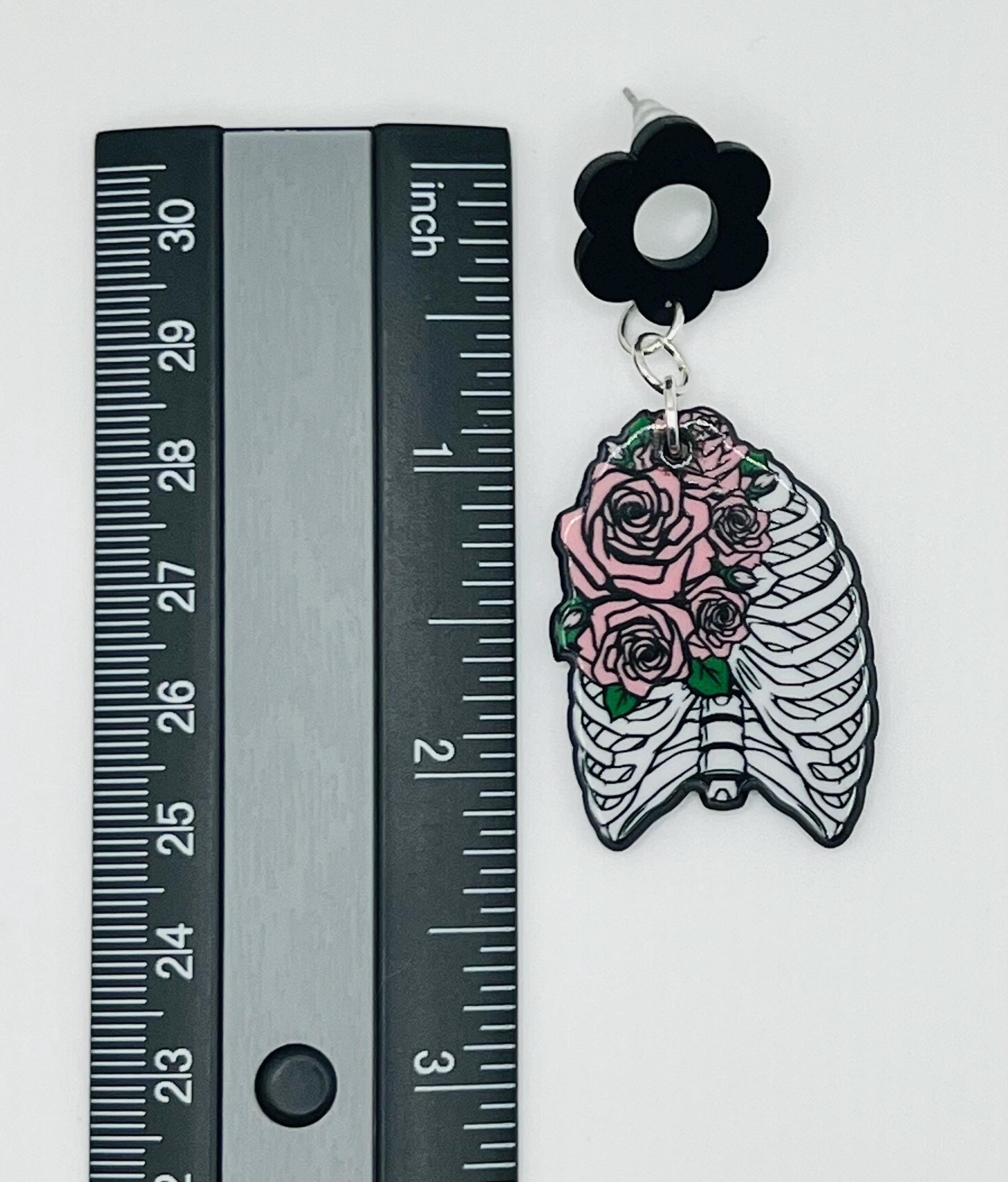 Goth Flower Rib Cage Earrings: Hypoallergenic Gunmetal Gray