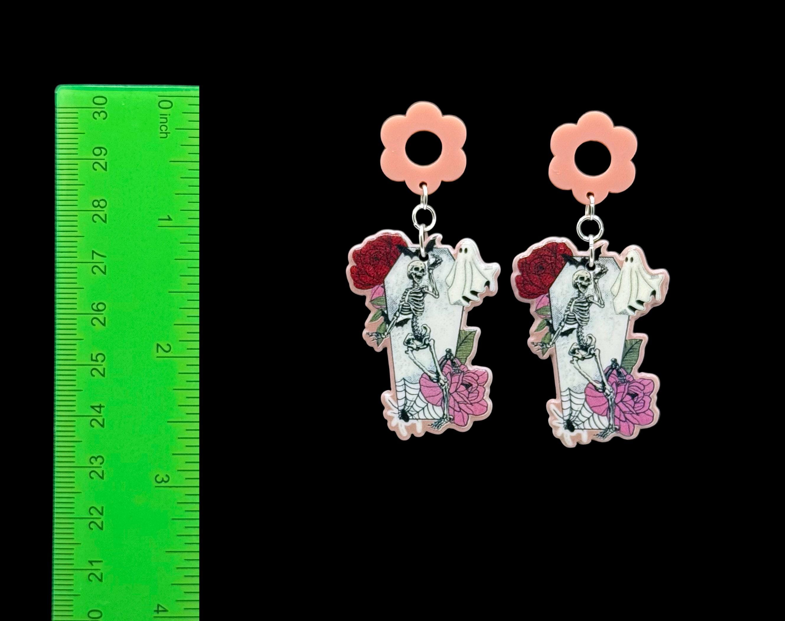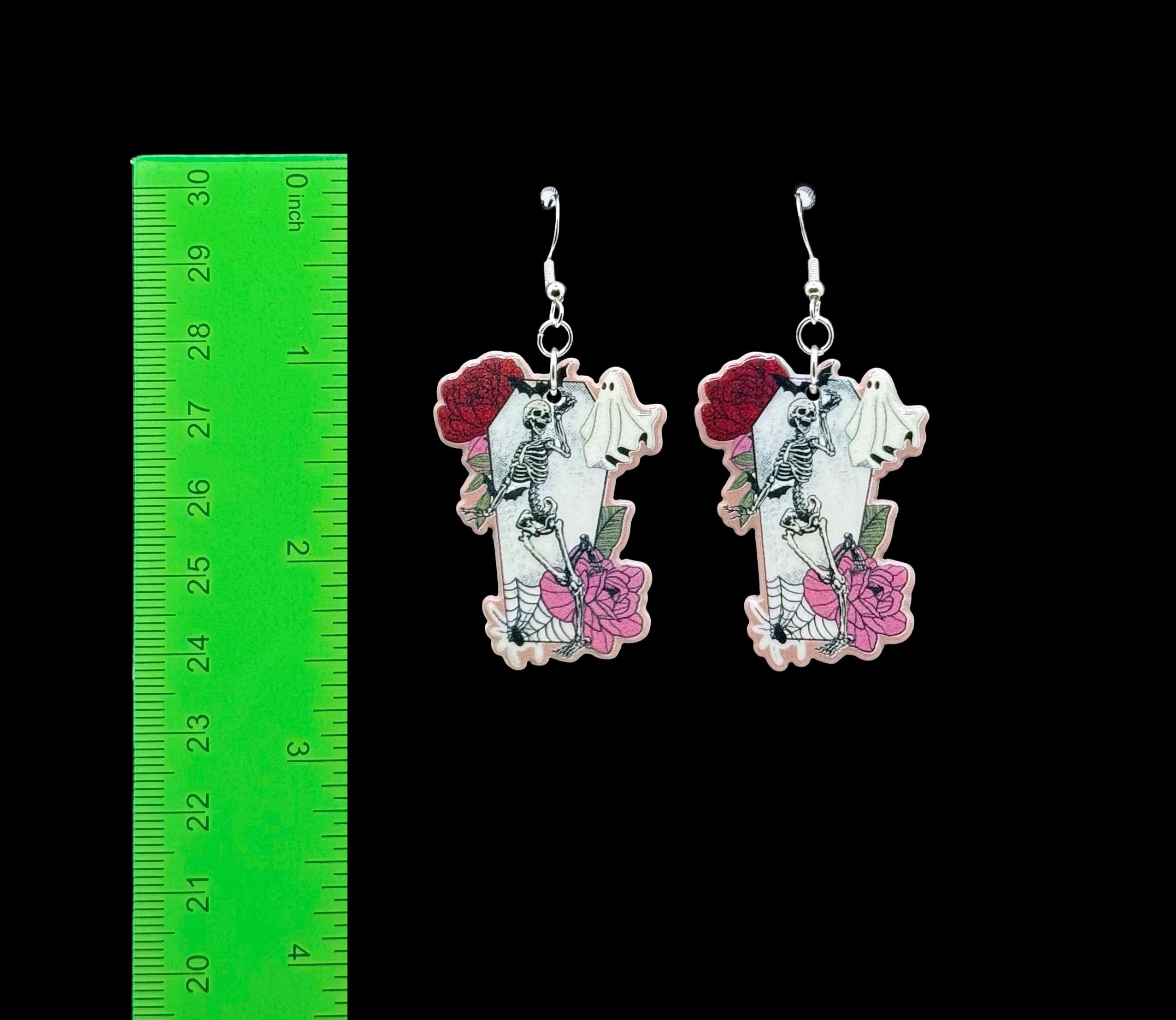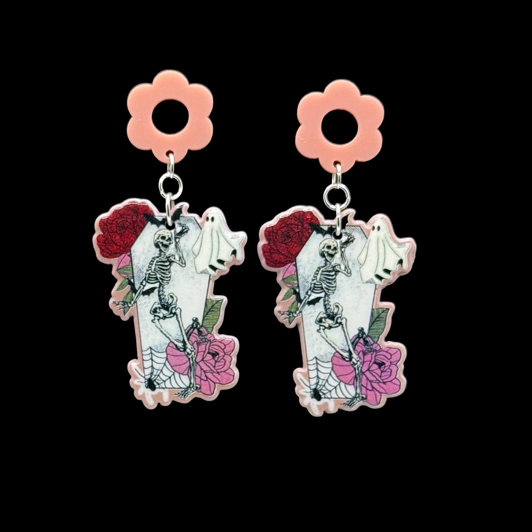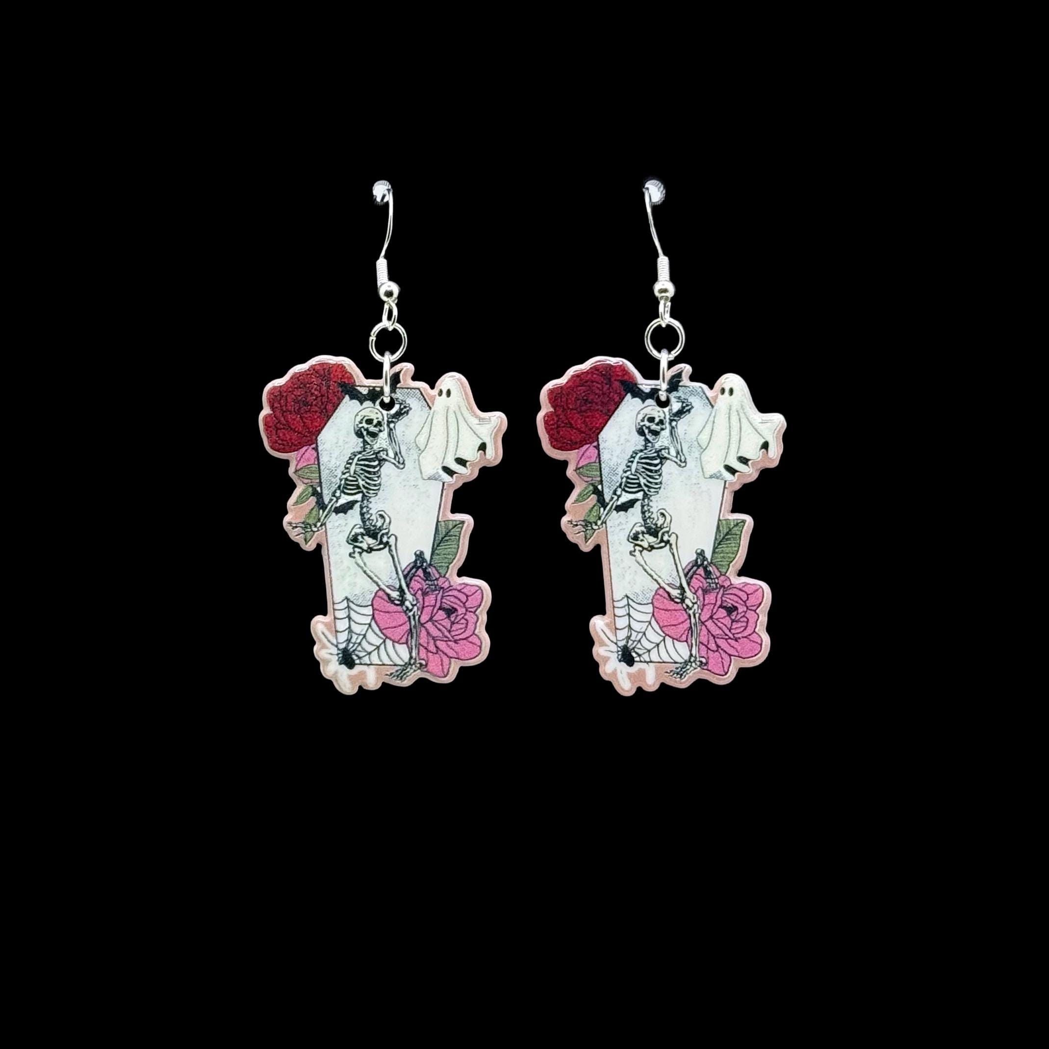 Pastel Coffin Dangle Earrings: Skeleton Ghost Floral Design