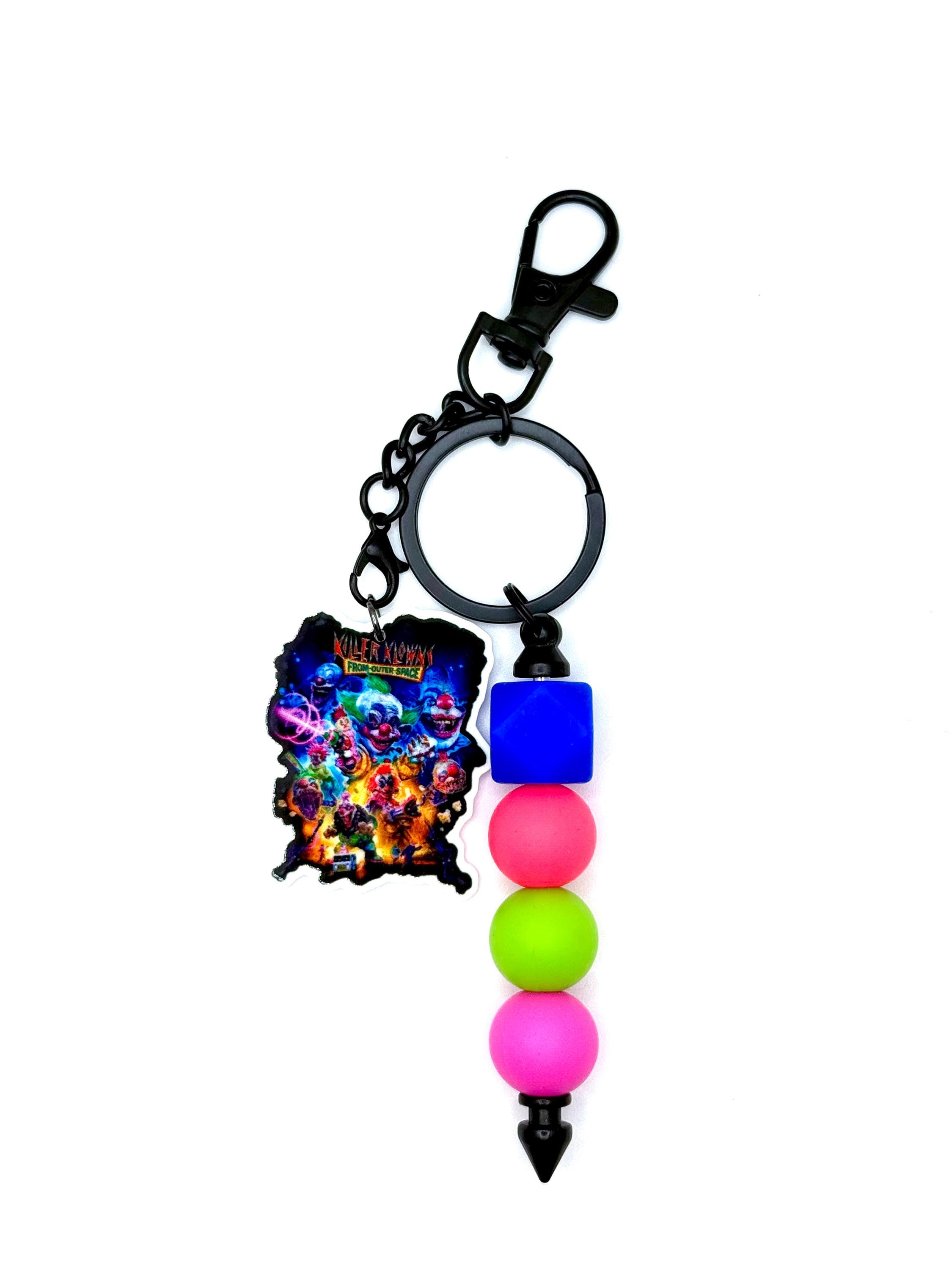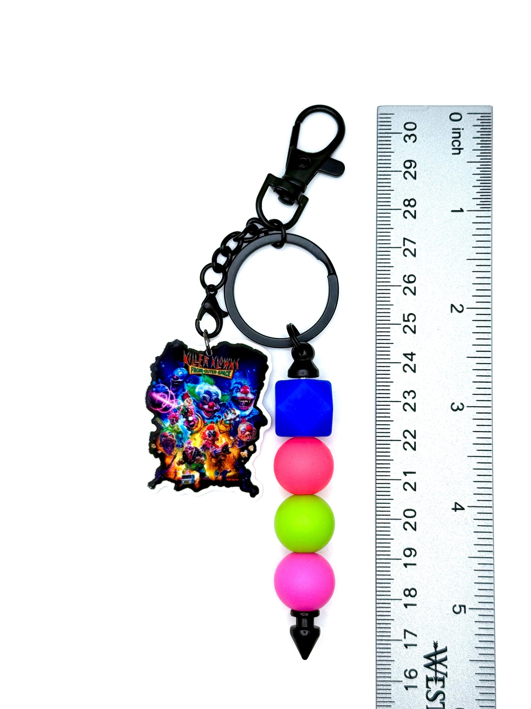 Step right up and embrace the creepy chaos with this keychain!π€‘π½ These wacky, terrifying clowns are here to add a little fun and fright to your keys or bag. Whether you're a fan of cult classic horror or just love adding a quirky touch to your accessories, this handmade charm brings some wild, spooky vibes to your everyday carry. With silicone beads on the spiked post, itβs the perfect piece for anyone who loves a little frightful fun!