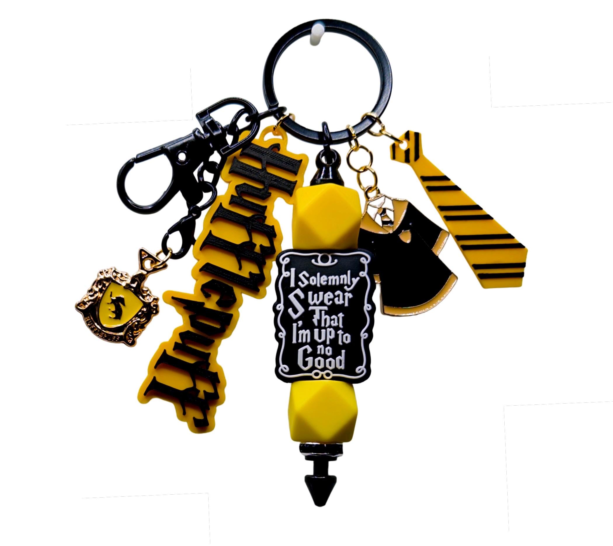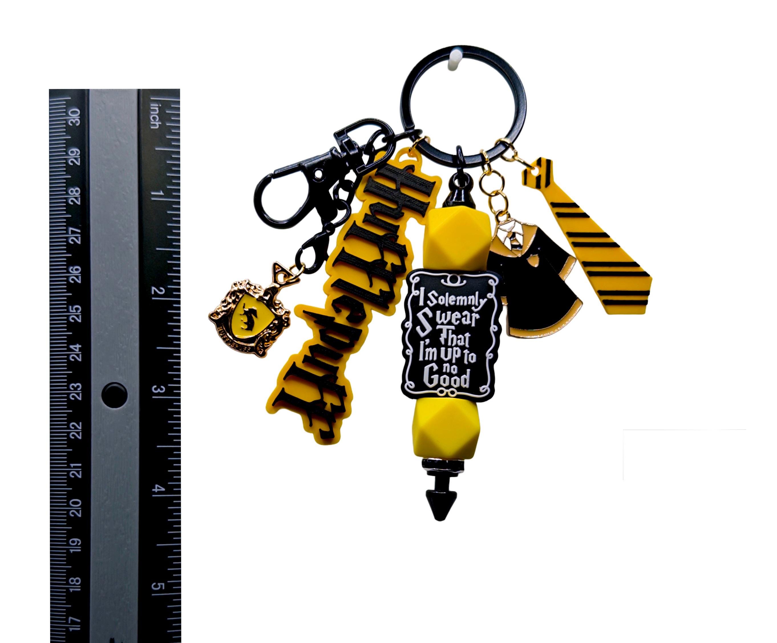 Details: - Mixed media keychain - Silicone beads - Metal cloak charm - Metal crest charm - 3D parts printed in bright loyal yellow and unwavering midnight black - Secure keyring with lobster clasp - Lightweight with a solid feel - Handmade and assembled with care