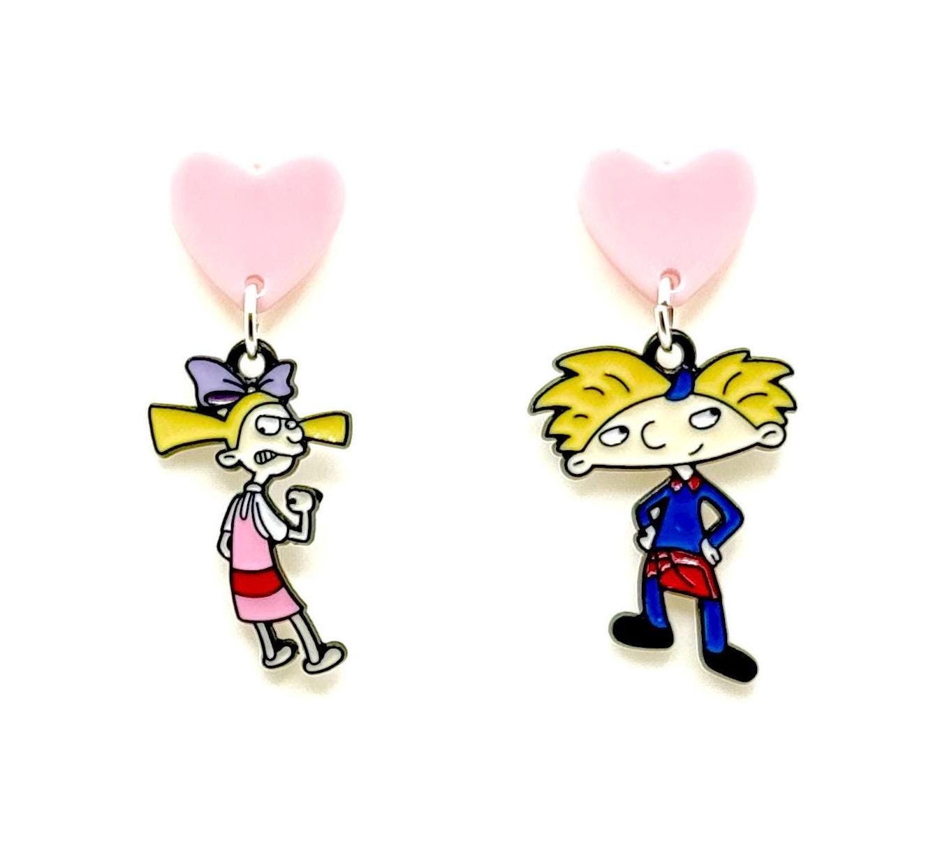 Show off your nostalgic side with these earrings featuring a pair of feisty and lovable characters! 💖✨ One is always ready to speak her mind, and the other is known for his unforgettable, adventurous spirit and that signature football-shaped head. With a cute pink heart accent, these handmade earrings bring some playful attitude and 90s charm to your look!