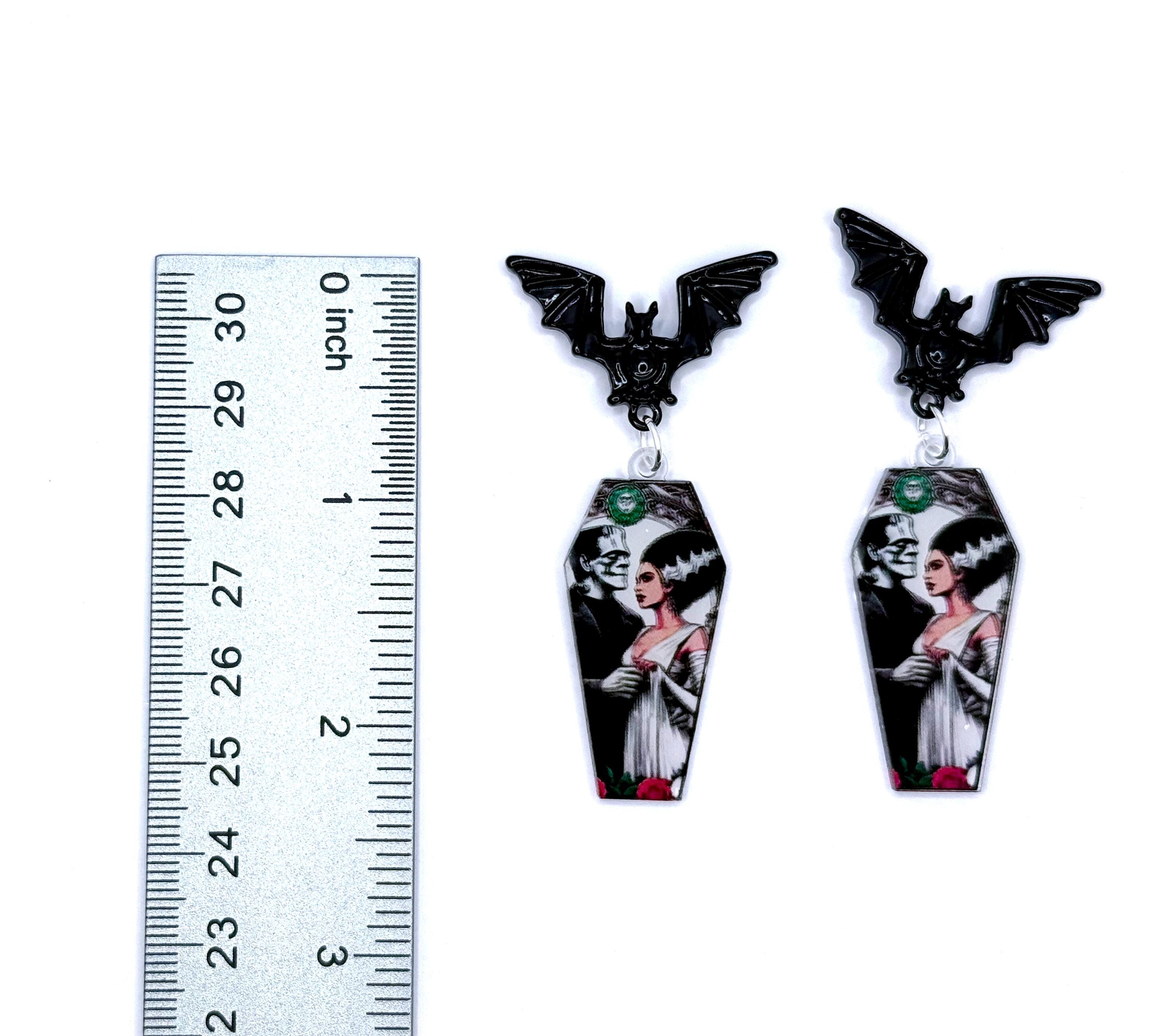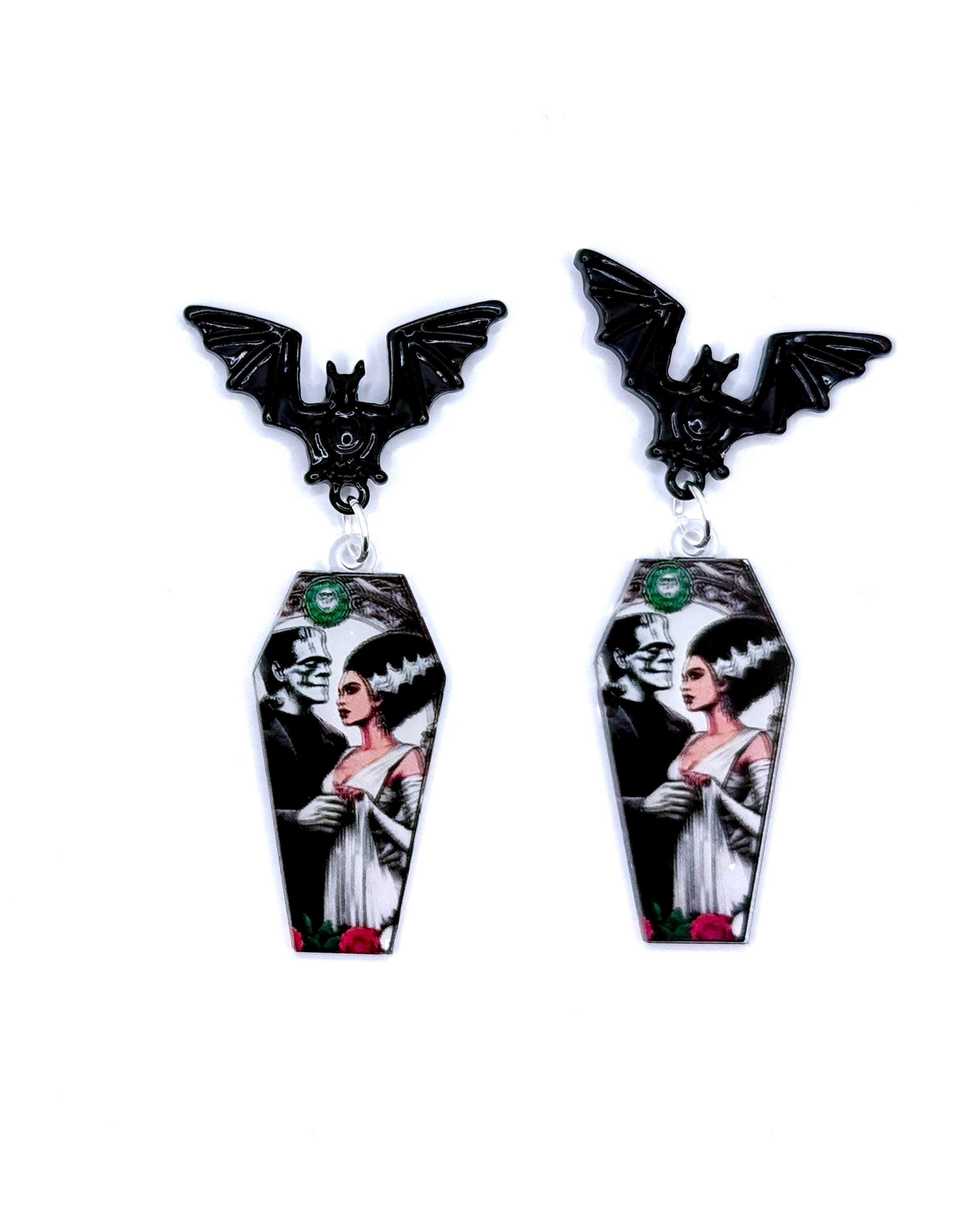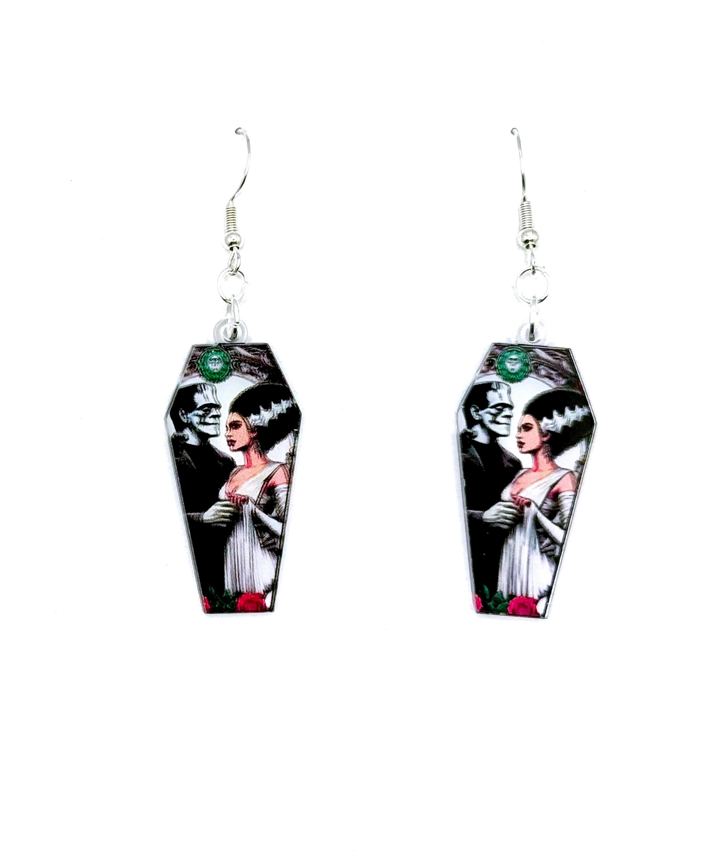 True love that’s to die for... literally. These hauntingly romantic coffin-shaped earrings feature a ghoulish bride and groom locked in a timeless embrace — perfect for spooky soulmates, gothic weddings, or horror movie marathons. Lightweight, bold, and oh-so-deadly chic.