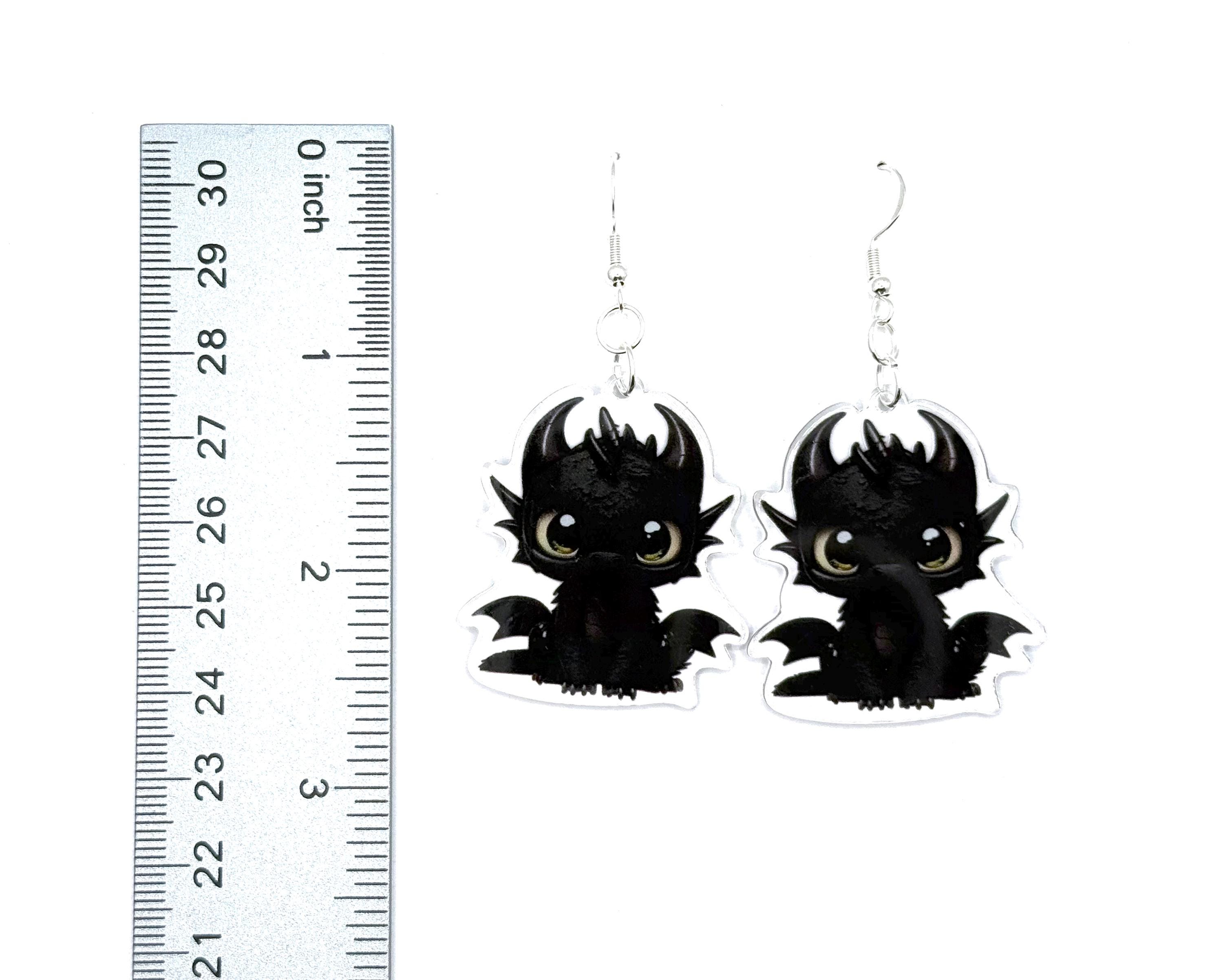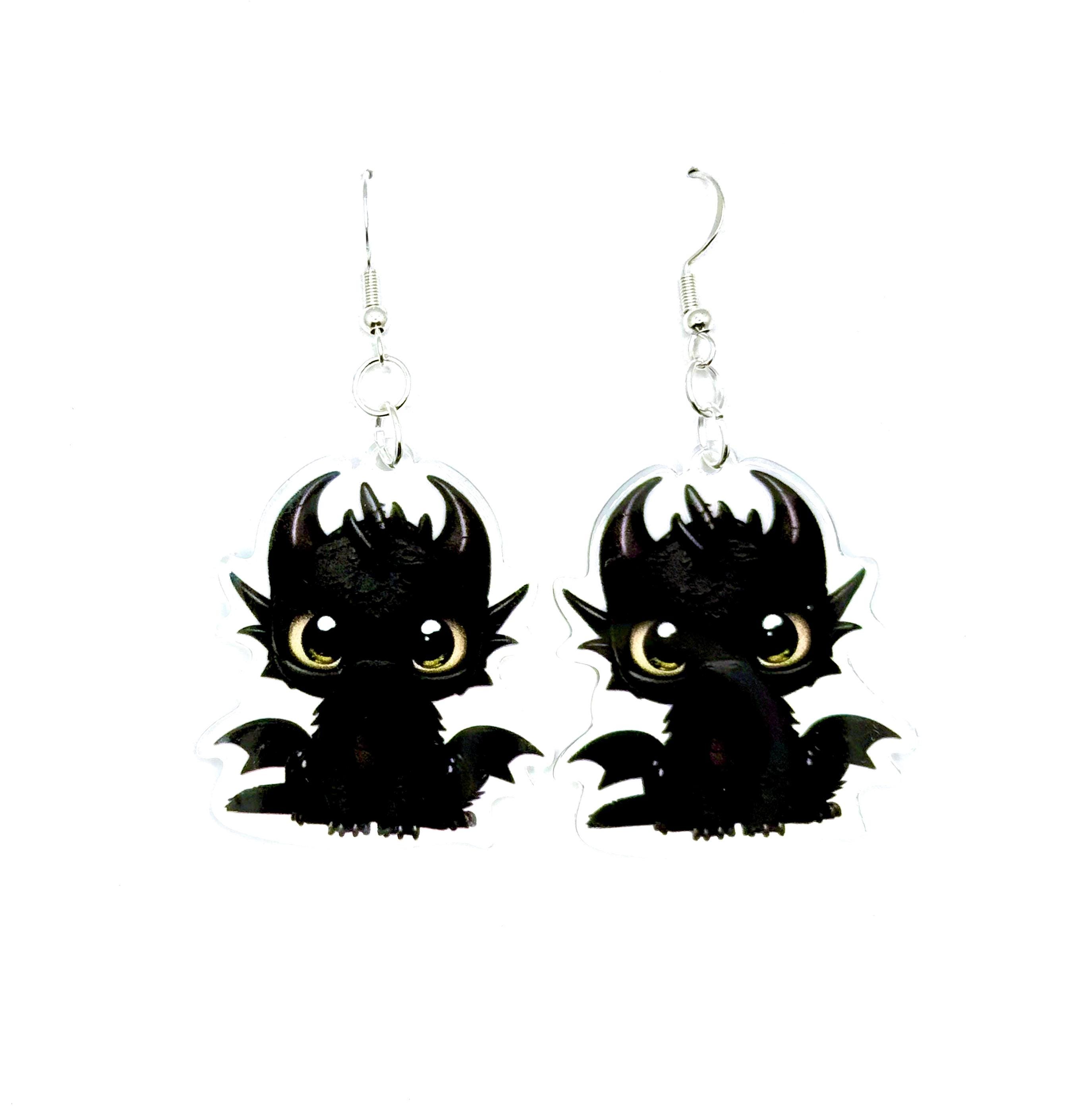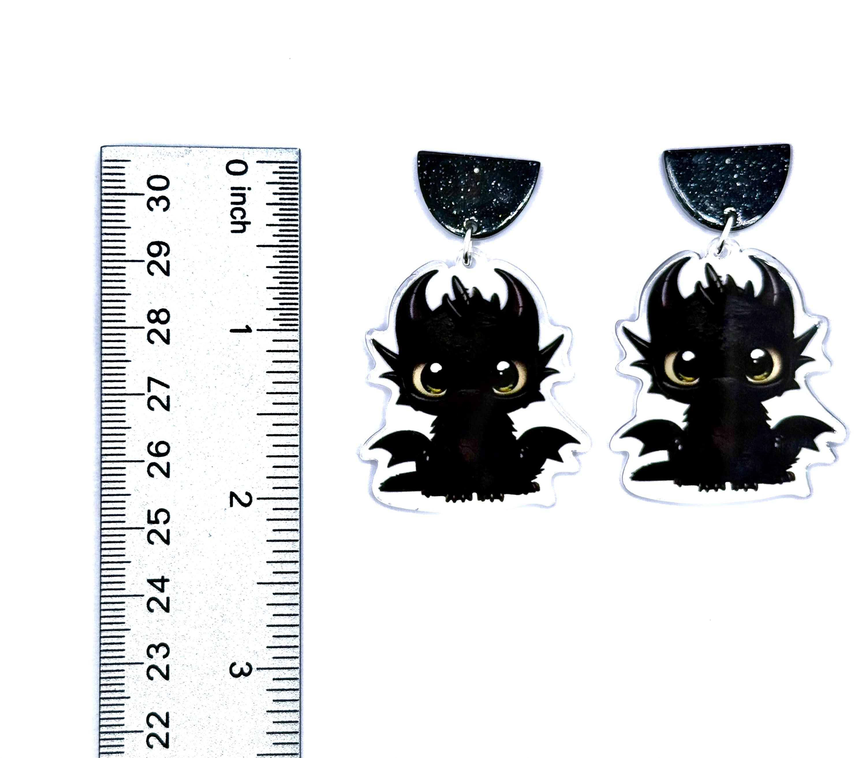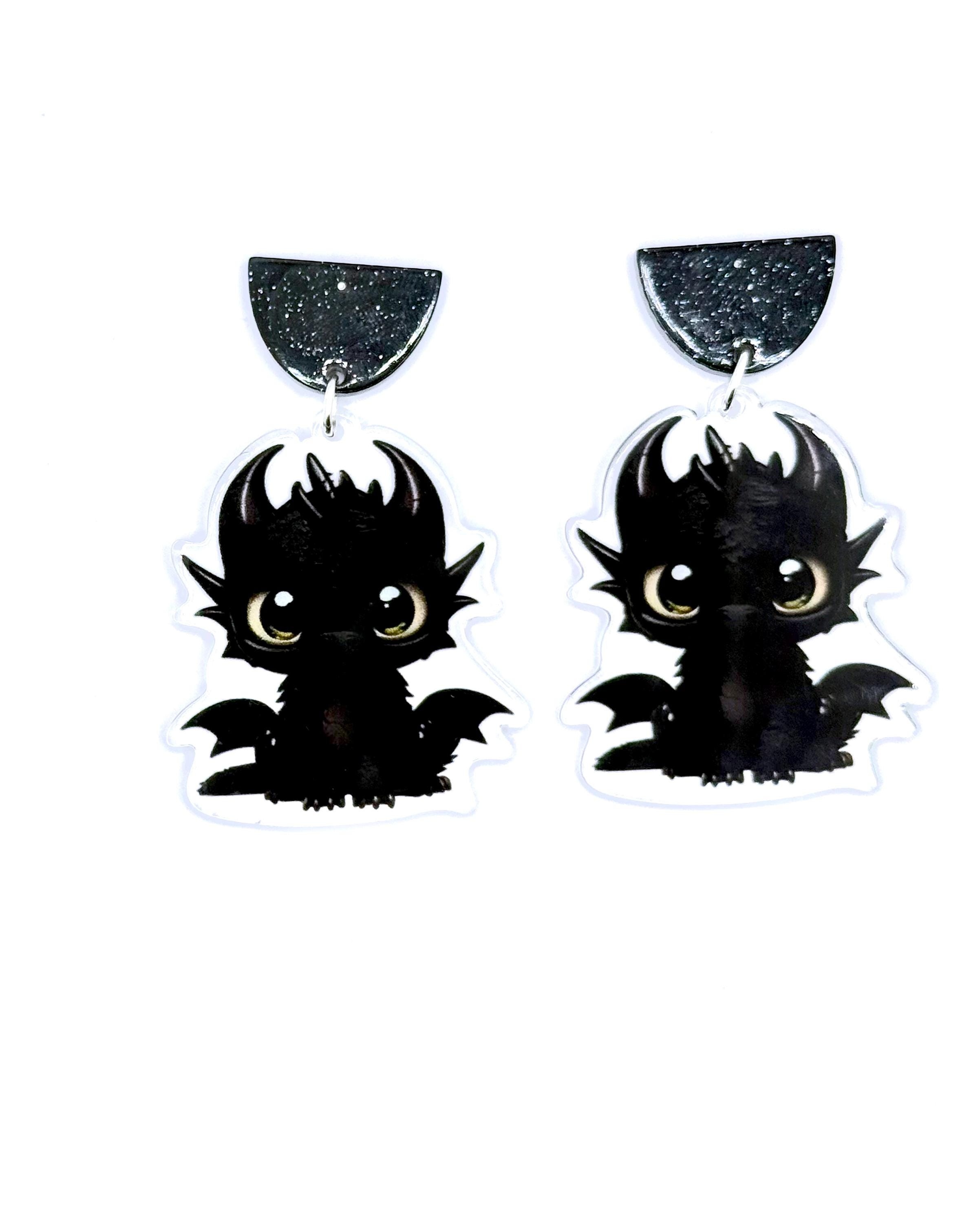 Meet your new fiery faves! These little black dragons are giving big cute energy with their wide eyes, tiny wings, and just a hint of sass. Perfect for park days, spooky fits, or any outfit that could use a little dark magic. Choose between nickel-free hooks or black glitter half-circle studs to match your mood.
