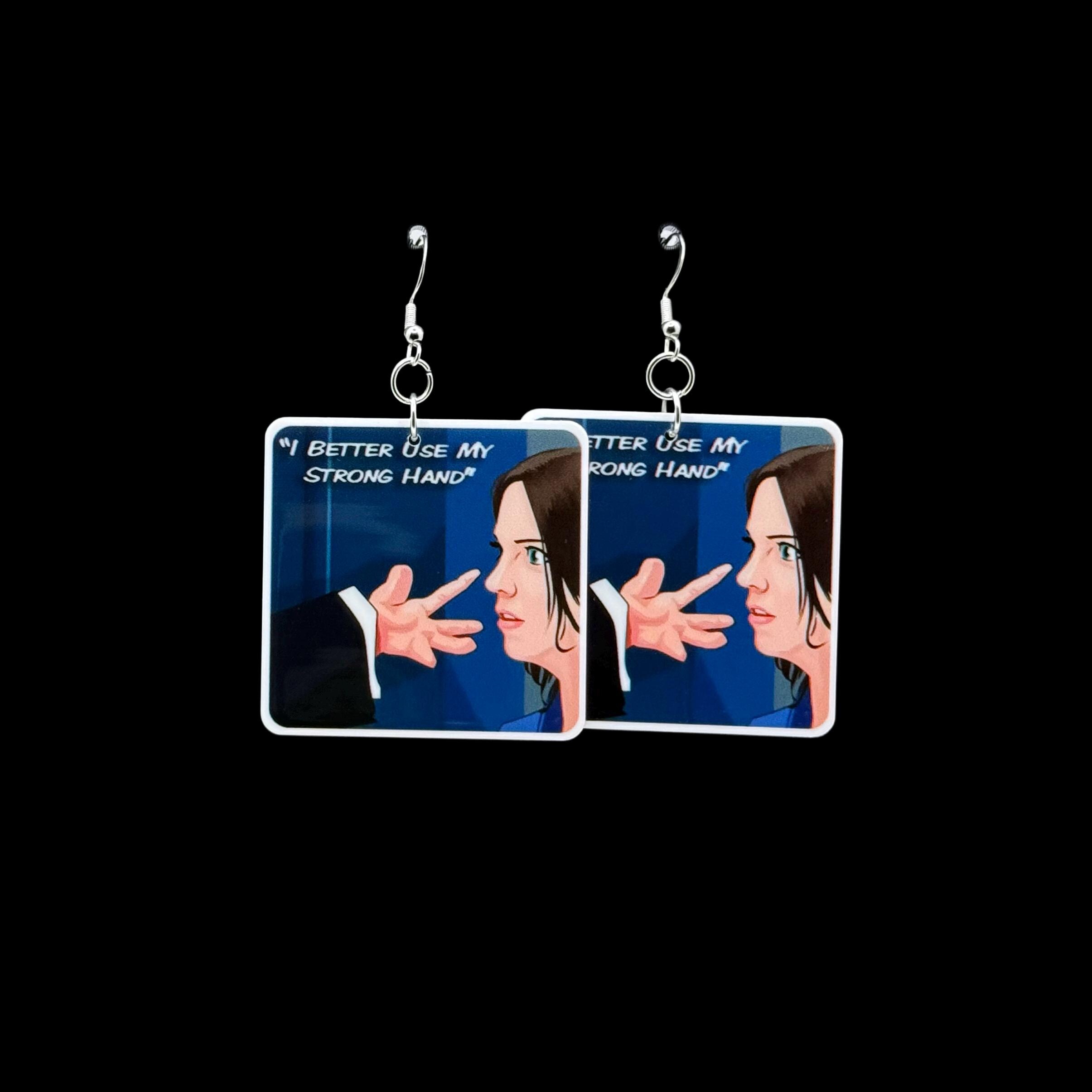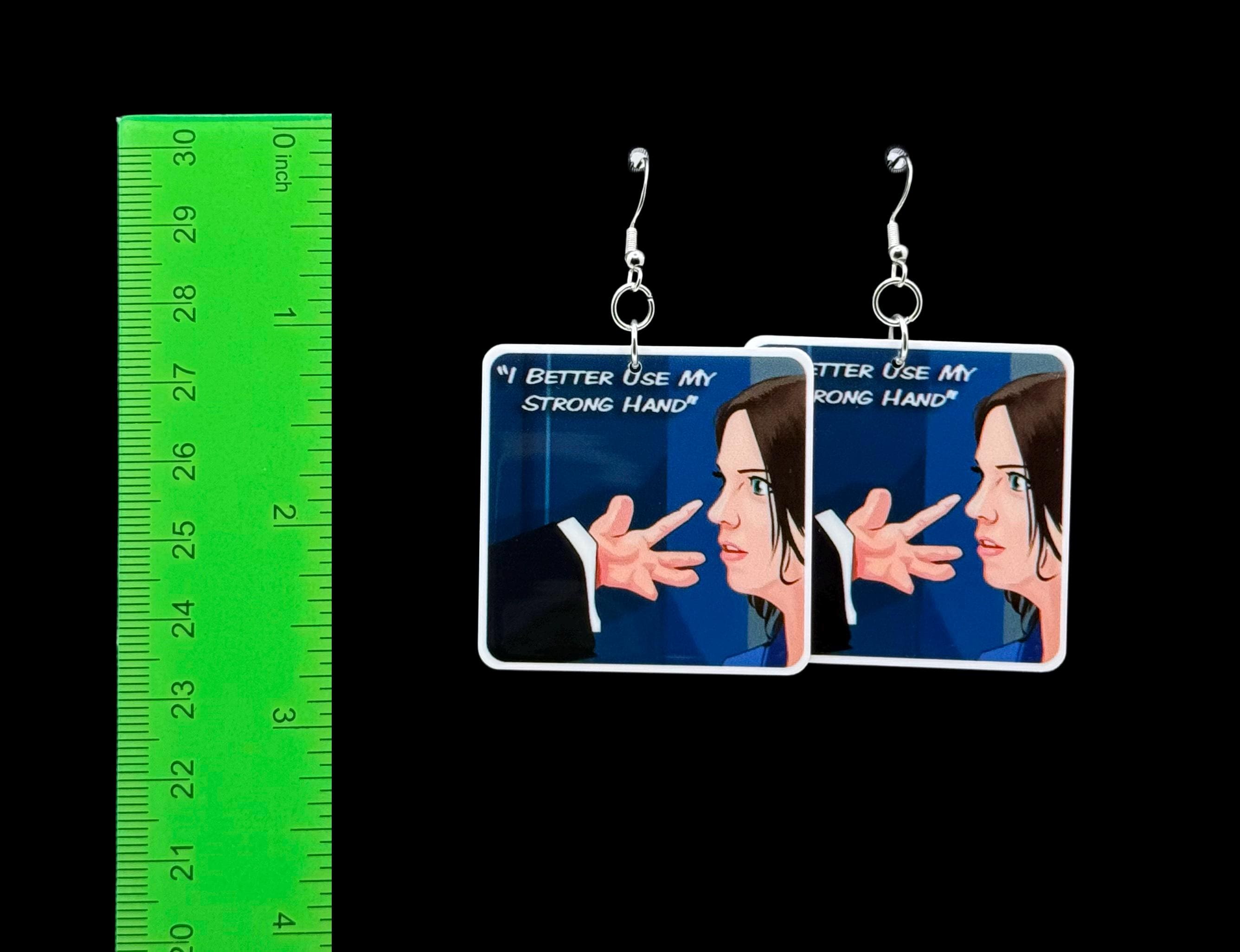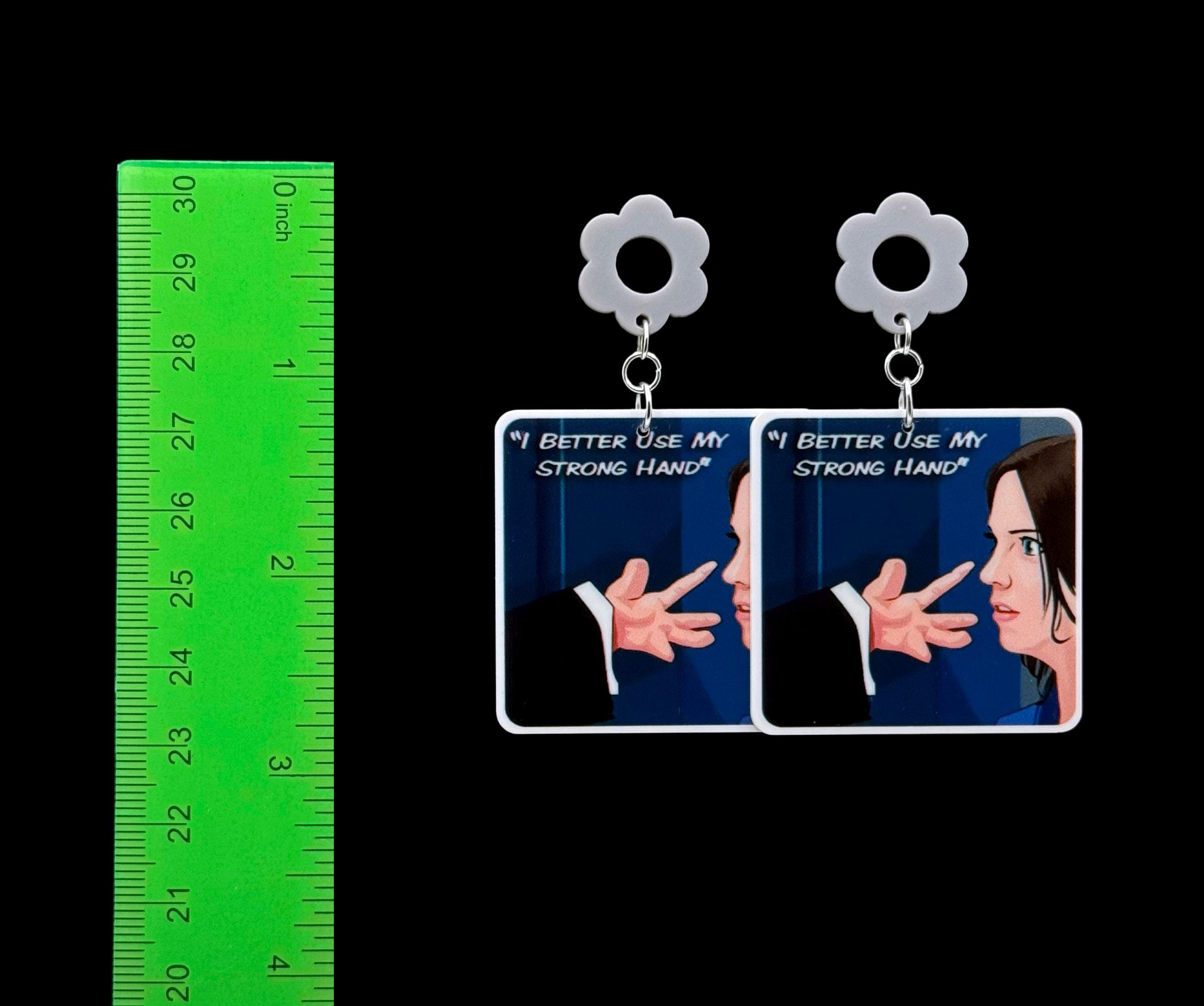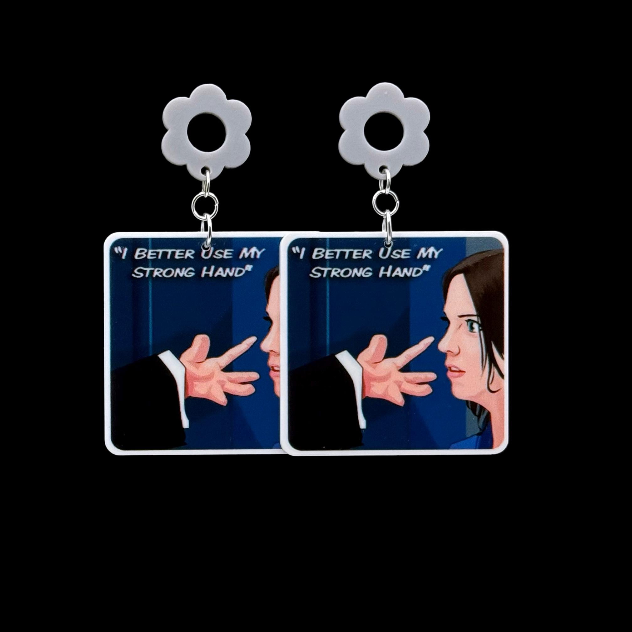 Give your style a hilariously spooky twist with these earrings inspired by a famously funny horror spoof scene! Featuring the iconic phrase "I better use my strong hand," these earrings are perfect for those who love to blend humor with a hint of horror nostalgia. Paired with charming grey flower studs, they're perfect for everyday wear or your next movie marathon.