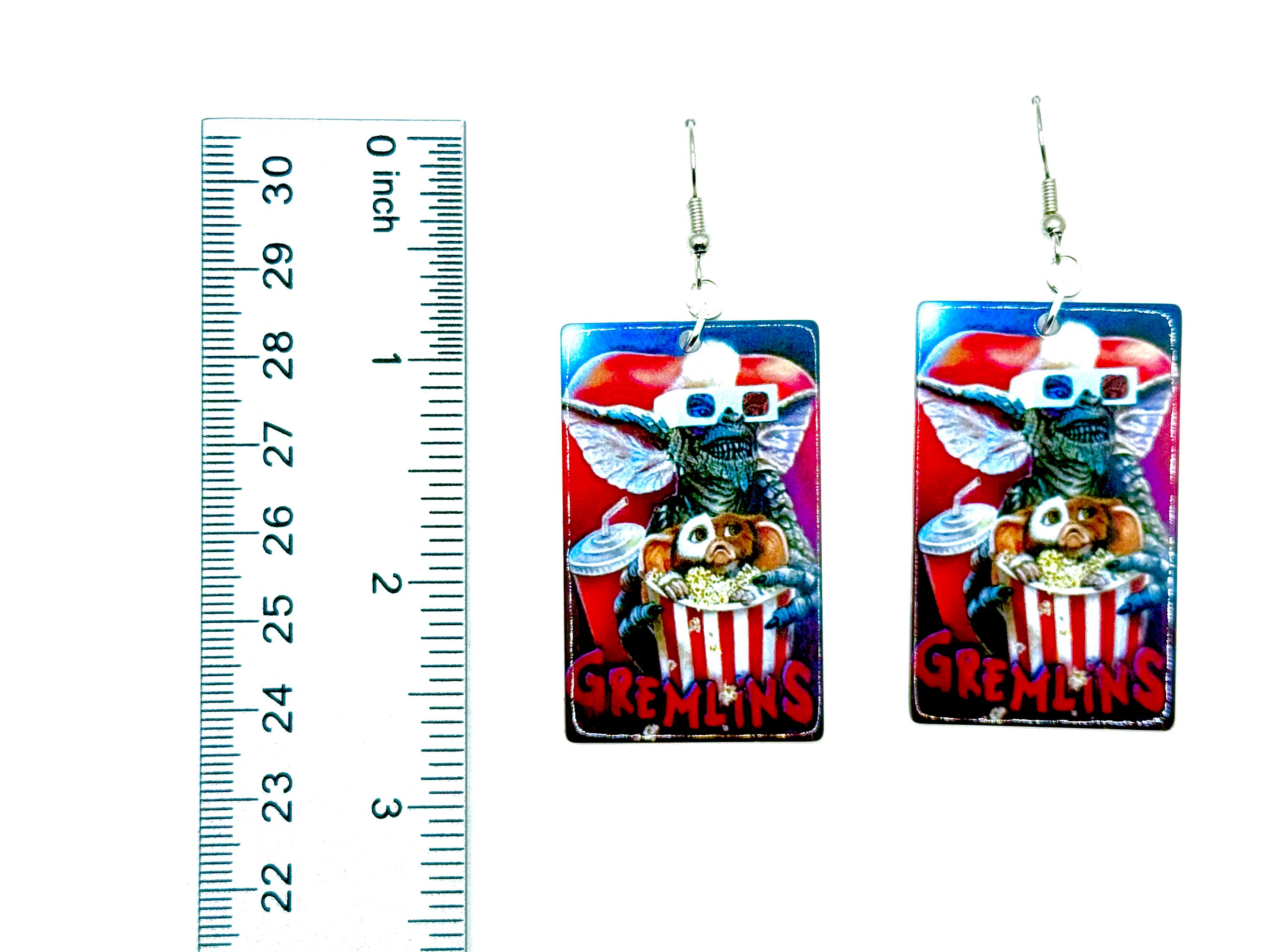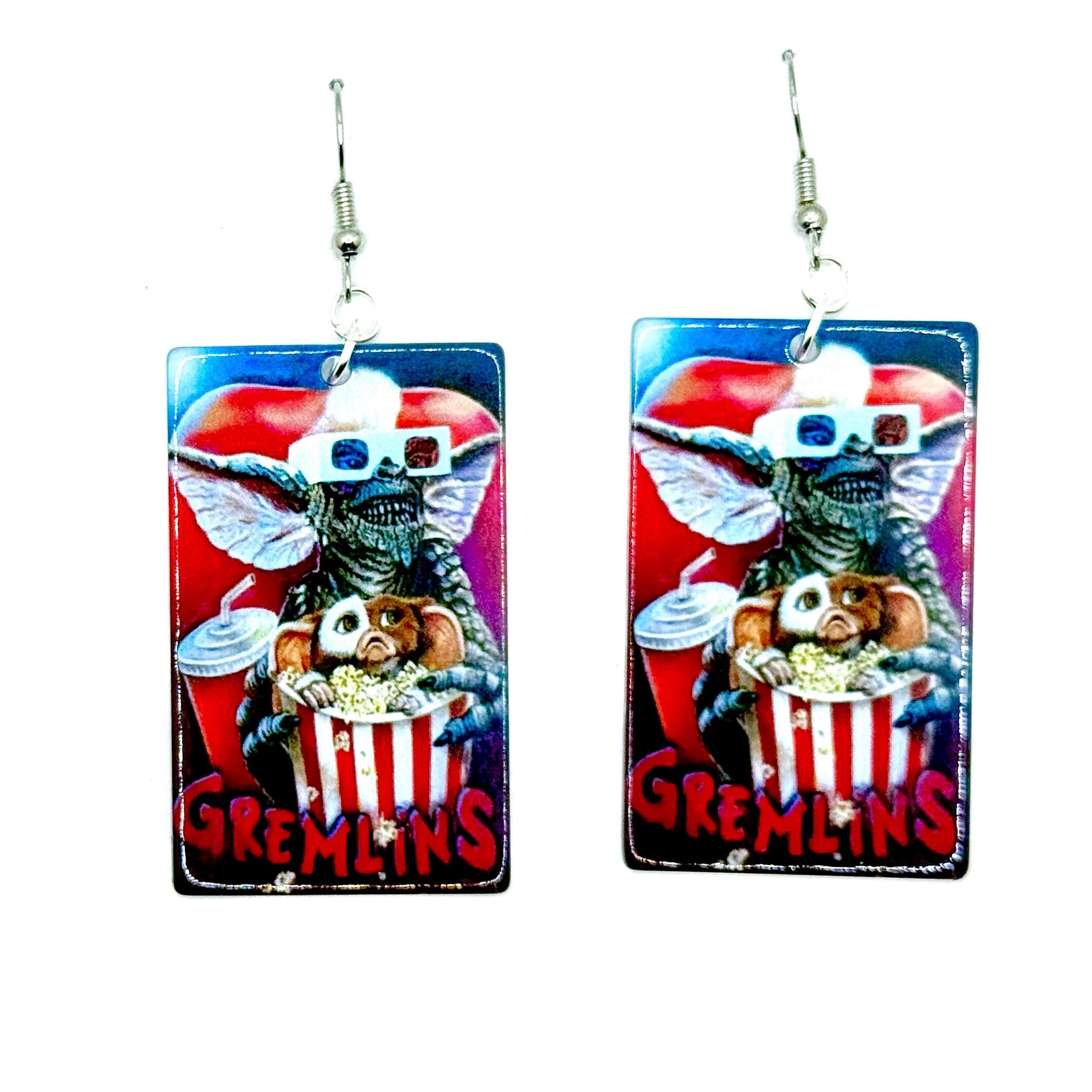It’s movie night—creature-style! These retro horror-inspired earrings feature a mischievous little monster and his wide-eyed furry sidekick enjoying snacks at the cinema. Packed with bold colors, nostalgia, and a dash of chaos, they’re the ultimate statement earrings for lovers of cult classics and 80s monster madness. Complete with classic nickel-free hooks for easy everyday wear.