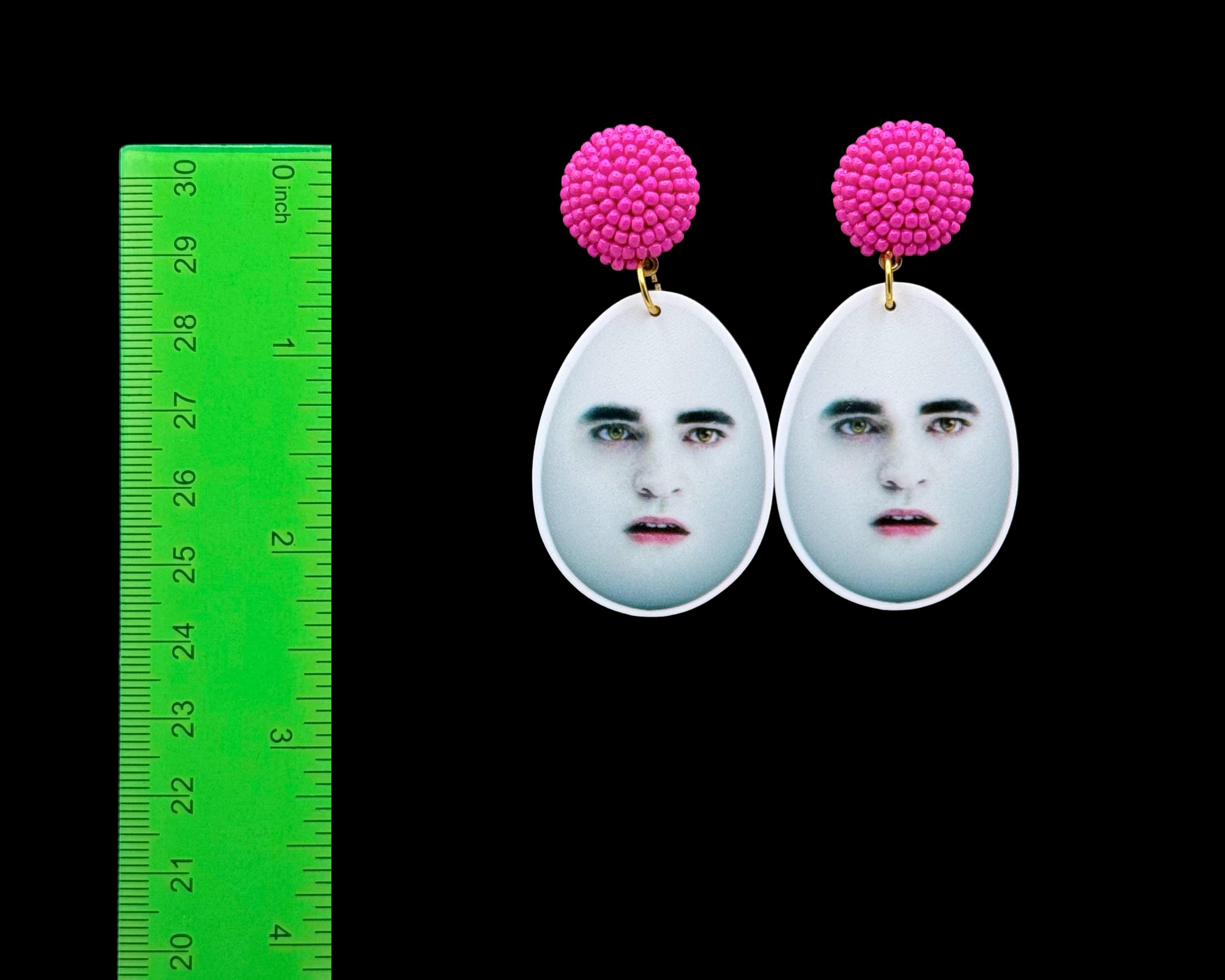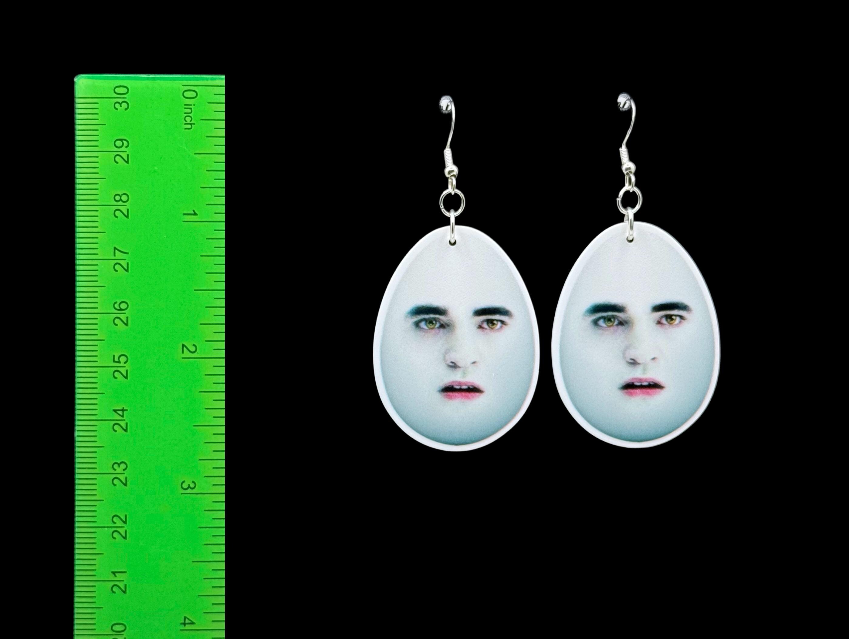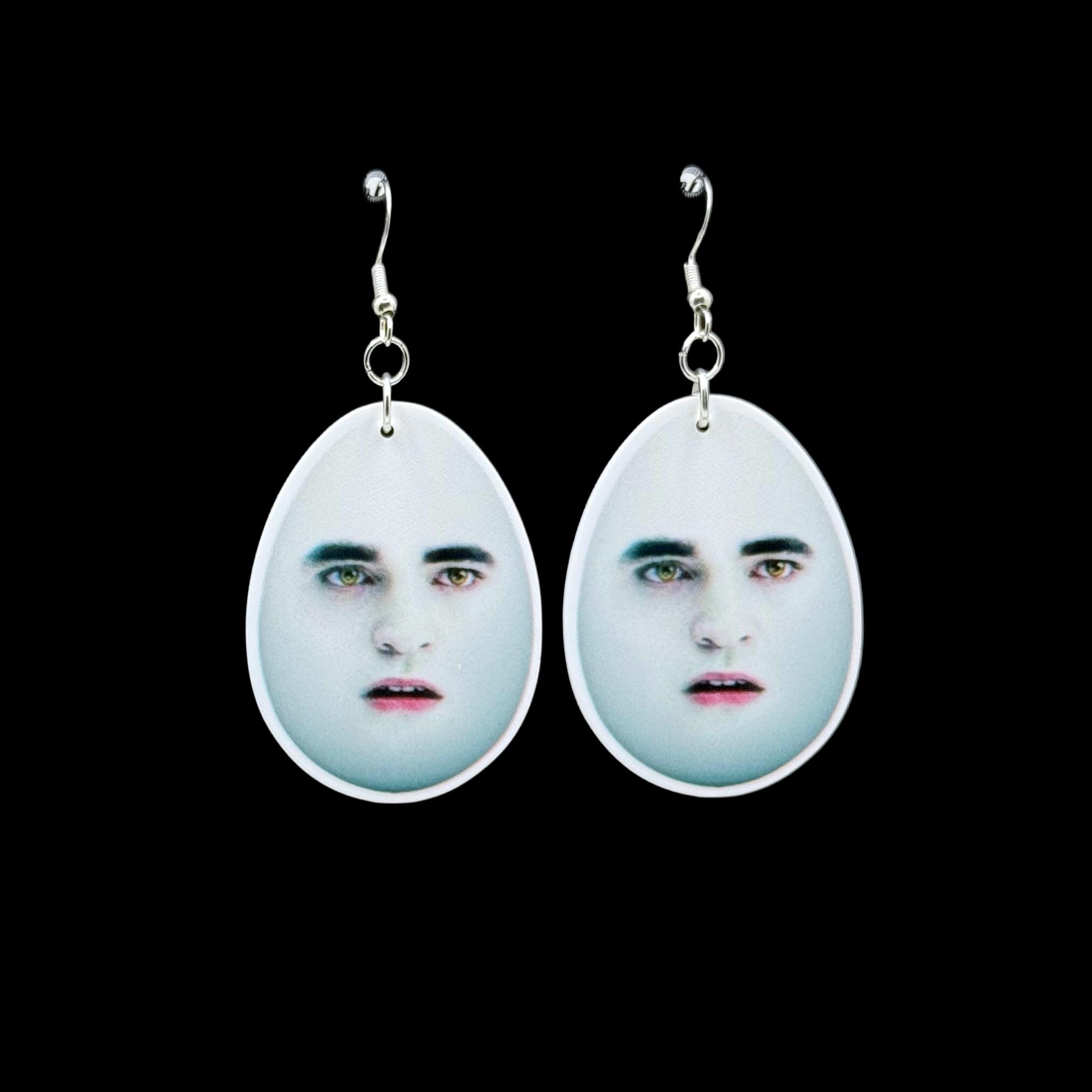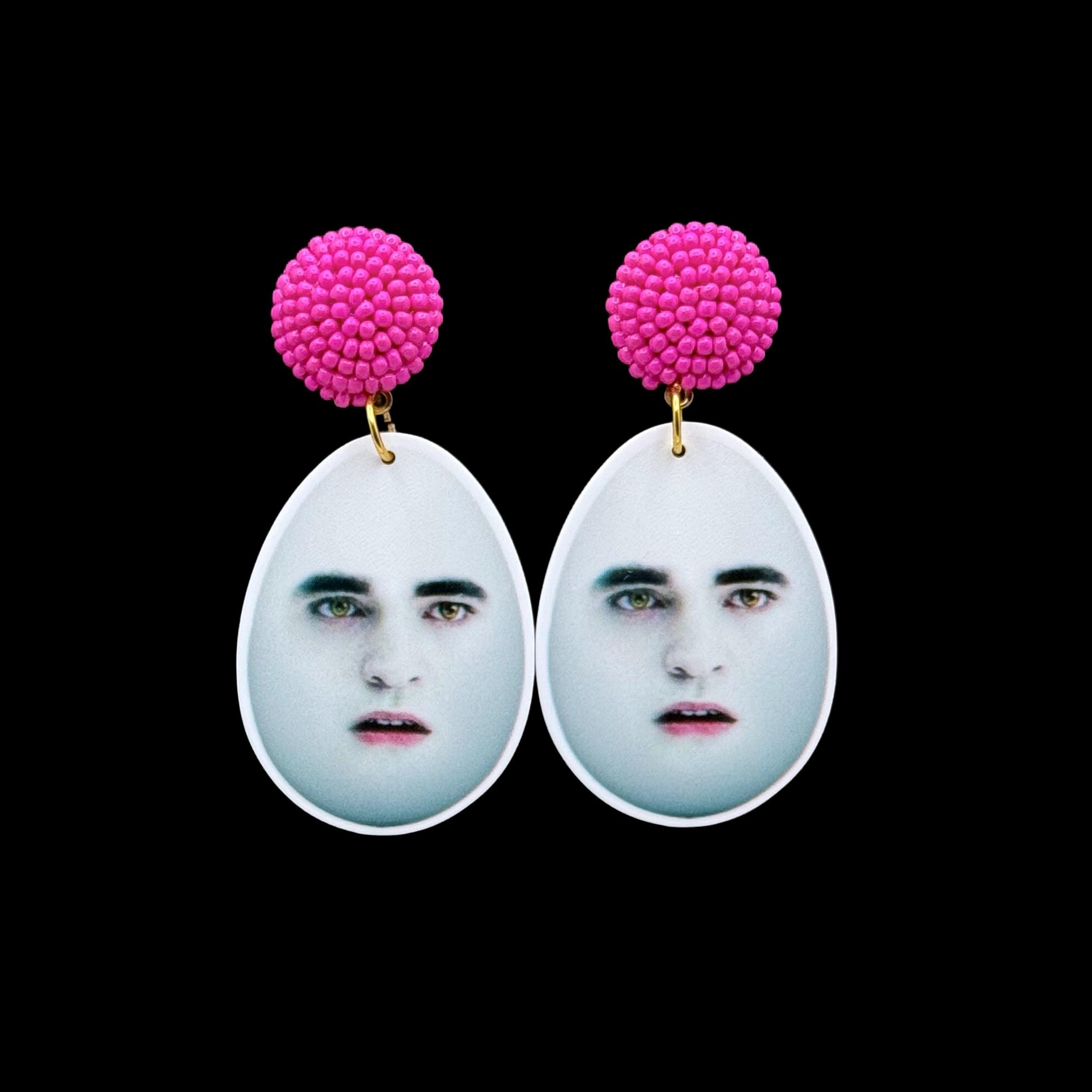 These earrings are equal parts haunting and hilarious—just like your late-night Google searches. Featuring the pale, brooding face of everyone's favorite sparkle-boi in full egg form, these are truly for the unhinged pop culture girlies who like their accessories with a side of chaos. Choose between bold pink beaded studs or classic hooks—either way, you’ll be turning heads (and cracking eggs).