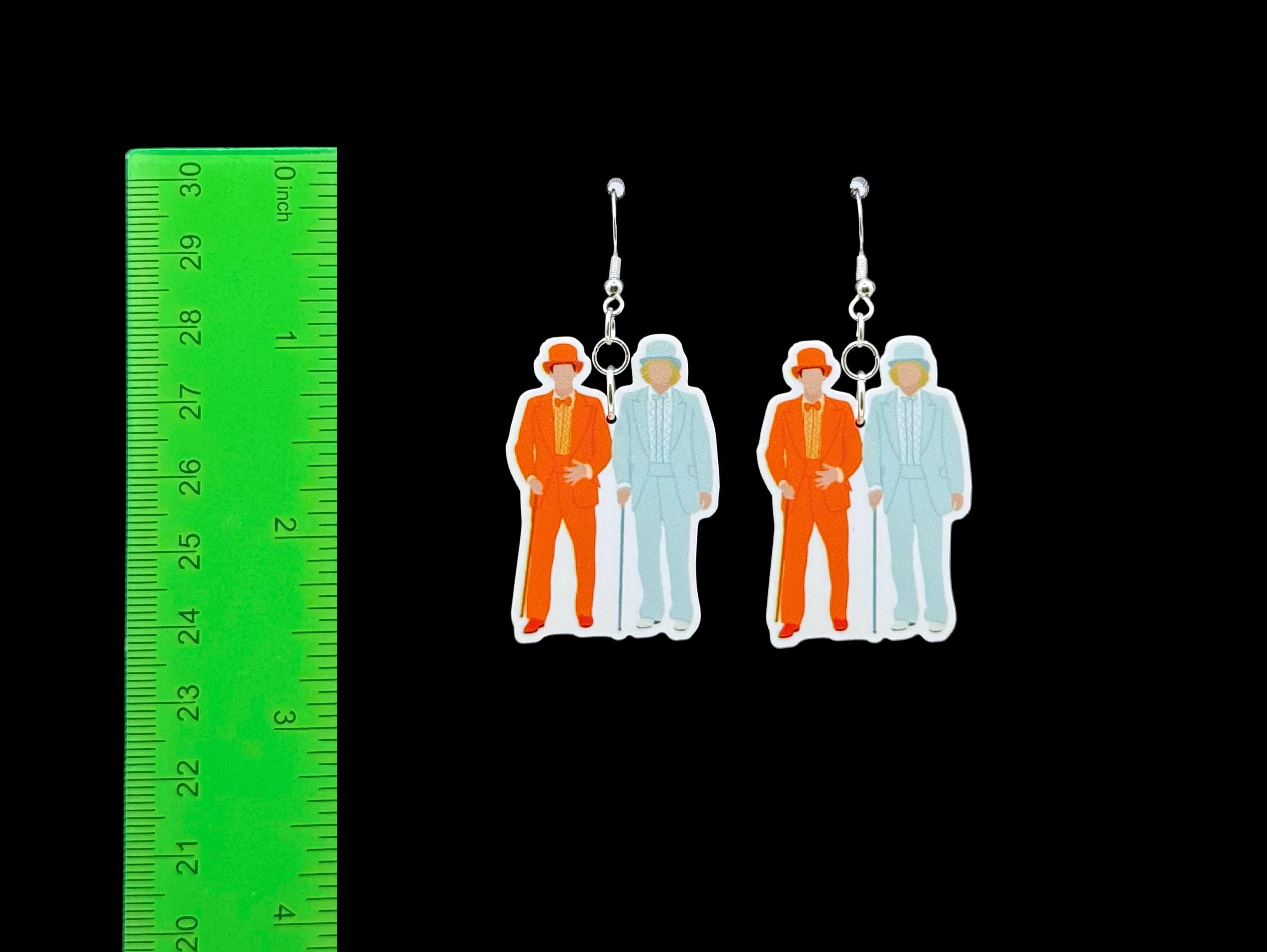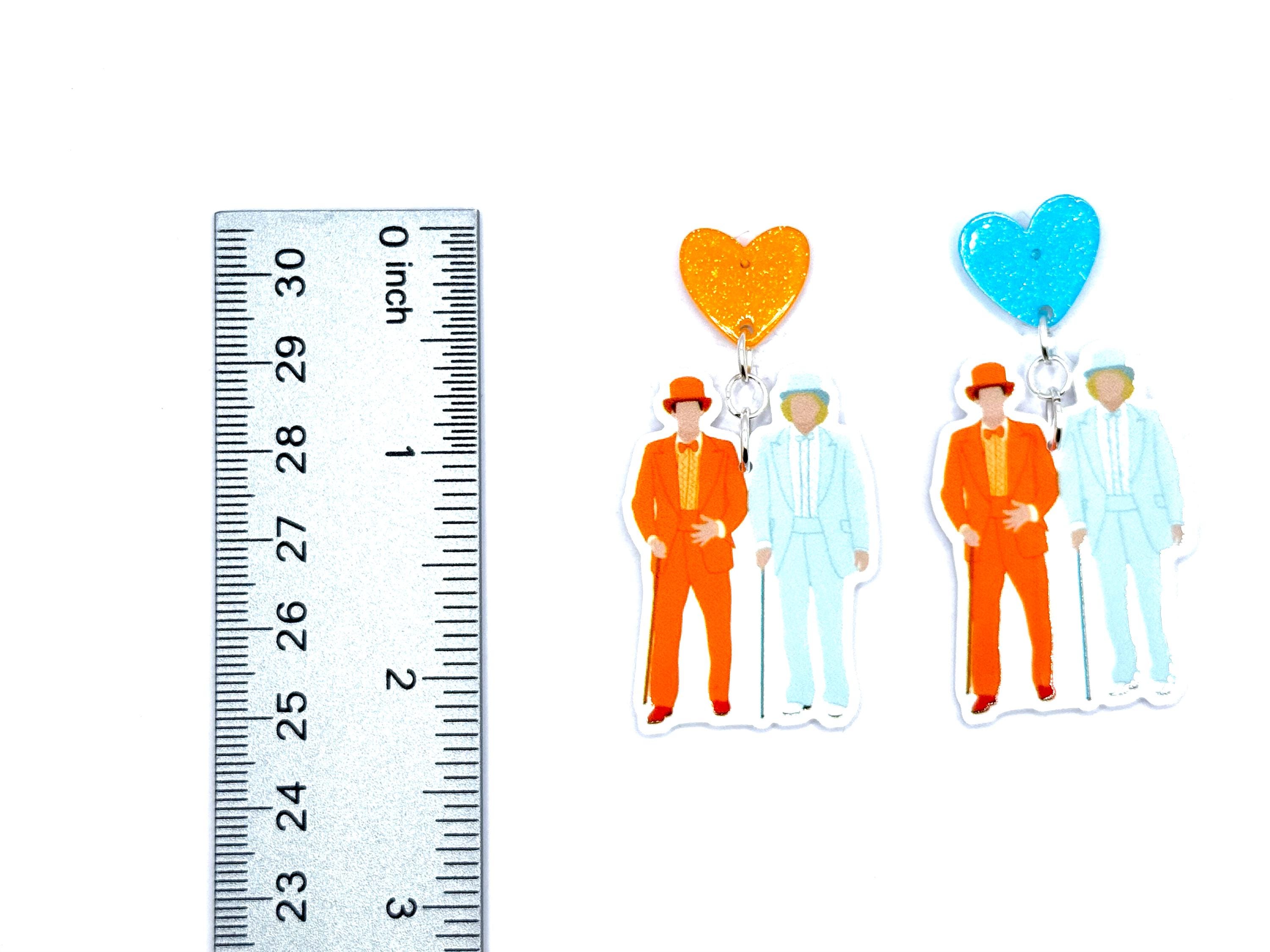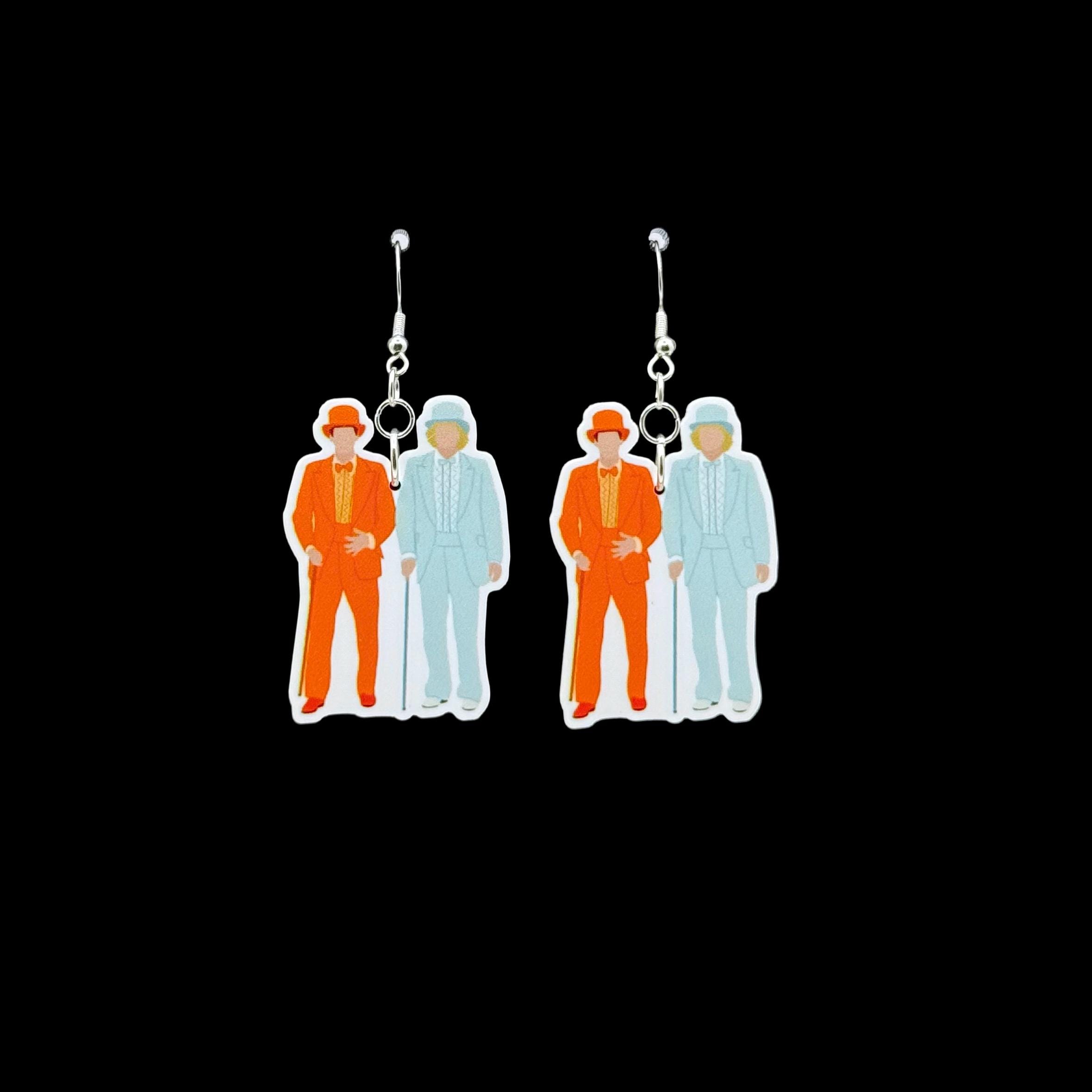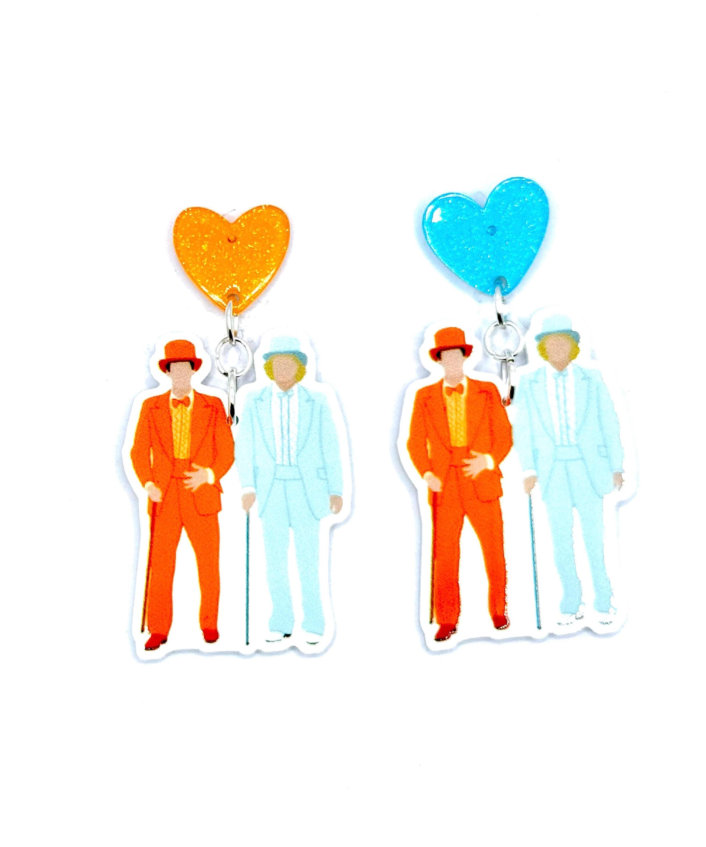 Ready to get fancy in the most ridiculous way possible? These earrings feature two unmistakably iconic tuxes—one orange, one powder blue—worn by a pair of head-turning goofballs from a certain 90s buddy movie you probably quoted in middle school. Finished with glitter heart studs in matching colors, these earrings are a nostalgic riot and perfect for any comedy fan who likes their fashion bold and their references subtle.