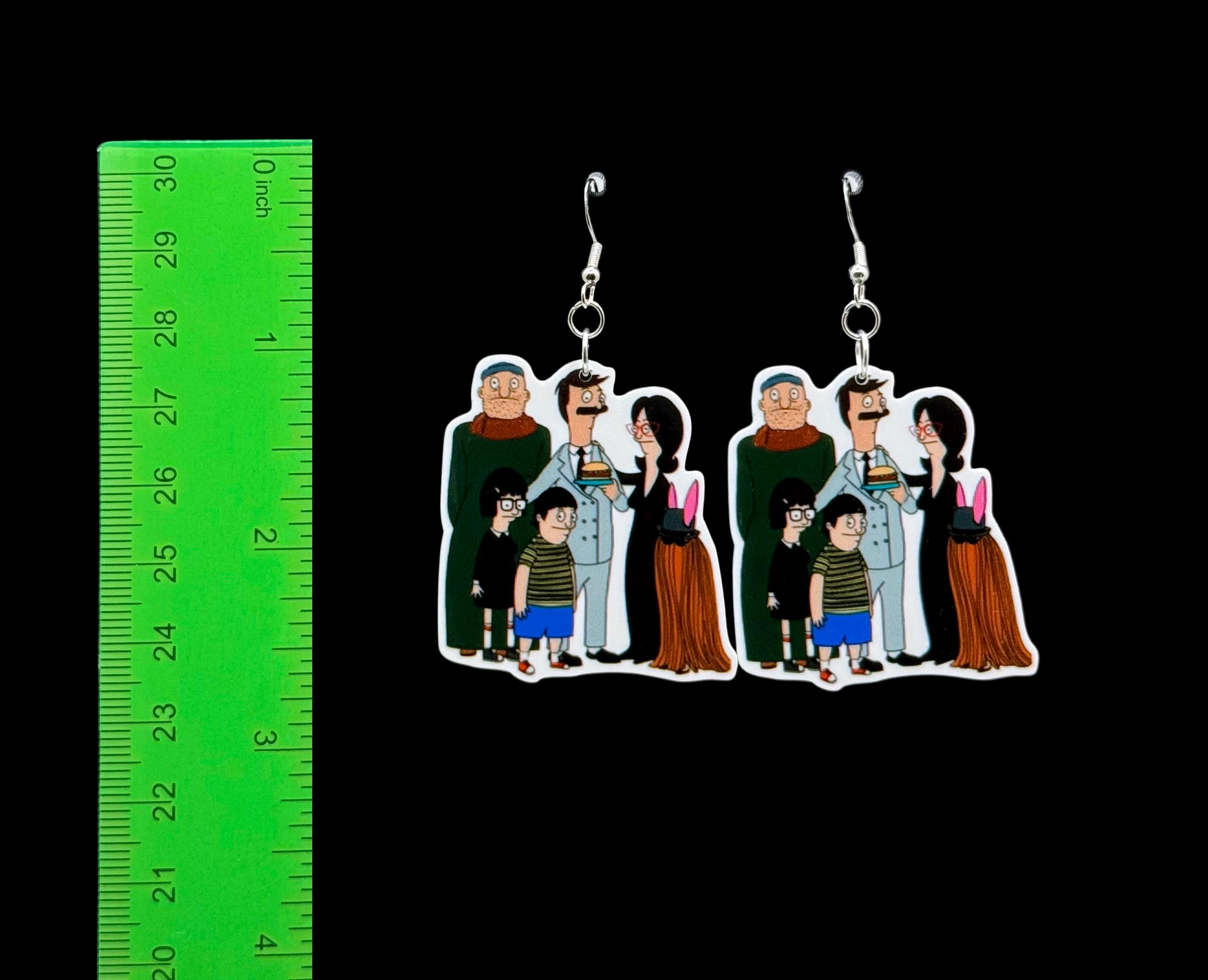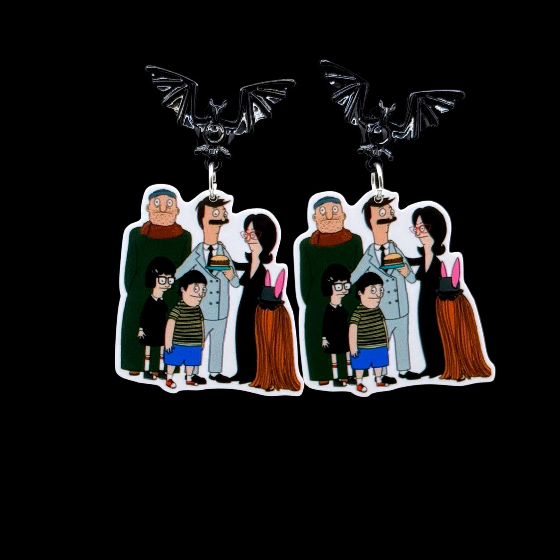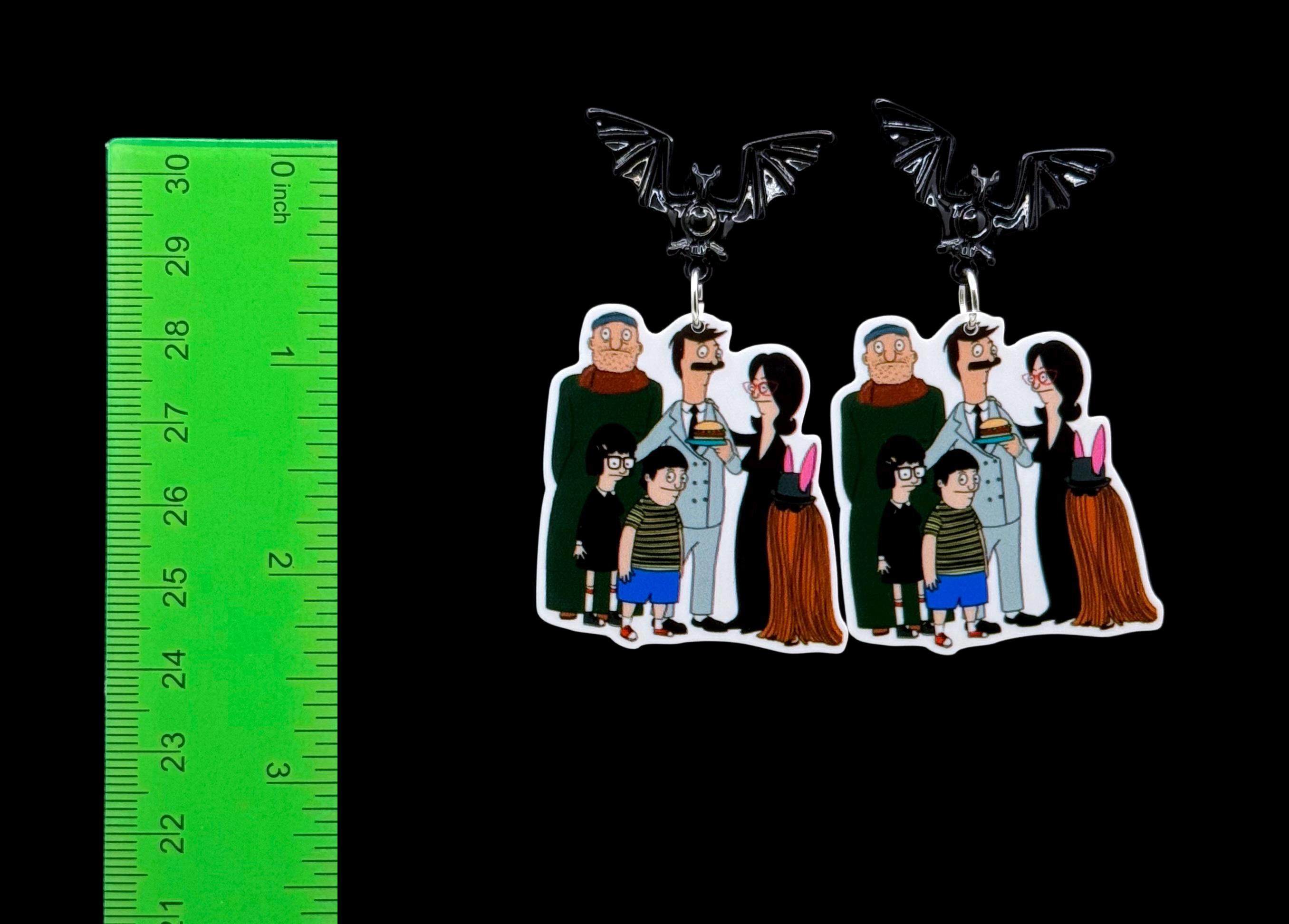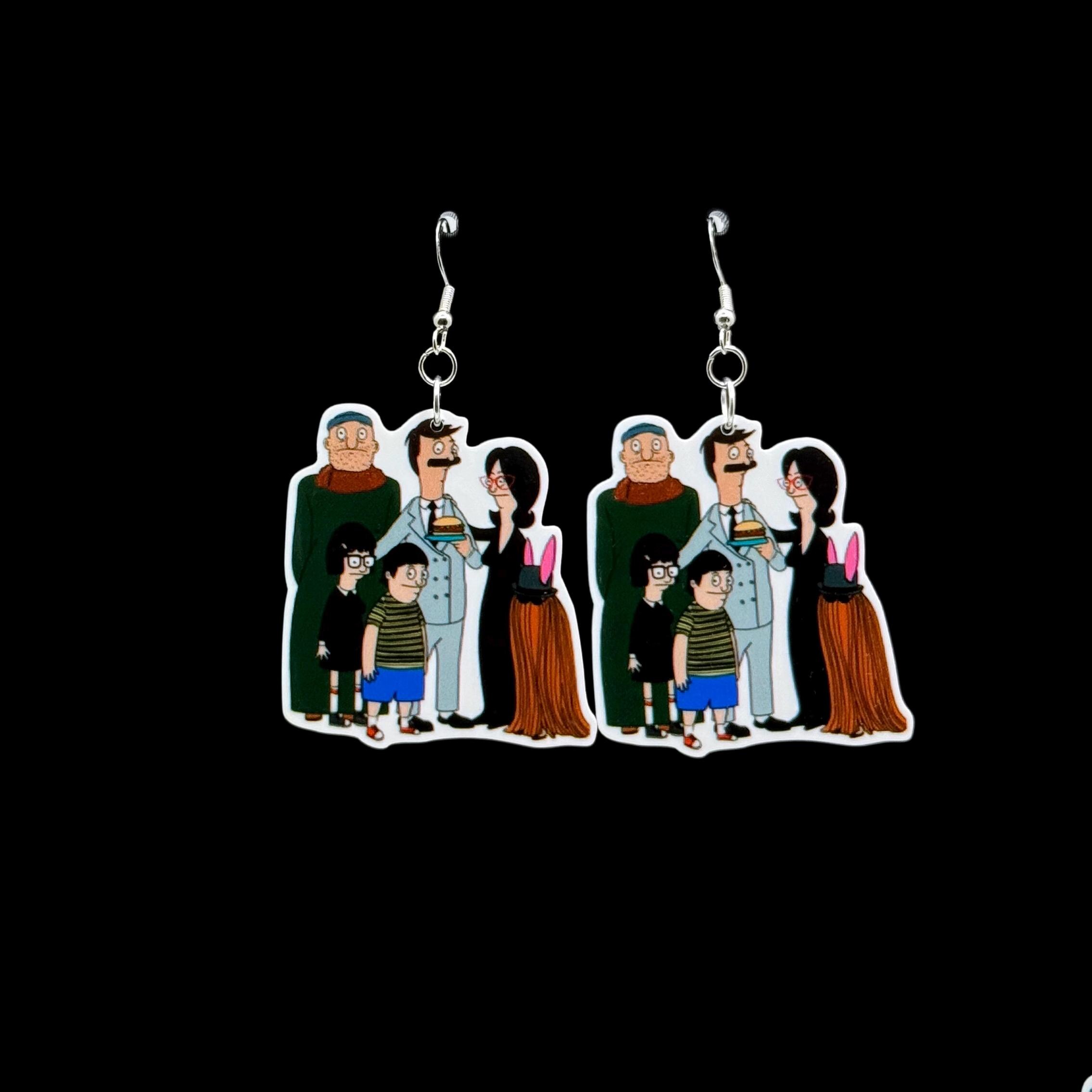 Sink your teeth into nostalgia without naming names—these acrylic earrings feature a whimsical family of burger-flipping parents and their quirky kids (including a bunny-eared troublemaker) hanging from a bat-shaped stud. Perfect for cartoon binge sessions, late-night cookouts, or just adding a playful twist to your everyday look, they’re lightweight, durable, and guaranteed to get curious glances.
