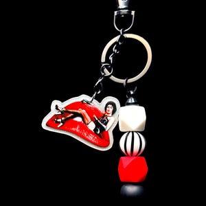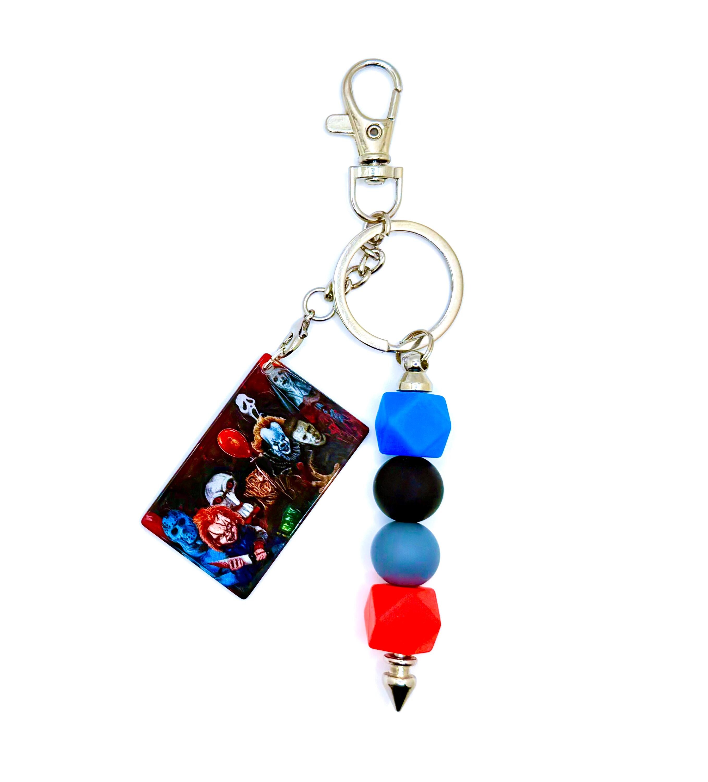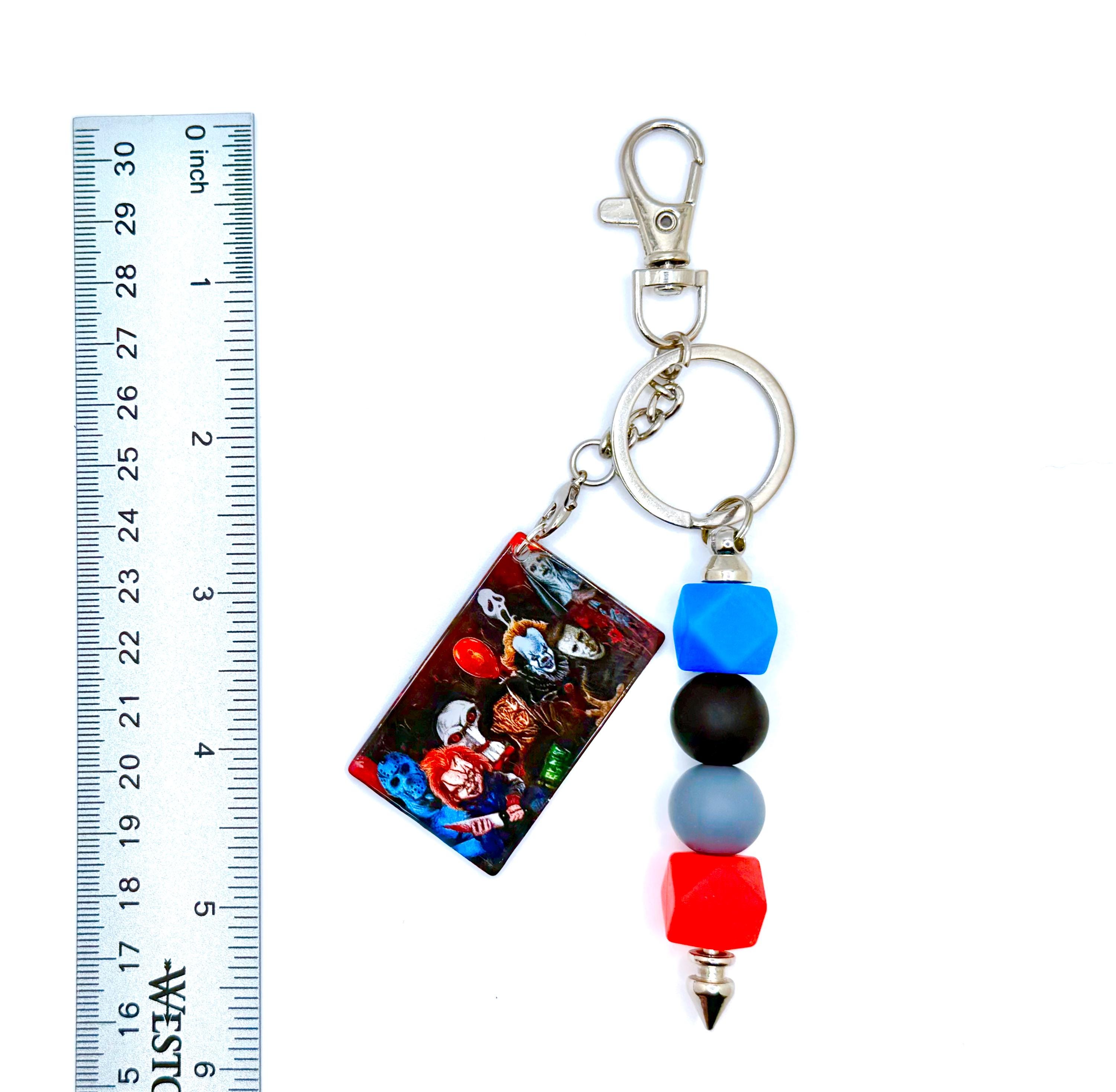 Unleash a carnival of creeping nostalgia wherever you go, with this acrylic charm showcasing a mashup of iconic horror figures—think a popcorn-munching critter in 3D glasses, a balloon-wielding clown, a masked slasher, a chainsaw-wielding maniac, and other spine-chilling faces—all rendered in vibrant full color. Dangling alongside is a pastel-and-onyx stack of silicone beads—sky-blue hexagon, matte black sphere, steel-blue sphere, and blood-red hexagon—topped with a silver-tone spike for extra edge. Clip it onto your keys, backpack, or purse to carry a gallery of horror-show legends wherever you roam.