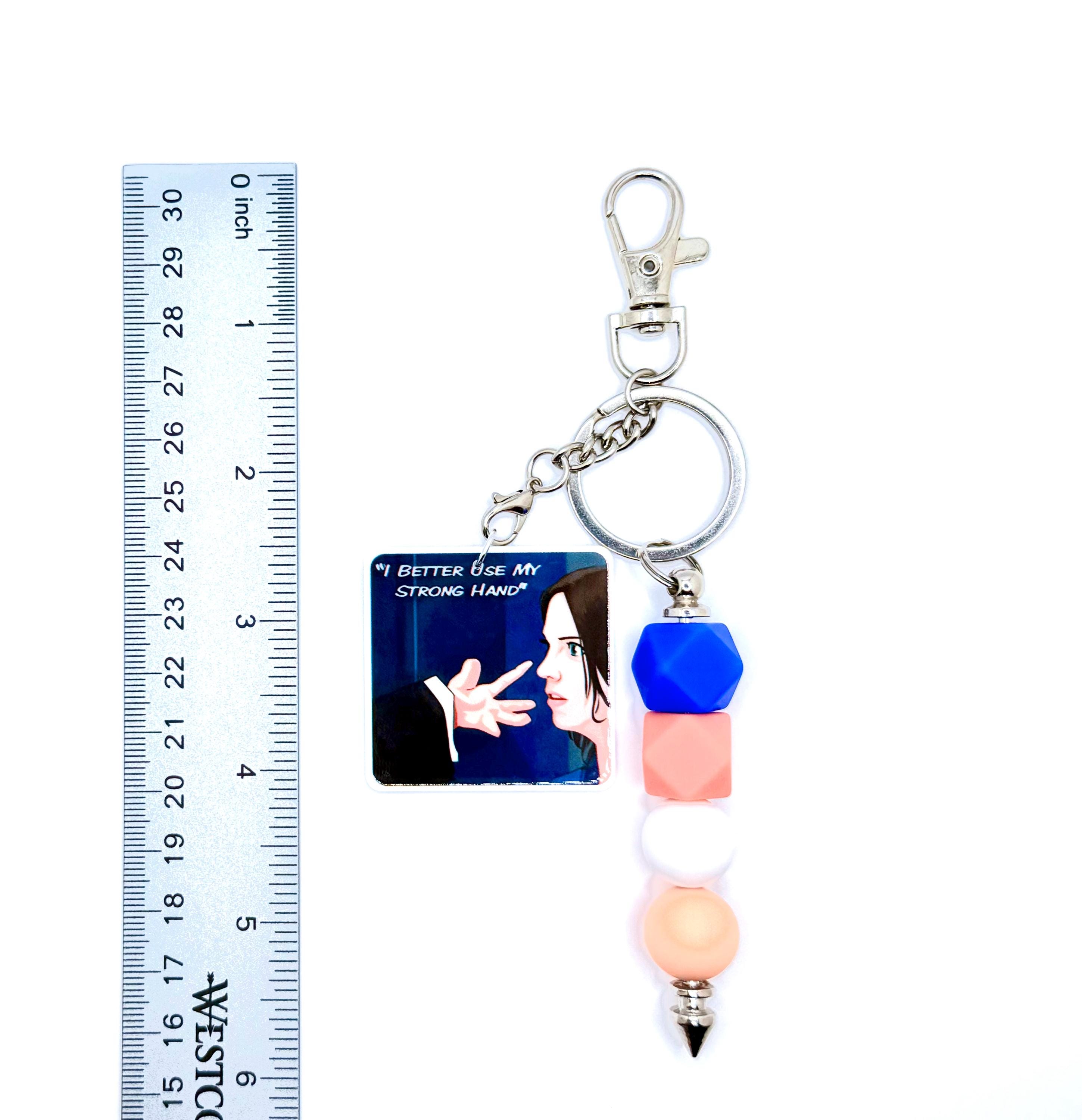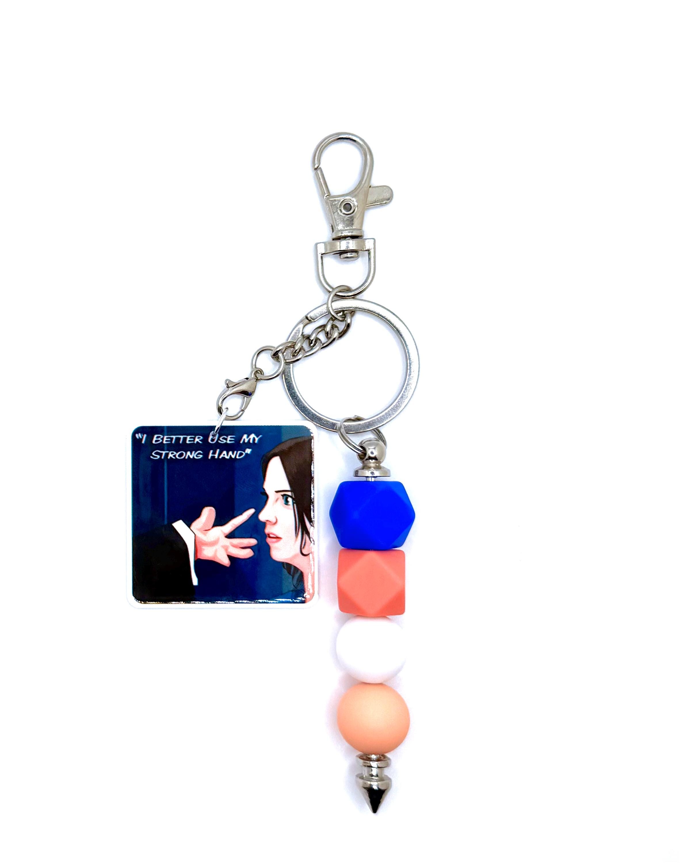 Ready to broadcast your inner strength (and wicked sense of humor) without naming the source? This acrylic charm features a confident hand reaching toward a determined face with the bold phrase “I Better Use My Strong Hand” overhead—perfect for anyone who loves a cheeky nod to cinematic one-liners. Paired with a vibrant stack of silicone beads in royal blue, coral pink, pure white, and soft peach, all anchored on a sleek silver-tone spike, this keychain adds a pop of color and attitude to keys, backpacks, or purses. Clip it on, flex your style, and let everyone know you mean business.