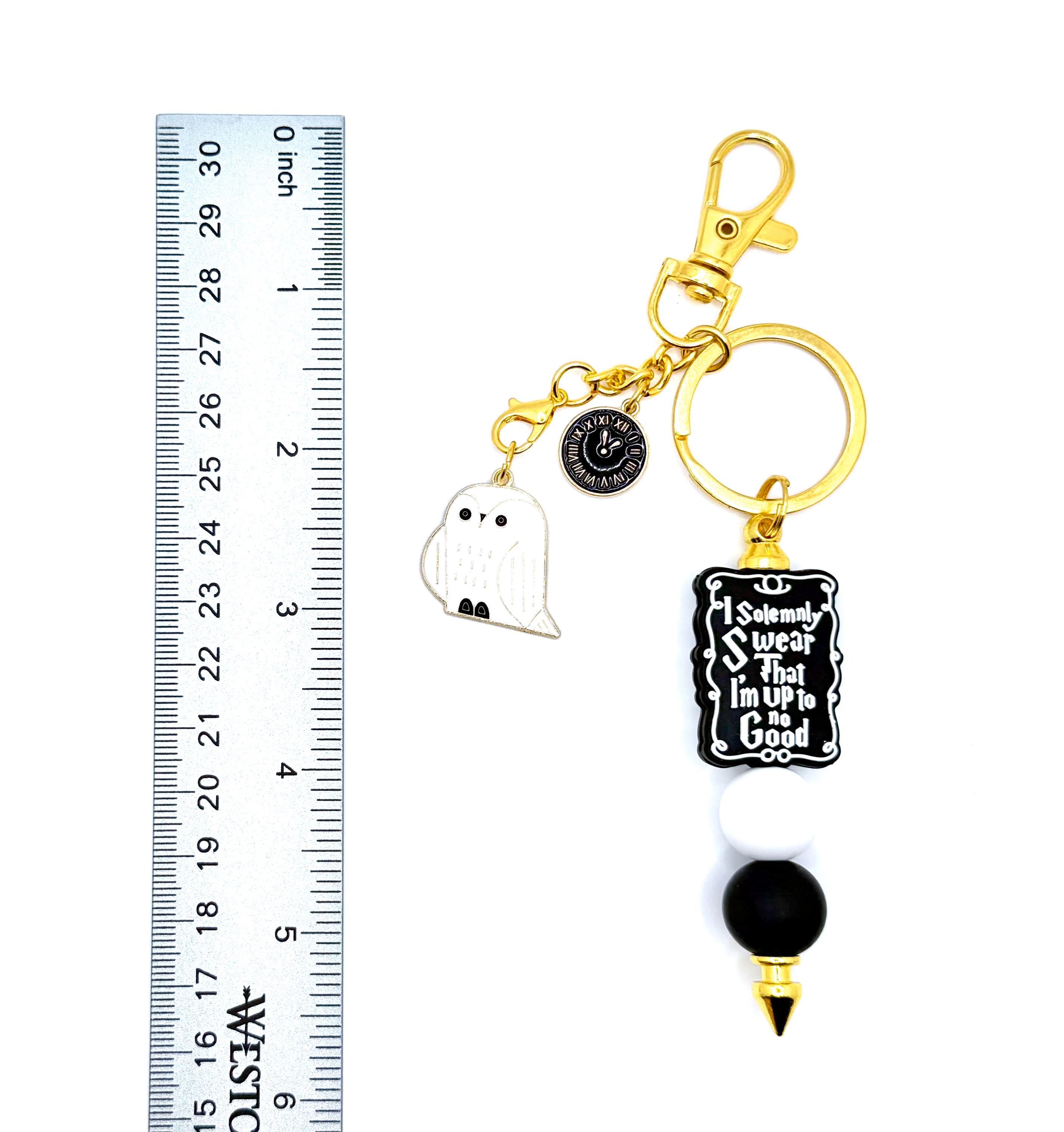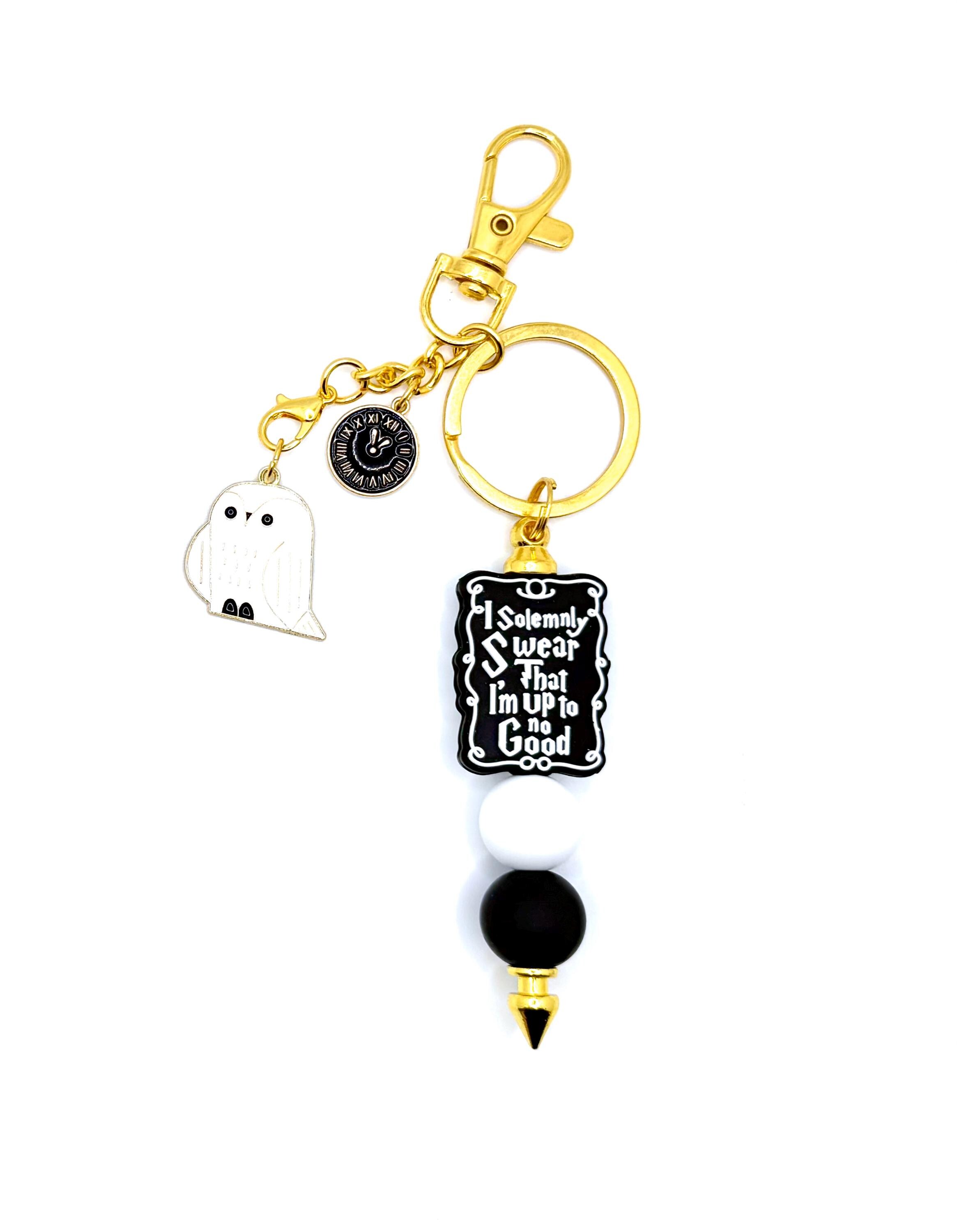 Ready for a little mischief? This gleaming gold‐tone keychain features a bold “I Solemnly Swear That I’m Up to No Good” silicone bead, accompanied by a tiny clock‐face token and a minimalist white owl silhouette (perfect for late‐night deliveries). Strung with matte white and onyx black silicone beads on a gold spiked post, it’s the ultimate accessory for anyone who likes their style a bit… sneaky. Attach it to your keys, bag, or lanyard and let the adventures begin.