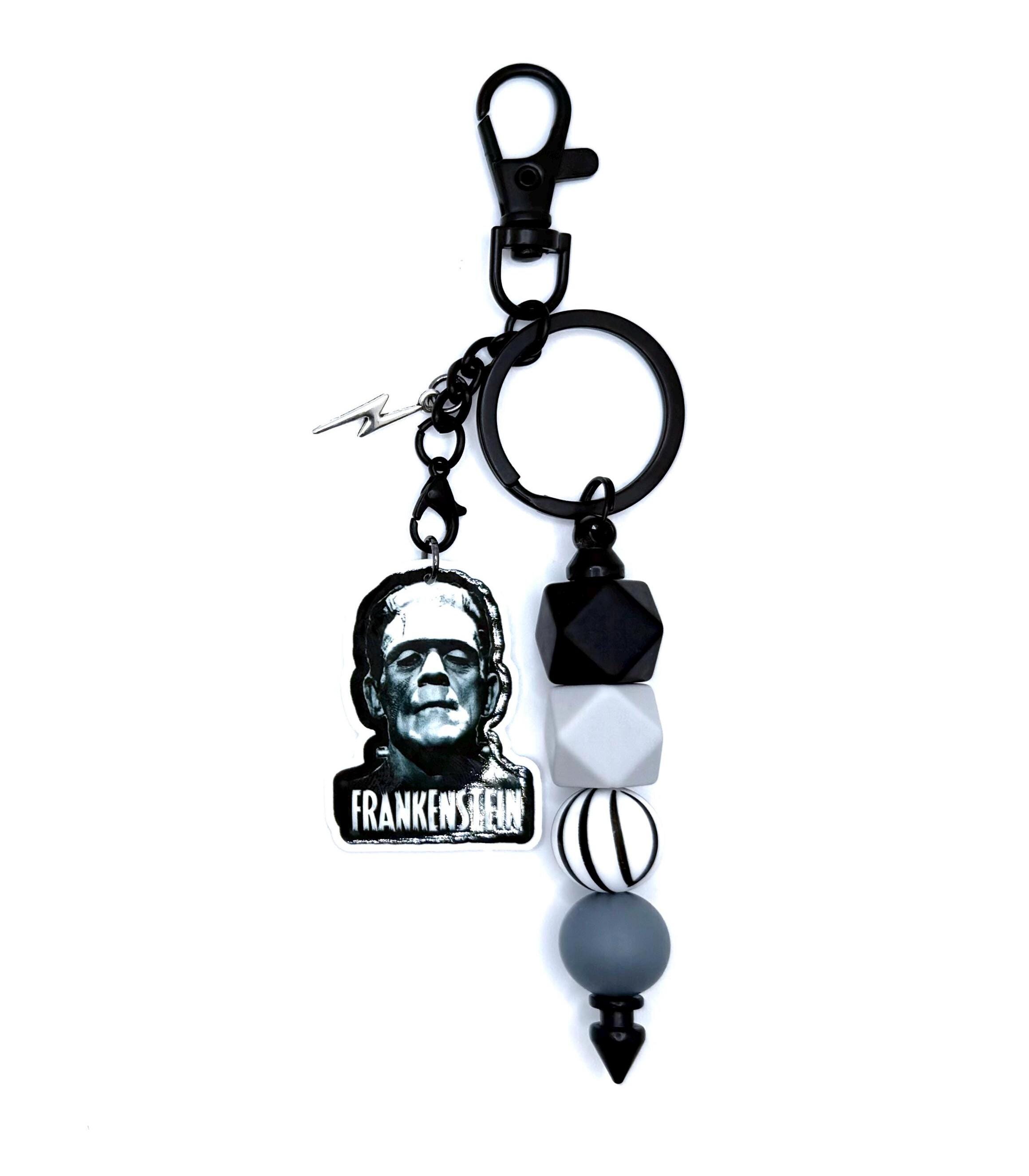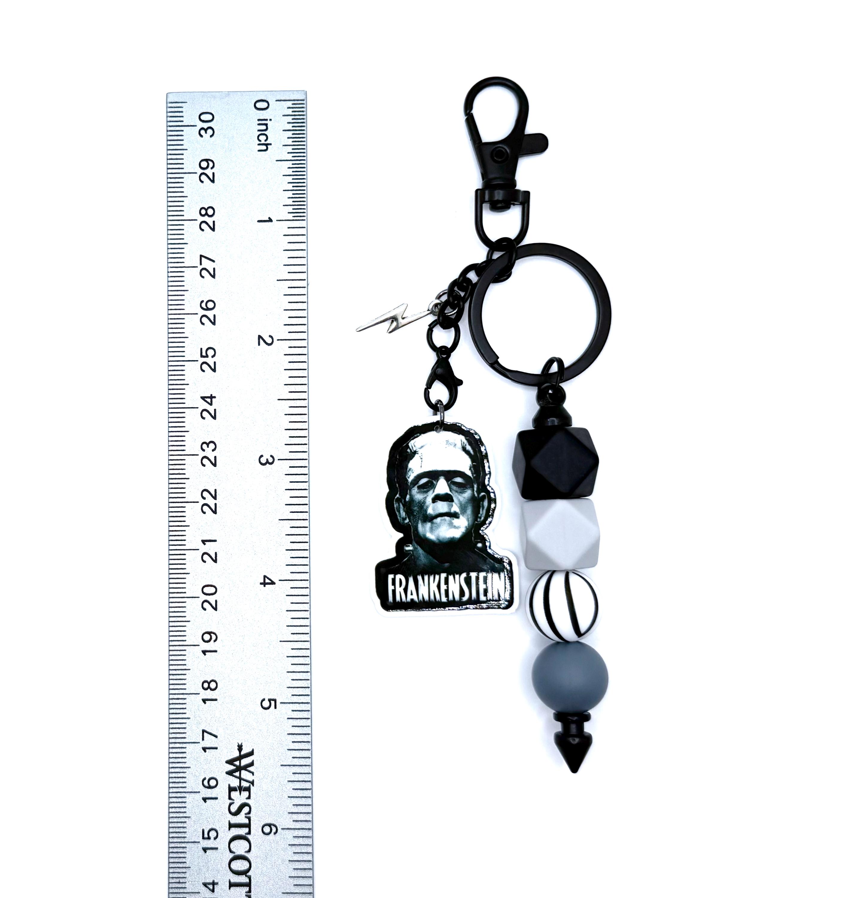 You’ve heard the thunder, now feel the electricity! This handcrafted keychain brings the iconic Frankenstein monster to life with a moody, monochrome palette. A stark black-and-white acrylic charm of Old Frank himself hangs beside a stacked tower of matte silicone beads—each one as static-charged as a lightning bolt. Clip it to your keys, backpack, or belt loop for a jolt of gothic charm wherever you go.