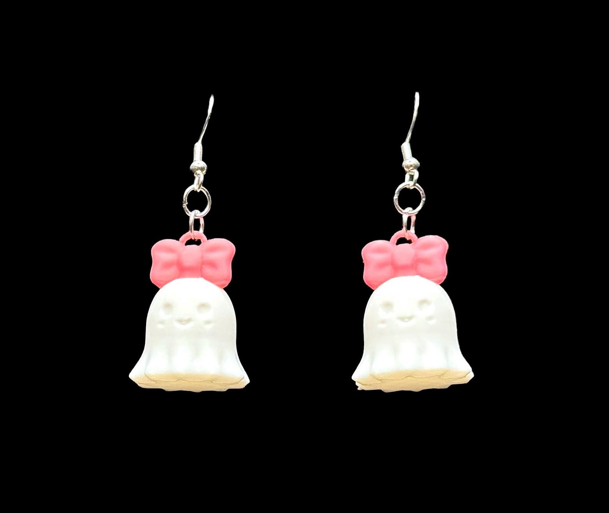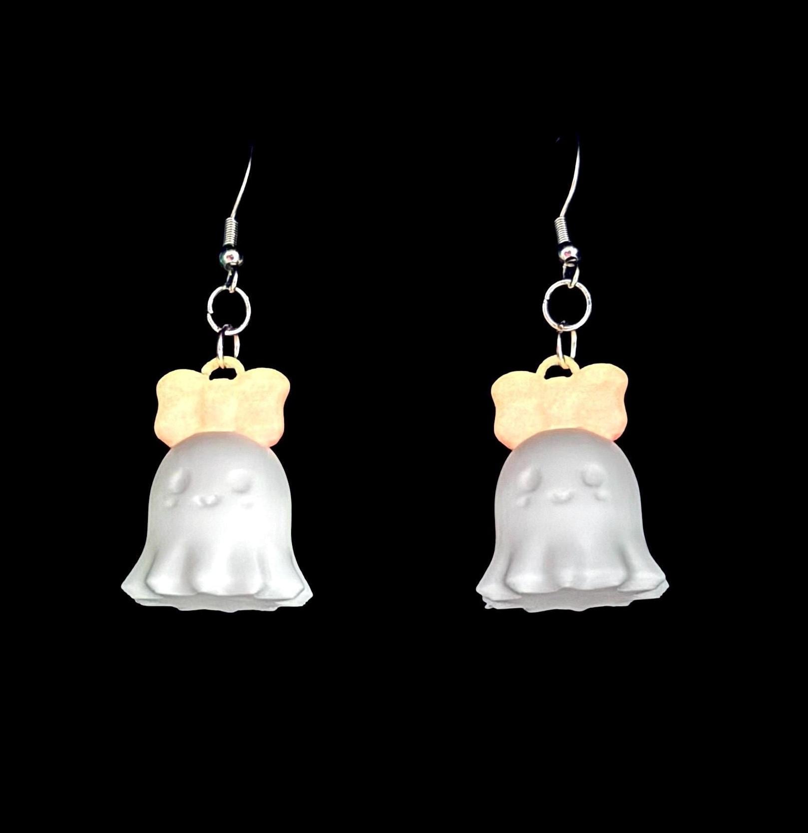 Glow-In-The-Dark Ghost Earrings, Pink Bow, 3D Printed
