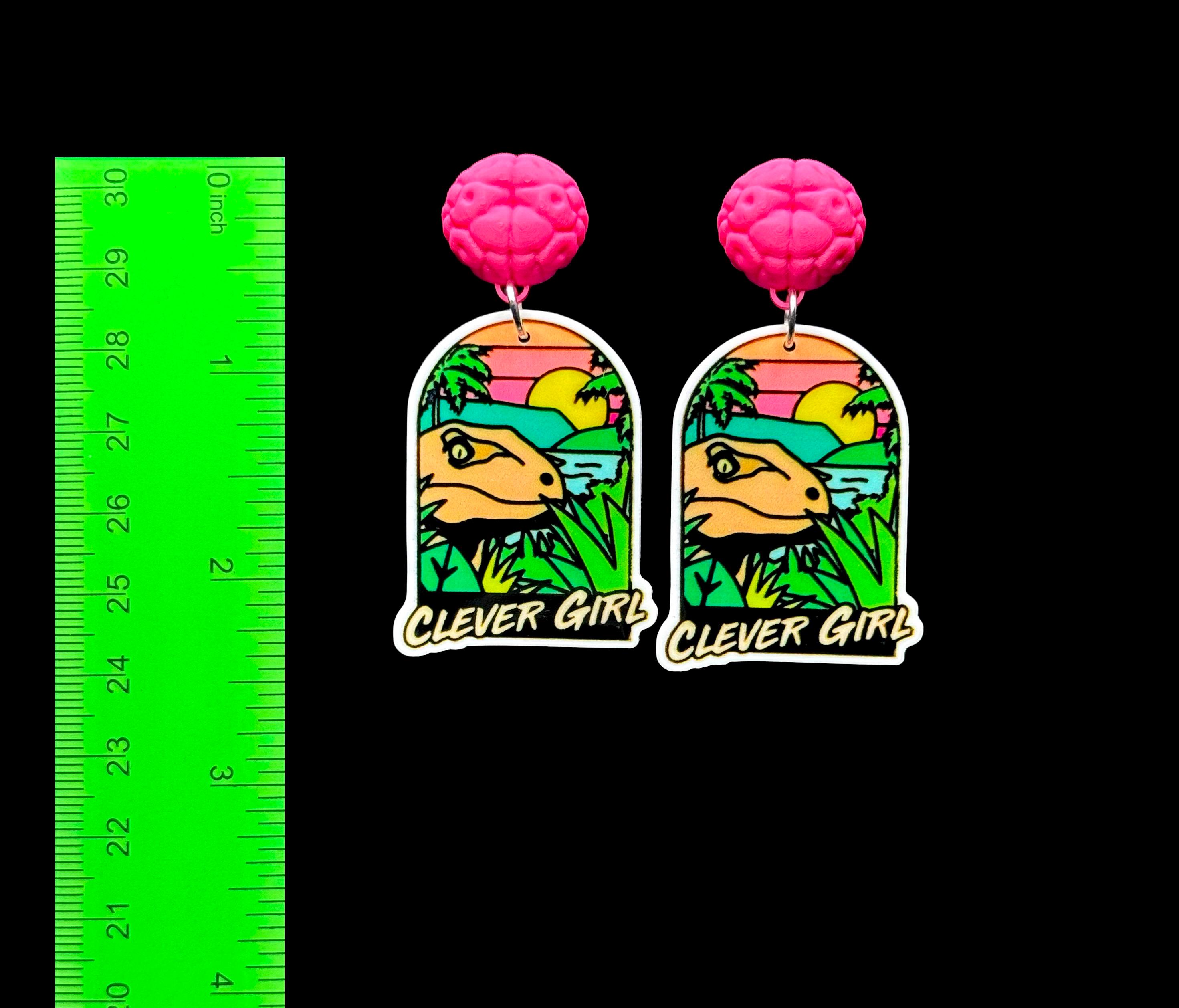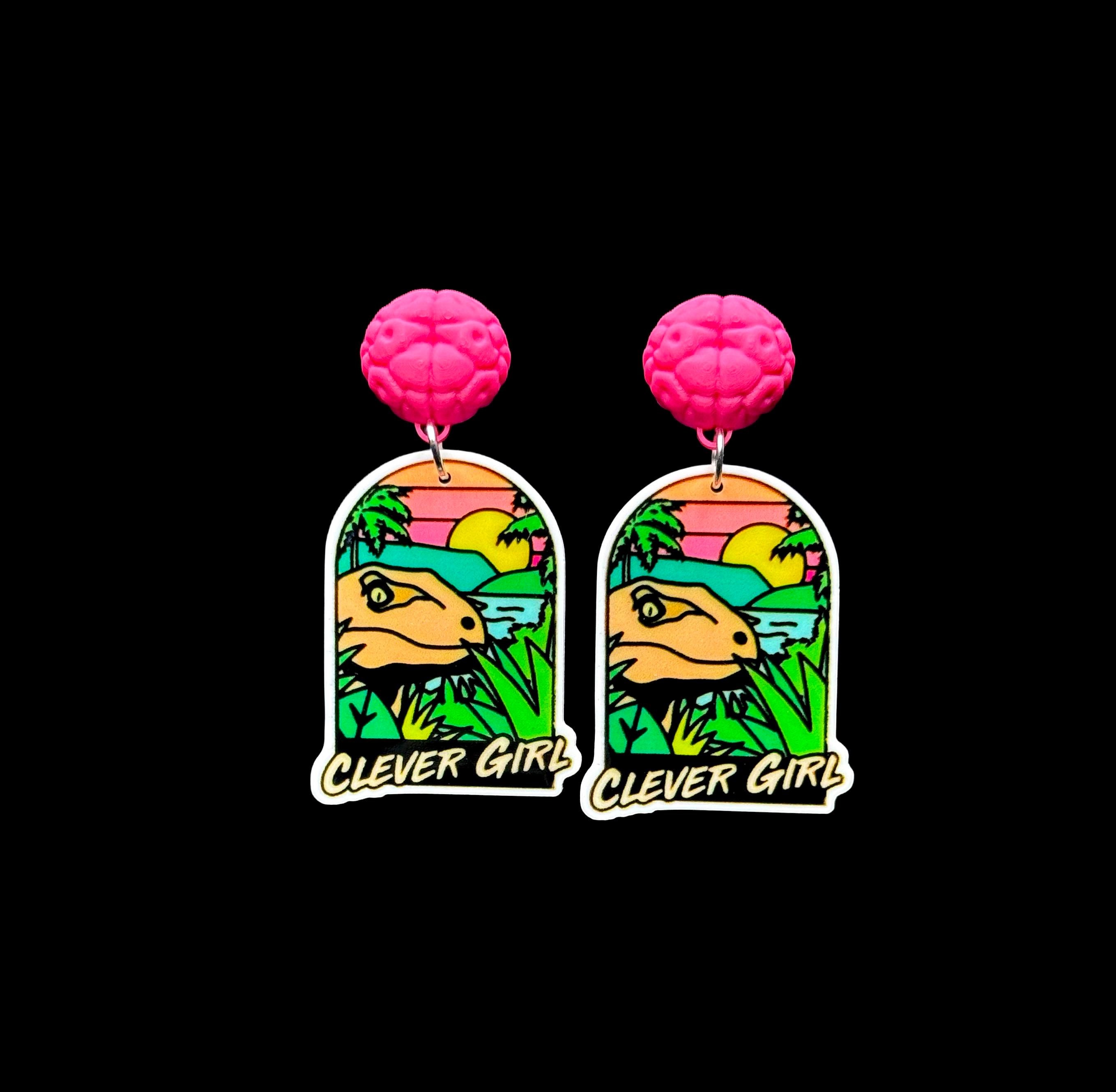Available with: Standard hooks, teal heart studs, pink glitter studs, or 3D printed pink neon brain studs