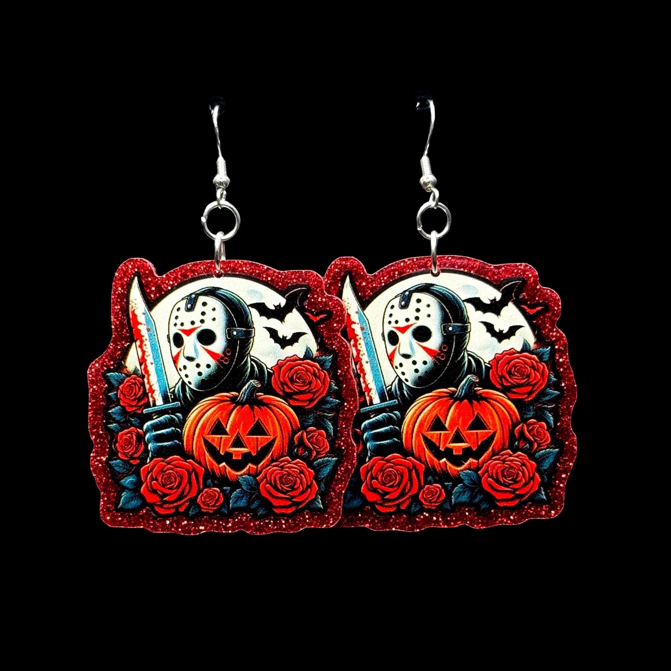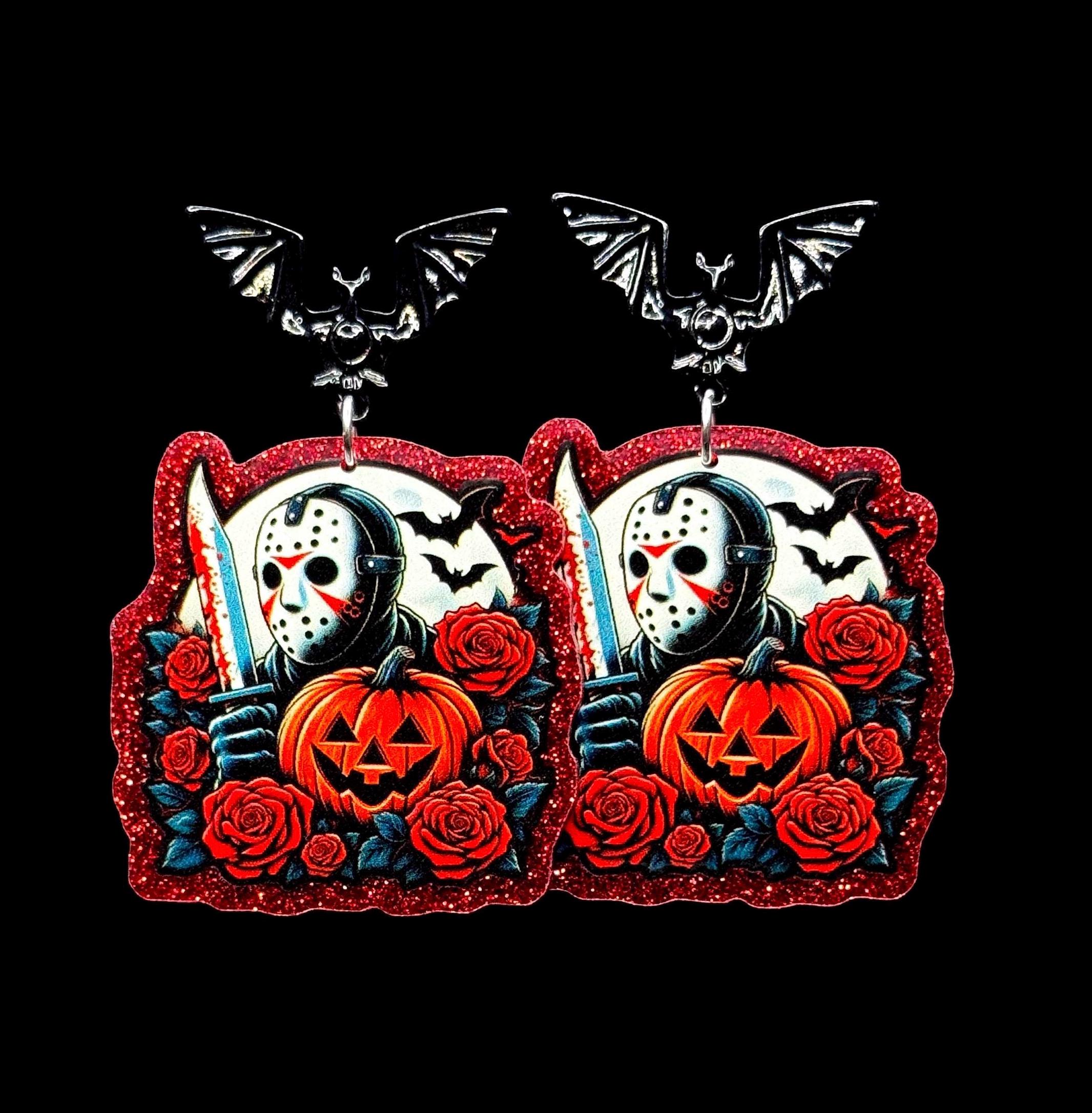 A haunting bouquet of roses, pumpkins, and midnight horror—these earrings are the ultimate slasher-season statement, complete with your choice of hooks or striking bat studs.