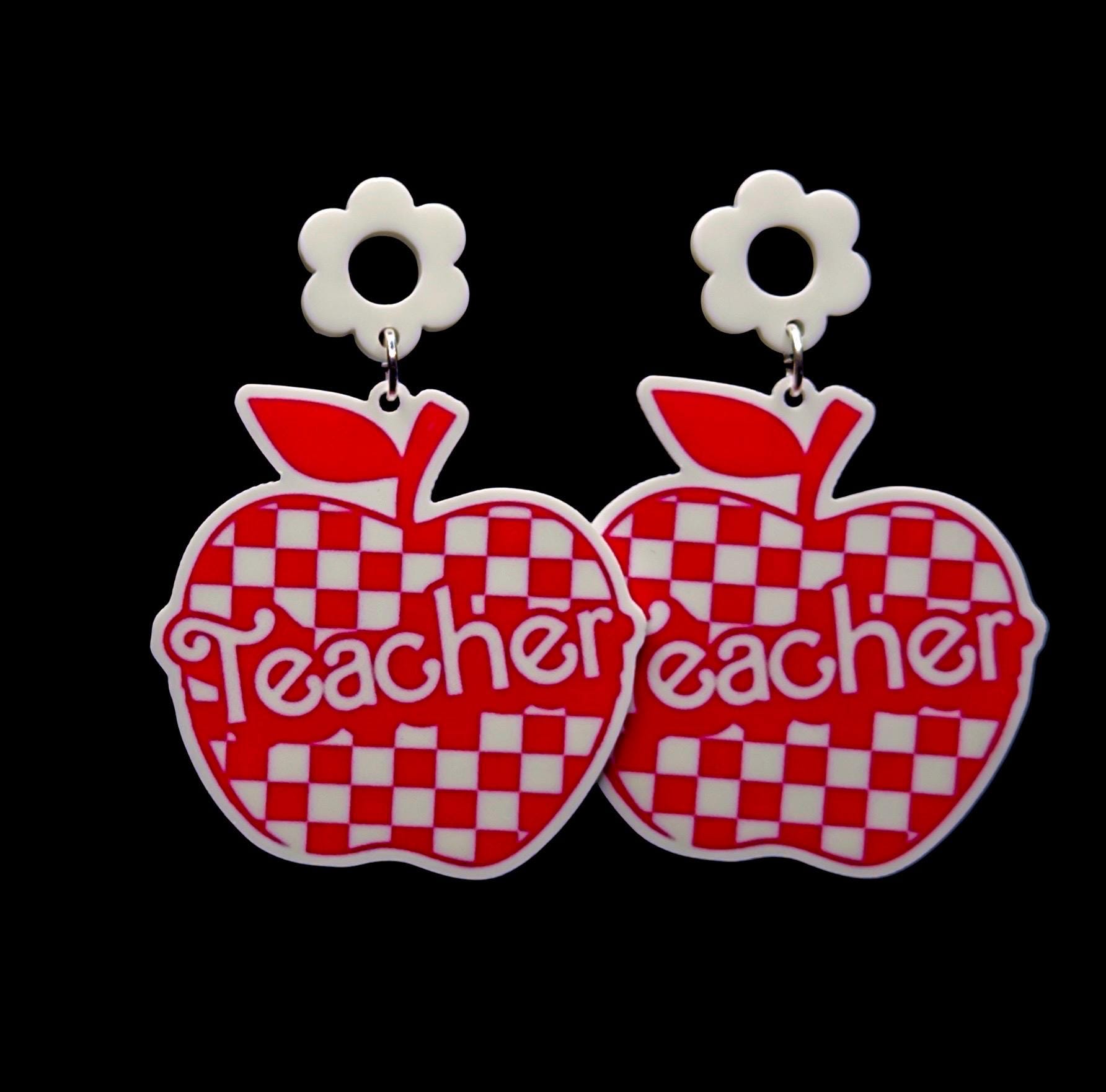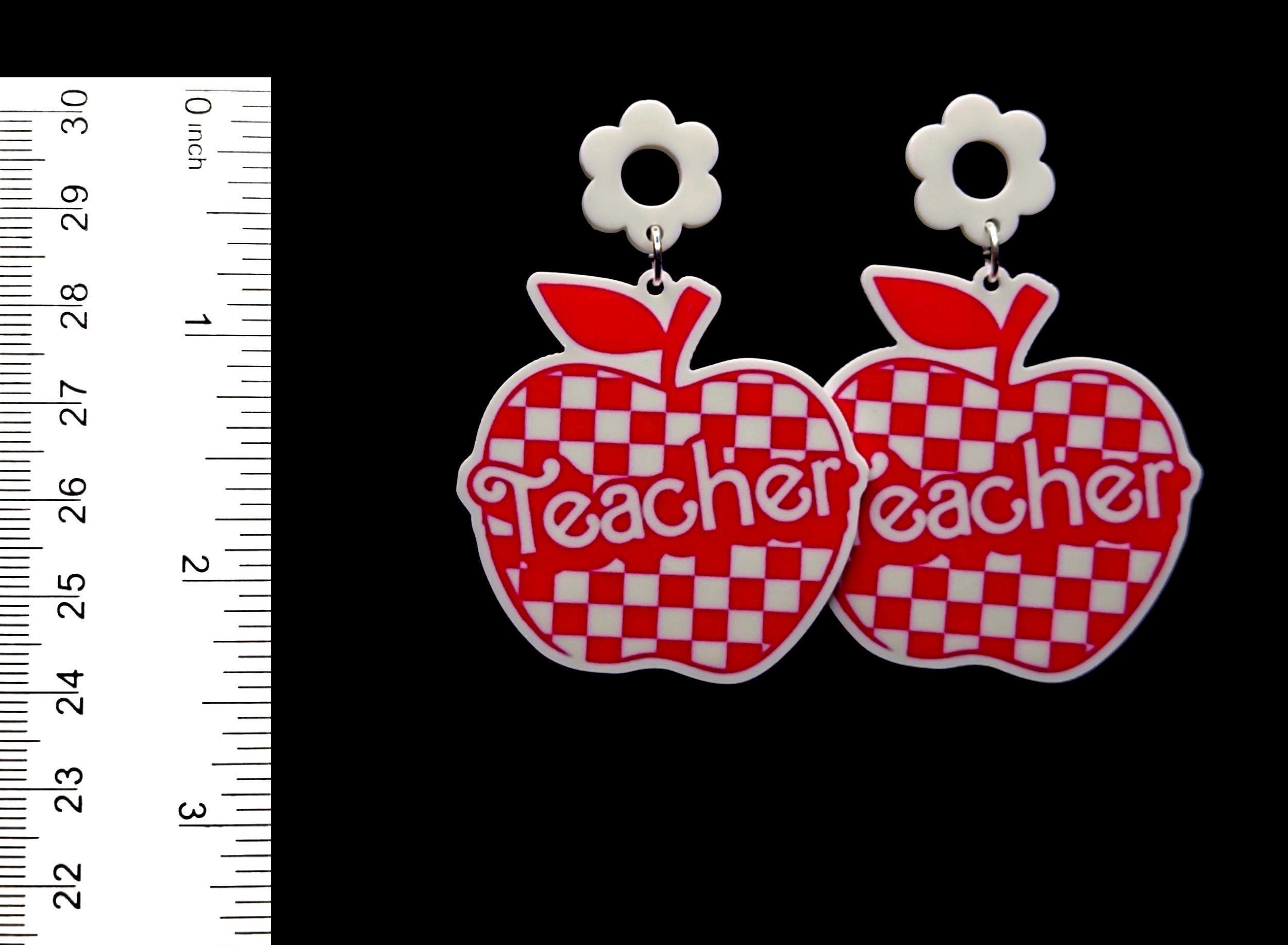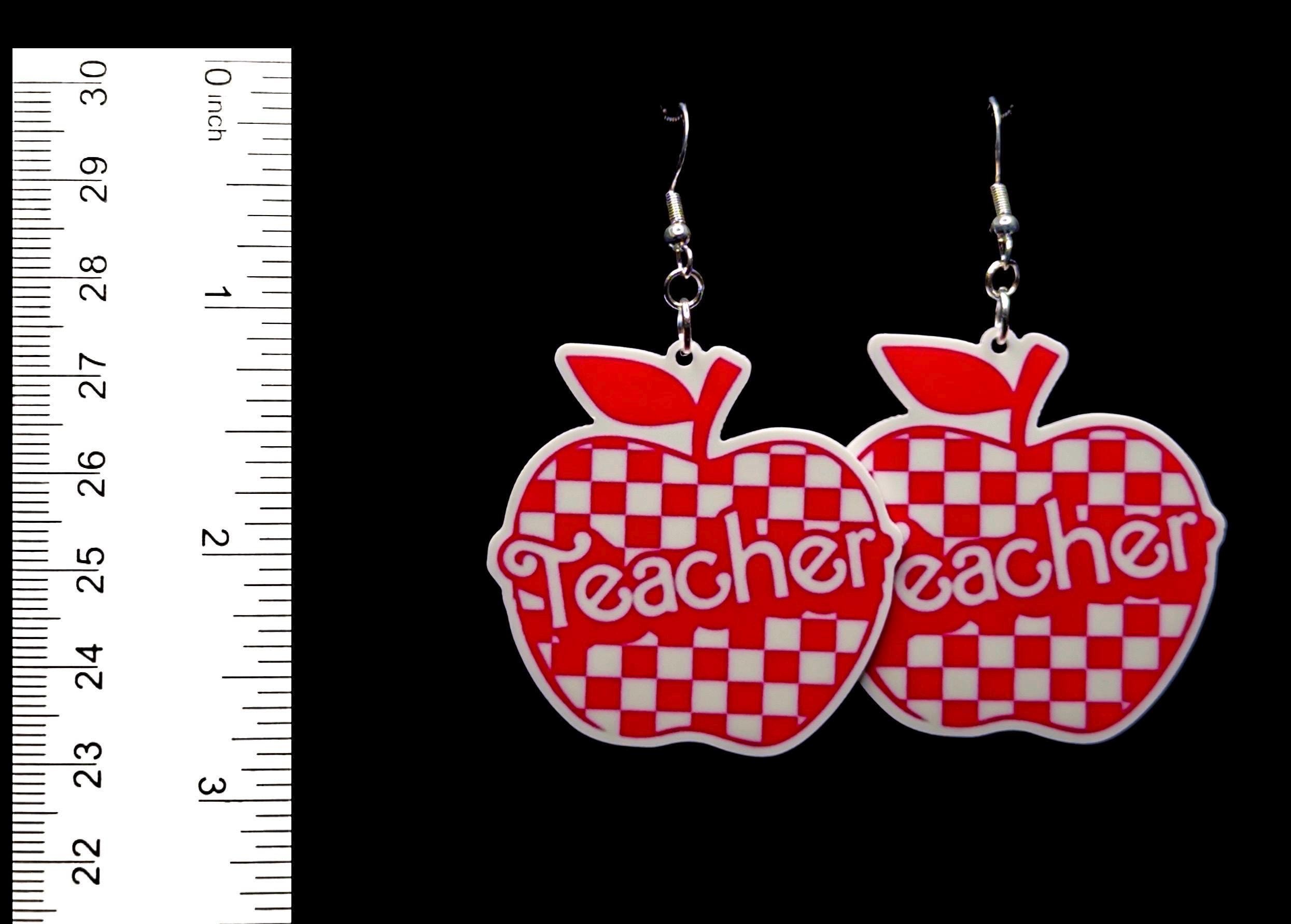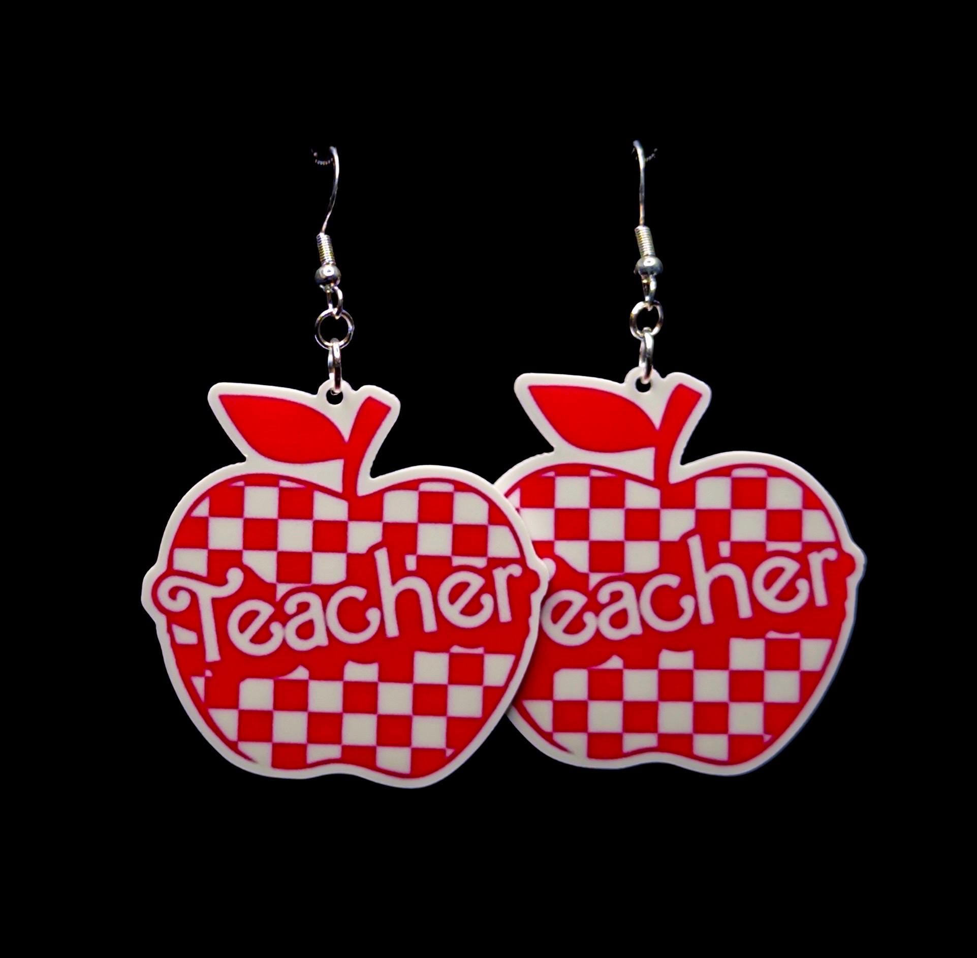 Apple Teacher Earrings, Red Checkered, Handmade, Nickel-Free