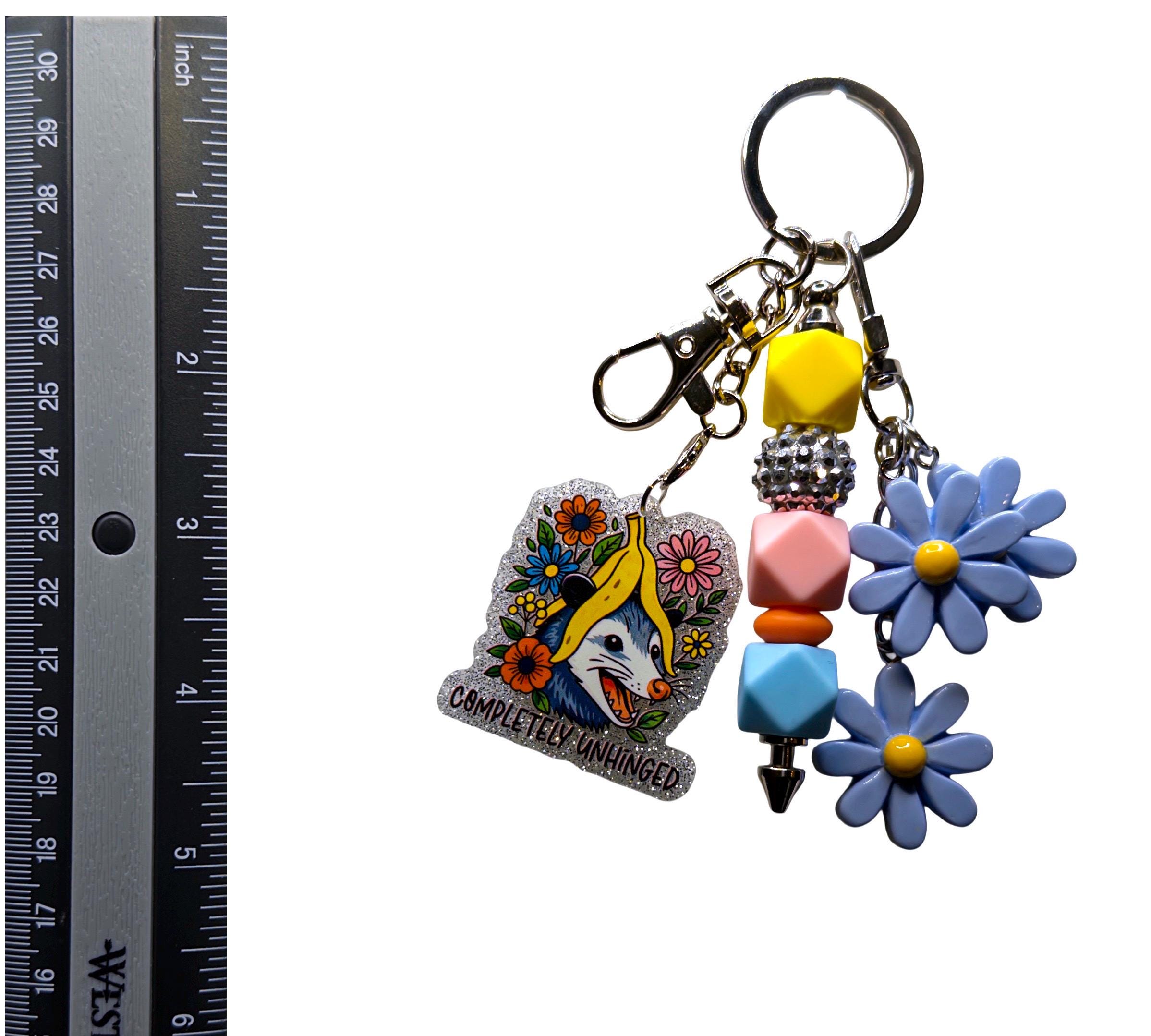 This playful keychain features a chaotic little possum surrounded by bright florals and bold colors—perfect for anyone embracing their feral side with style.