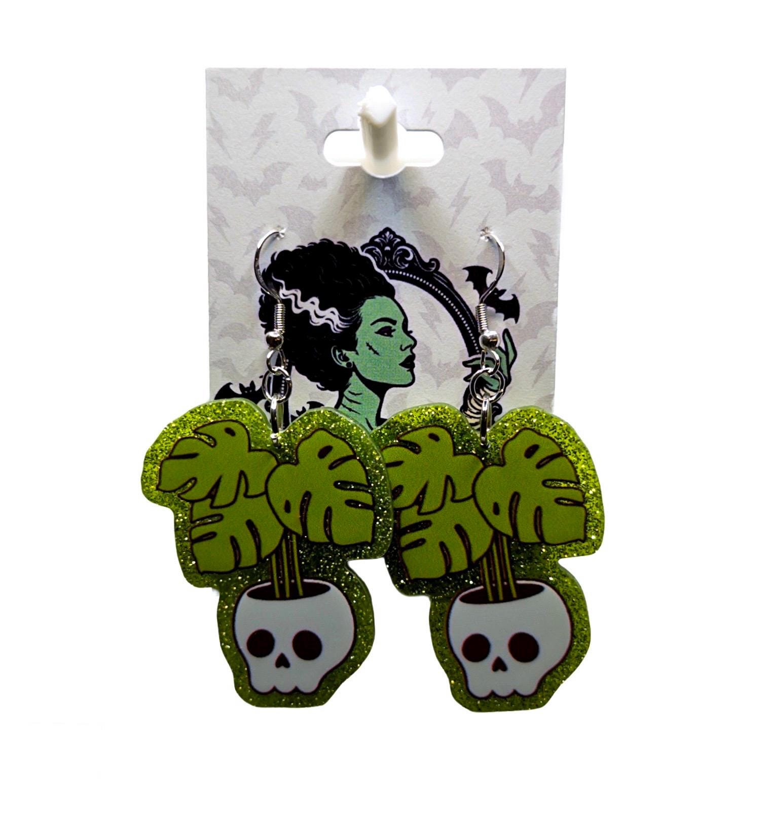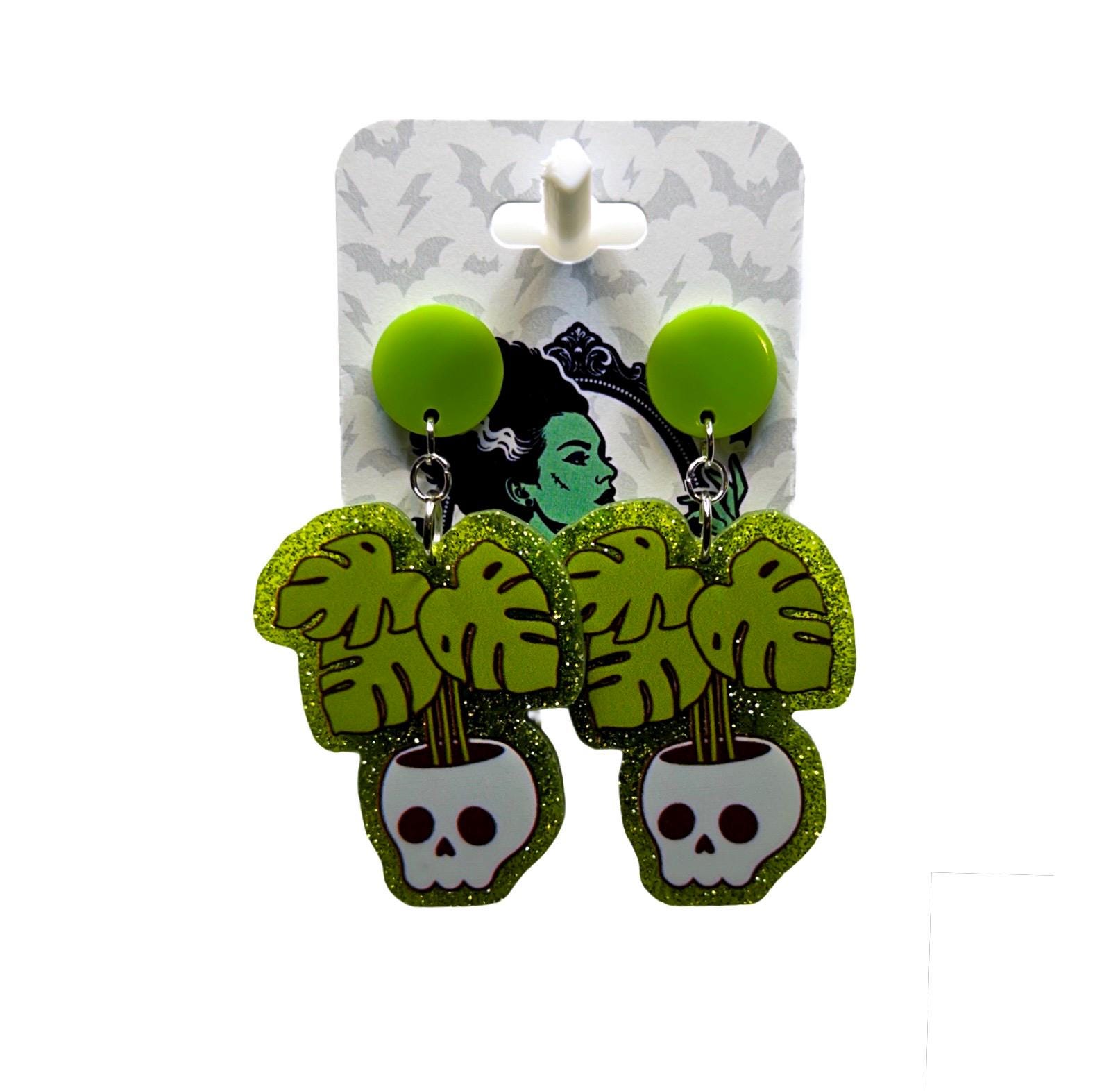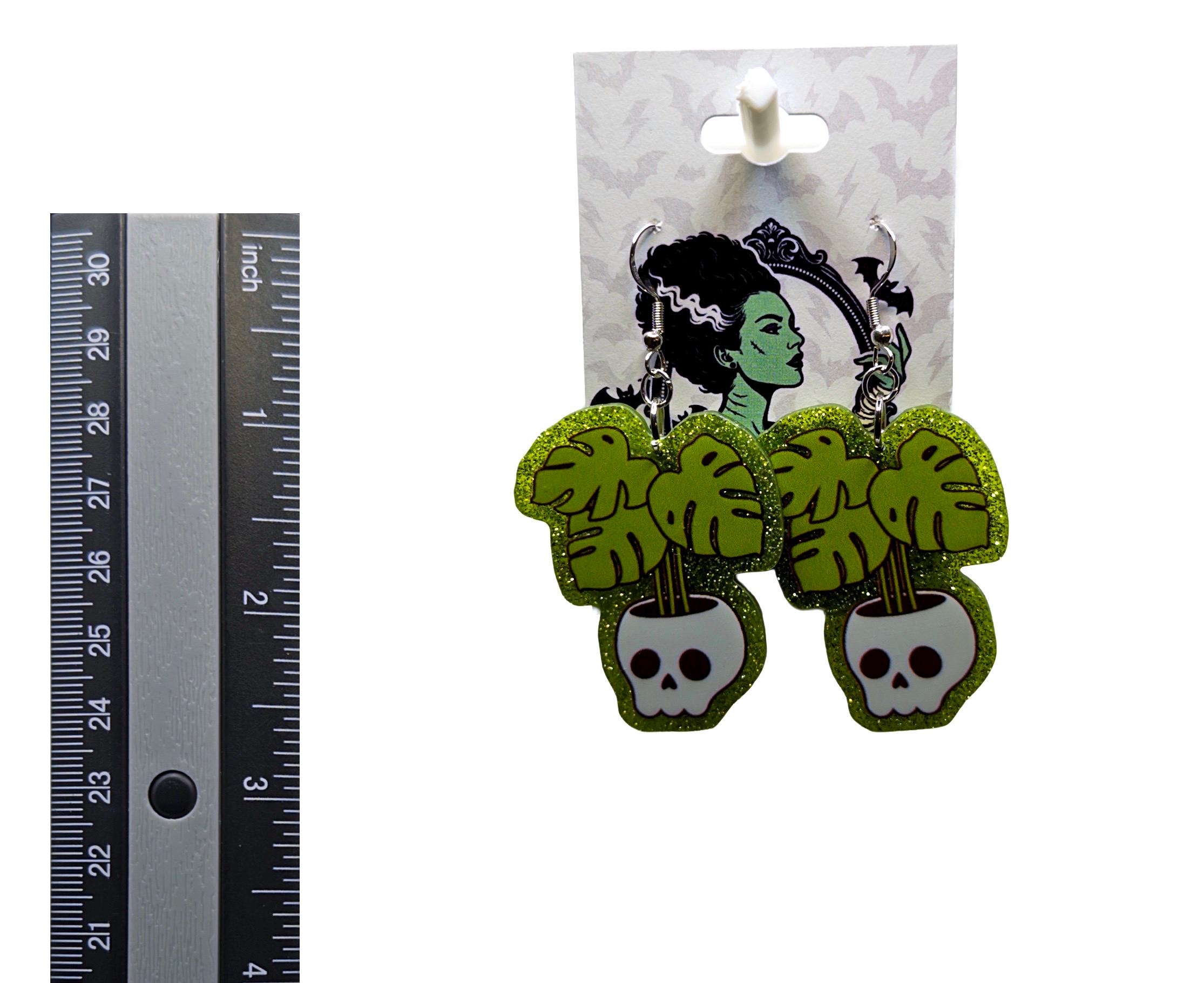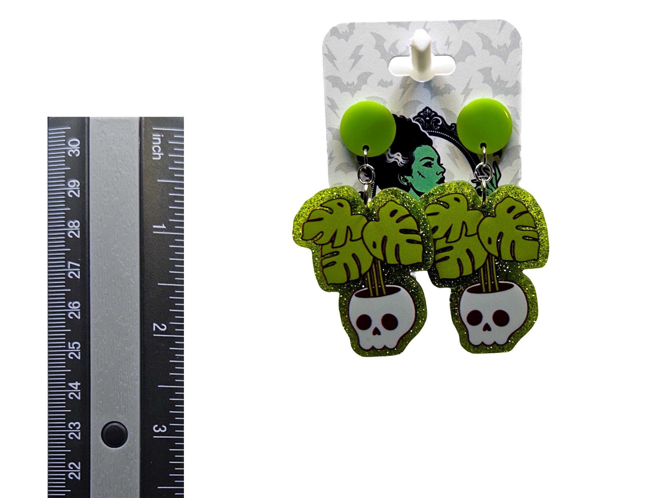 These creepy-cute plant earrings feature lush green leaves growing straight out of a skull planter—because even your plants deserve a little attitude. With a glittery finish and bold design, they’re perfect for adding a touch of dark whimsy to any outfit.