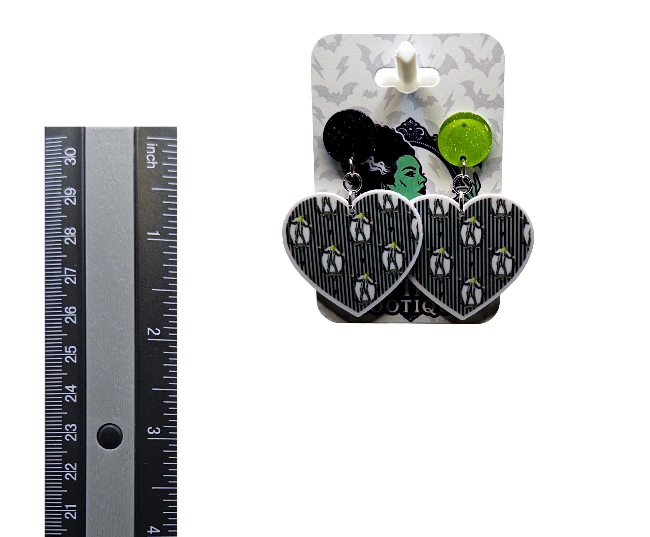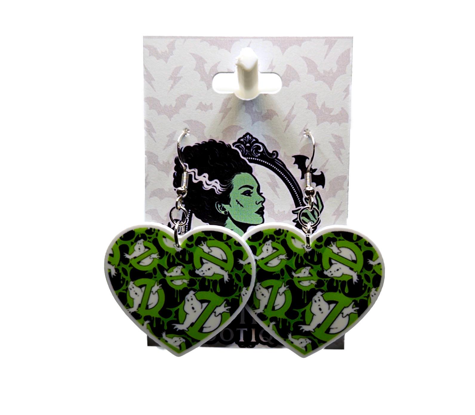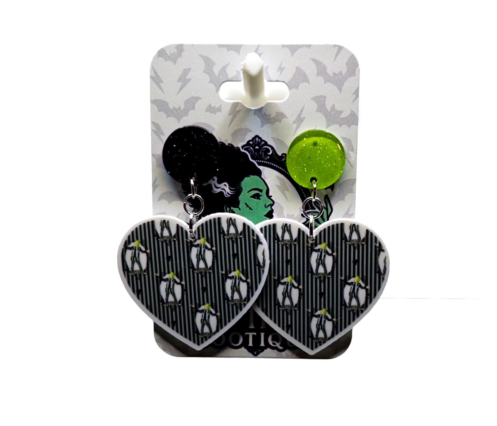 These heart-shaped statement earrings feature a fun ghost-inspired pattern on a bold green background (or a classic black-and-white spooky stripe option). Cute, creepy, and perfect for adding a little Halloween flair to any outfit—without going over the top.