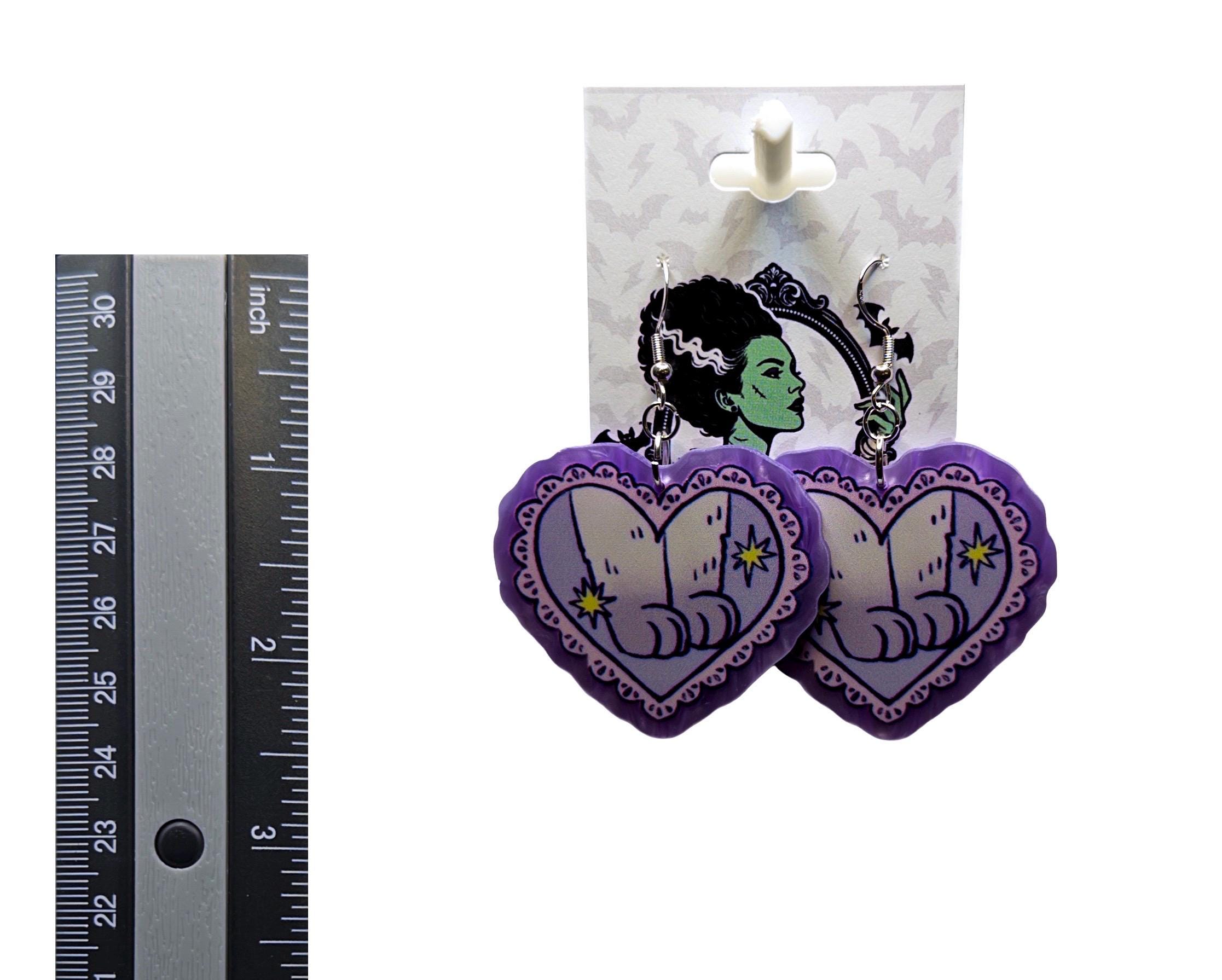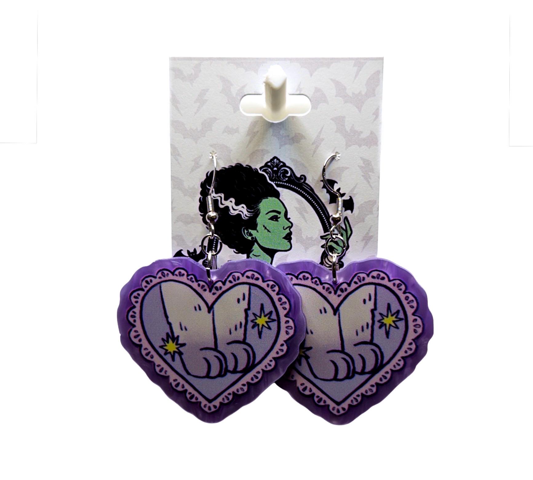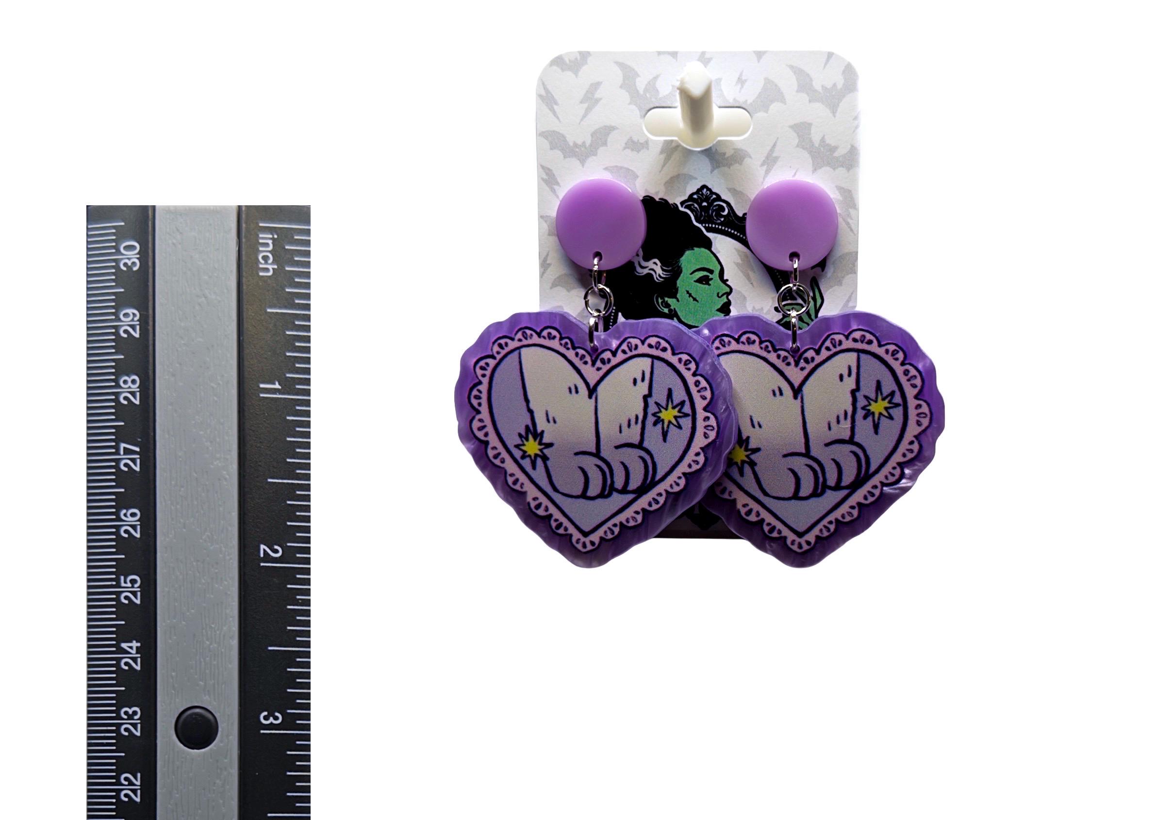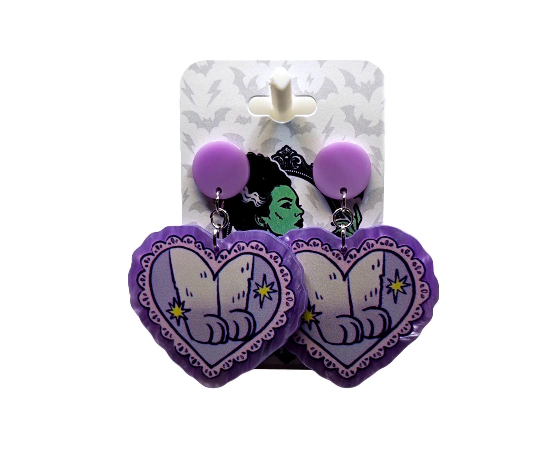 These heart-shaped statement earrings feature an adorable cat-inspired design with a playful twist. Set in a soft purple palette with charming details, they’re perfect for adding personality to your everyday look or completing your spooky-cute aesthetic.