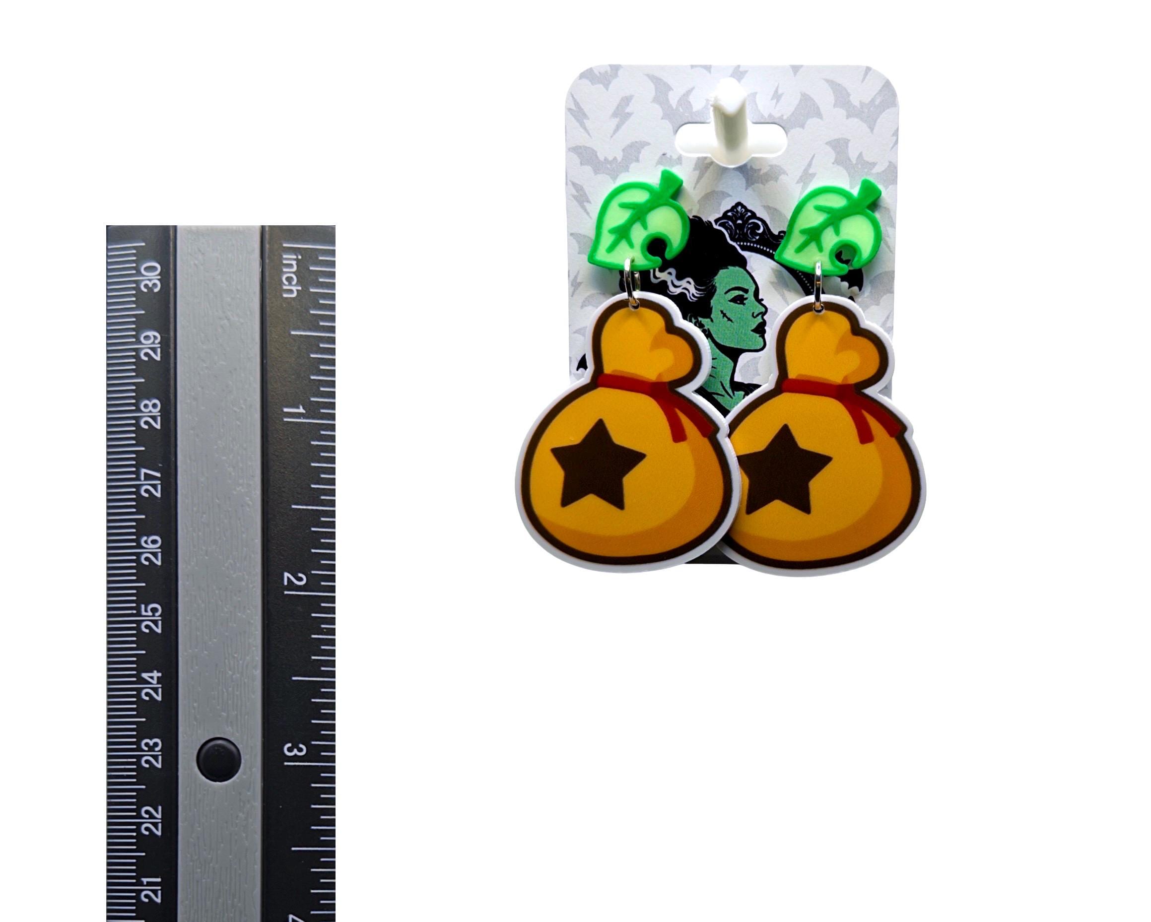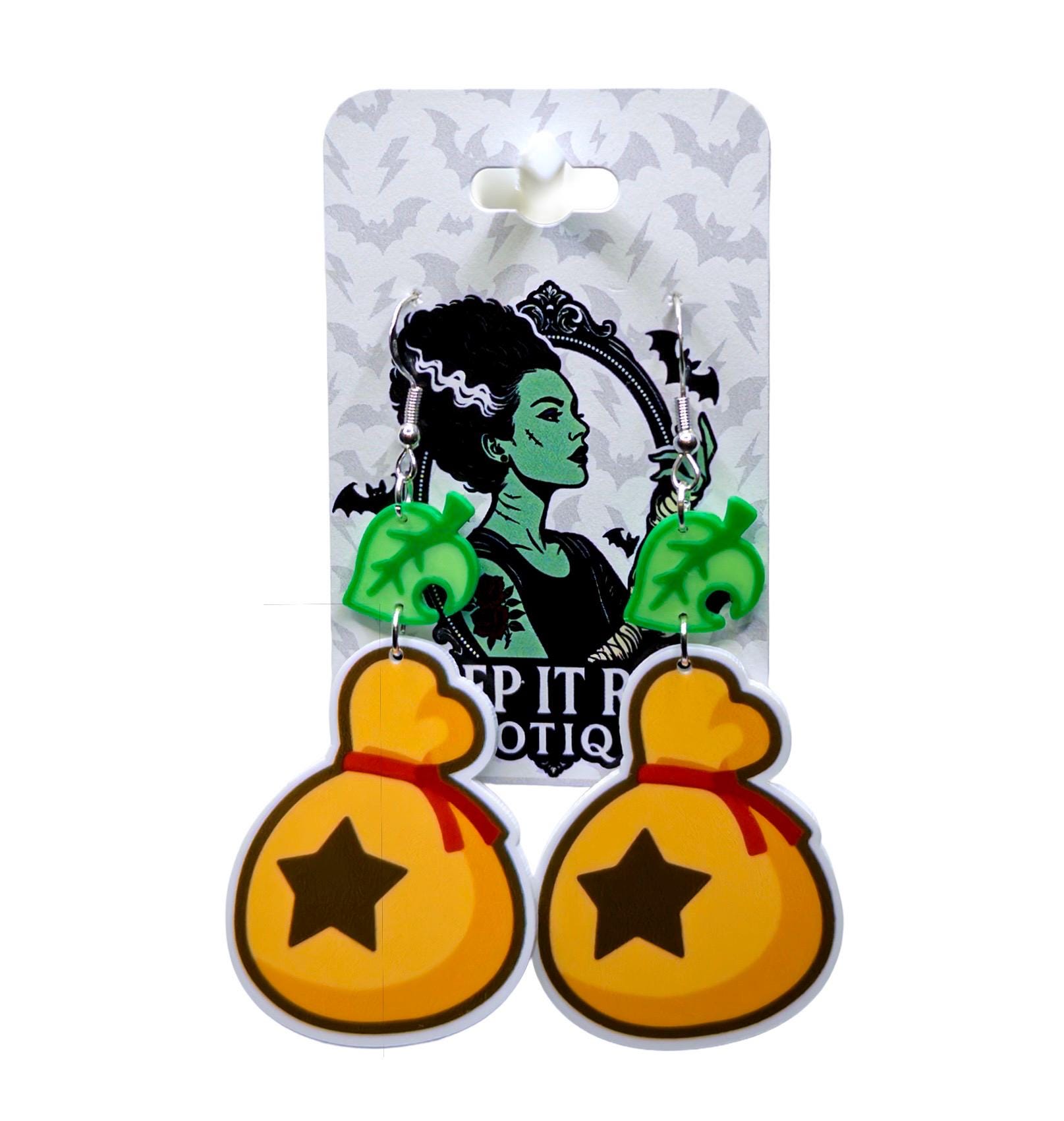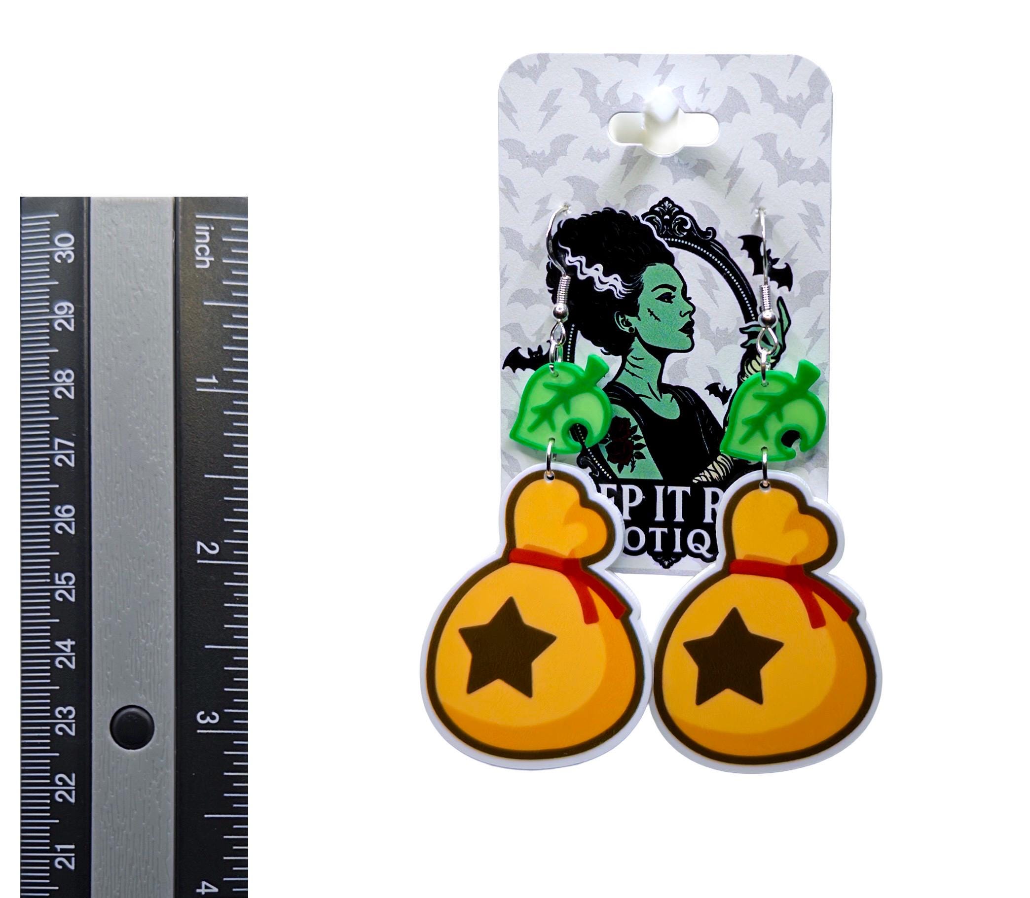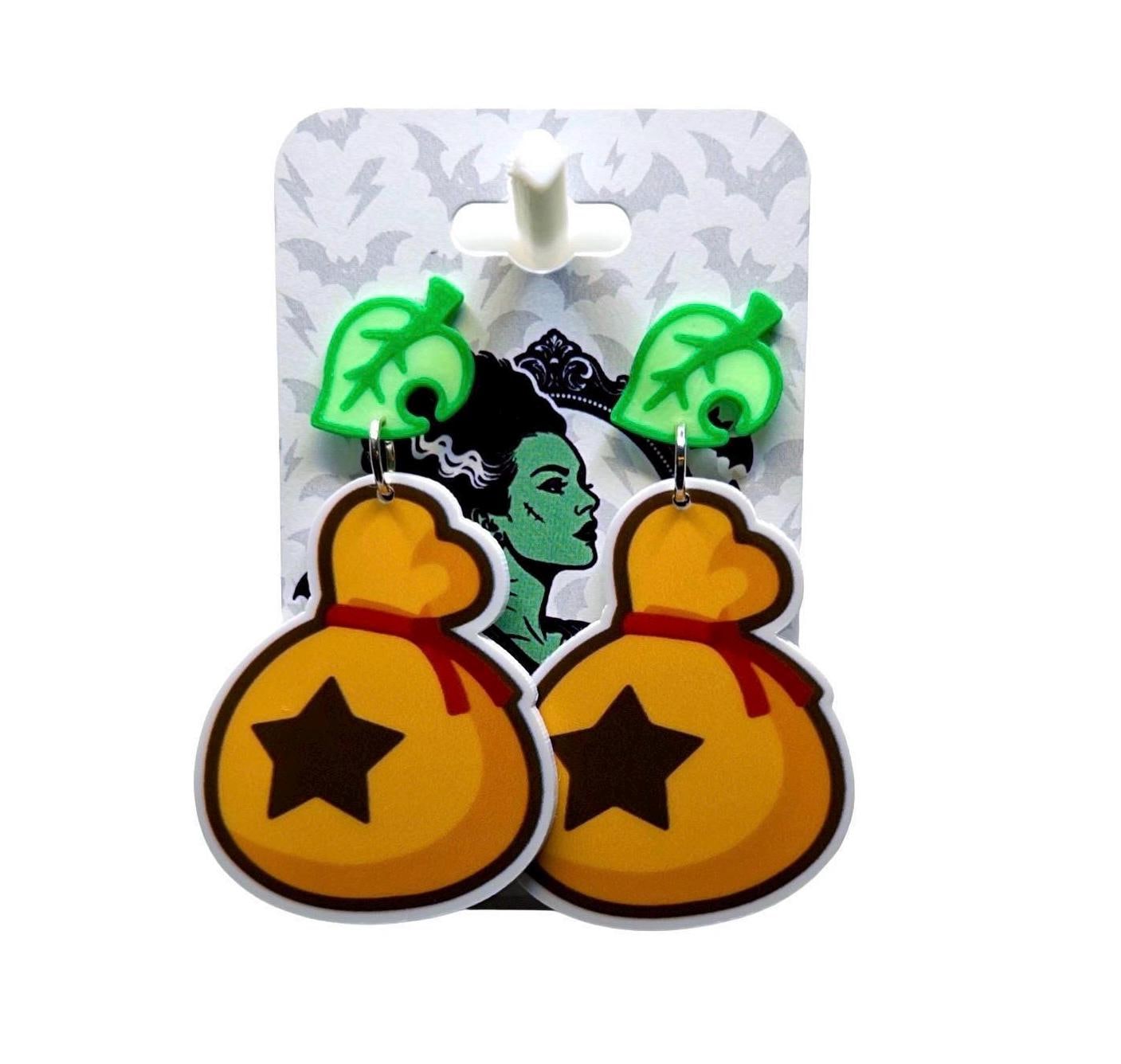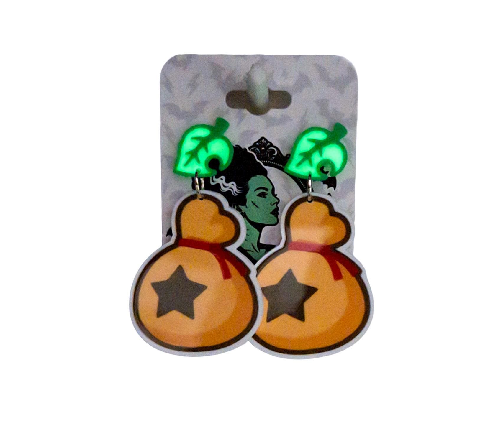 Level up your accessory game with these nostalgic, game-inspired statement earrings—featuring bold star coin bags and glow-in-the-dark leaf tops.