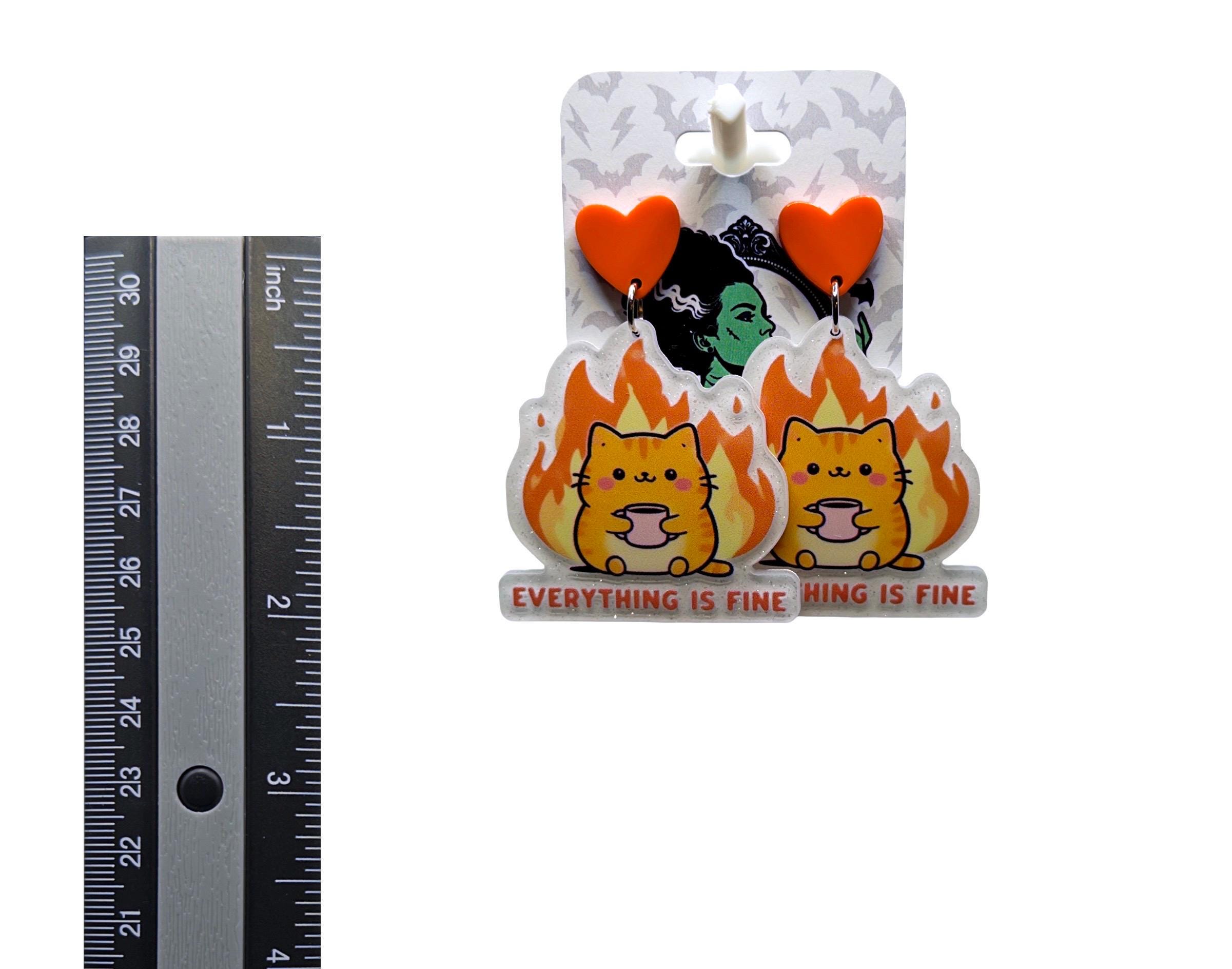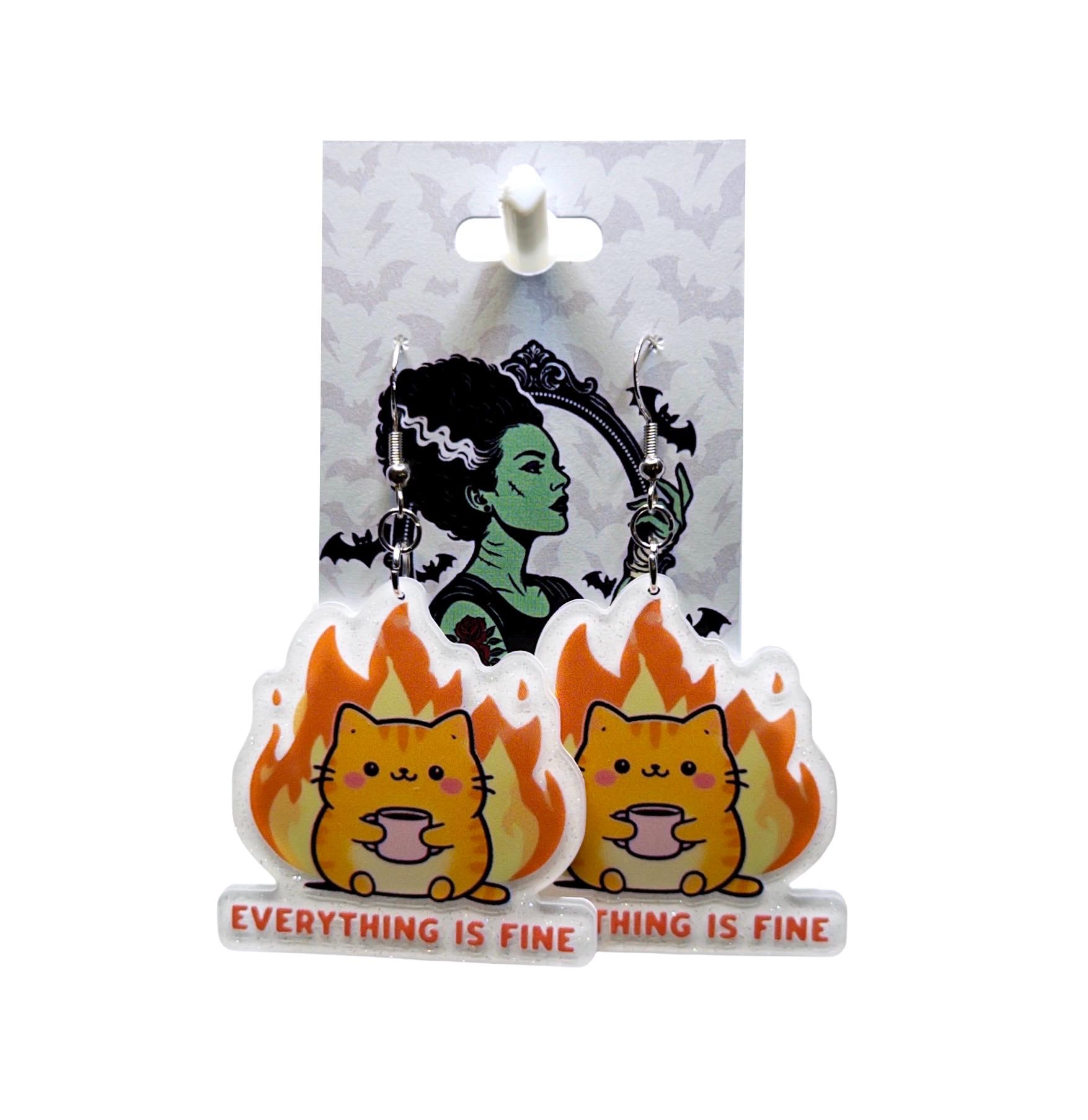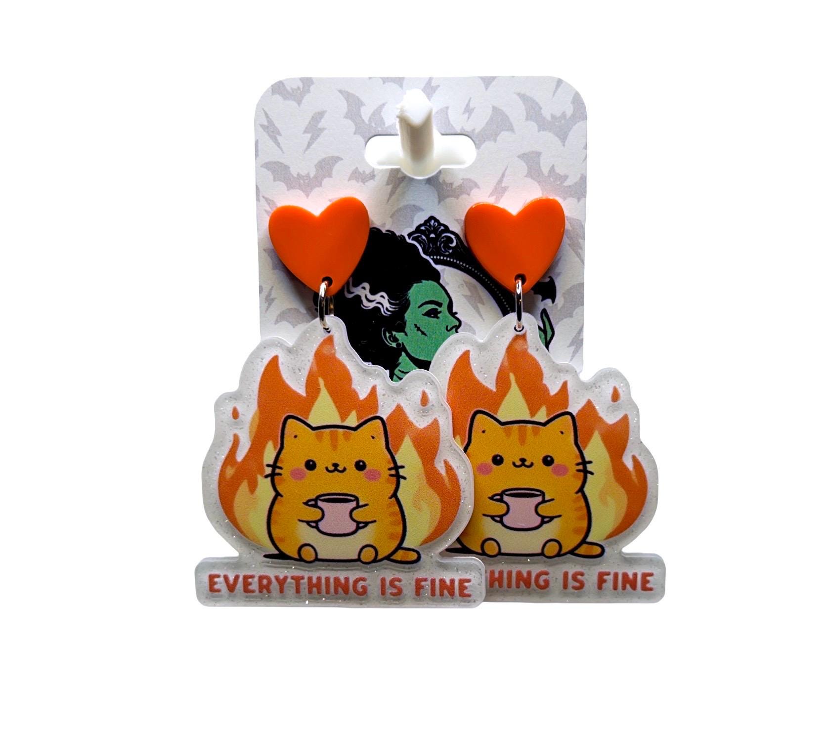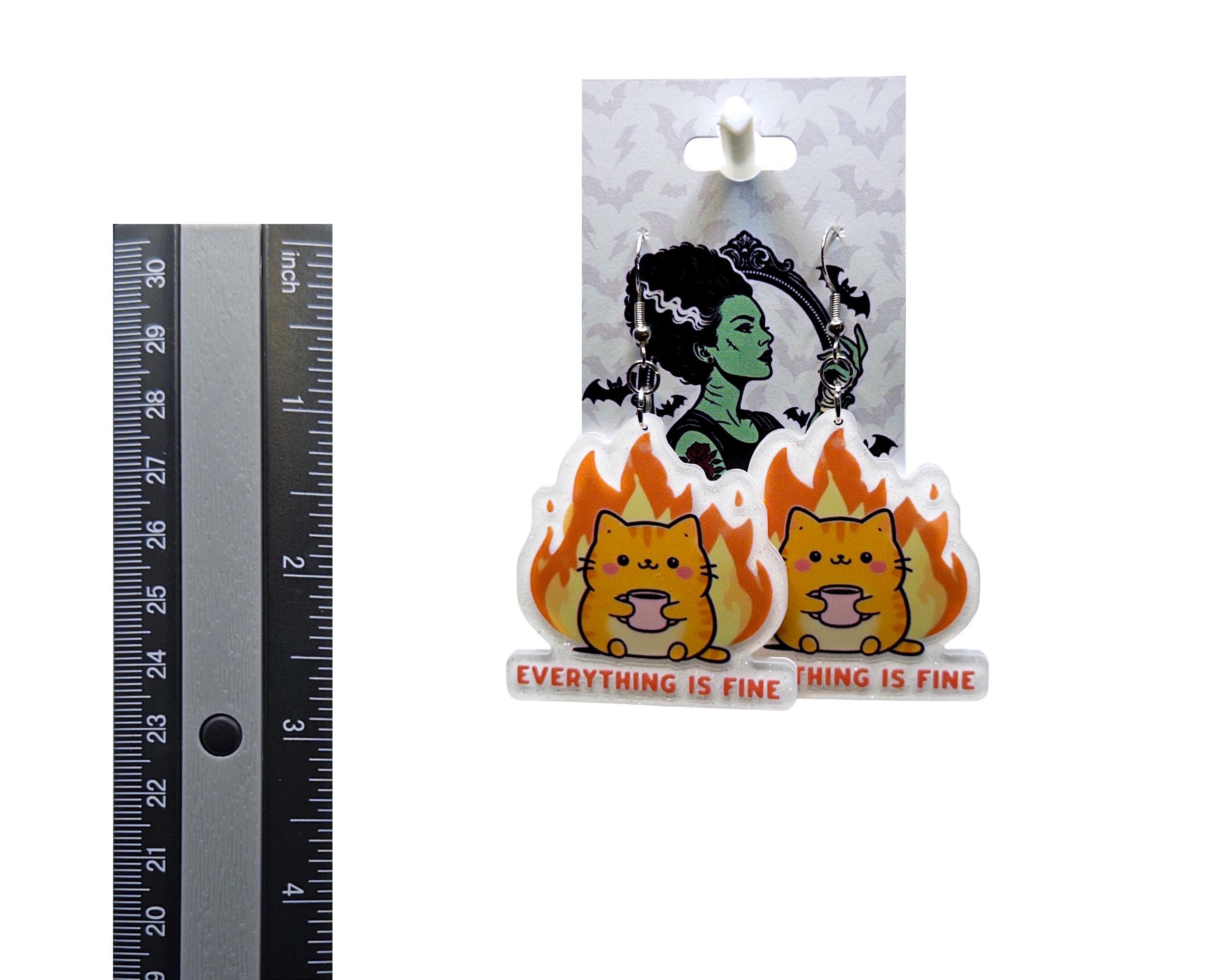 These “Everything Is Fine” cat earrings perfectly capture that calm-on-the-outside, chaos-on-the-inside vibe. Featuring an adorable kitty sipping coffee while everything burns around it, they’re the ultimate mix of humor and everyday mood.
