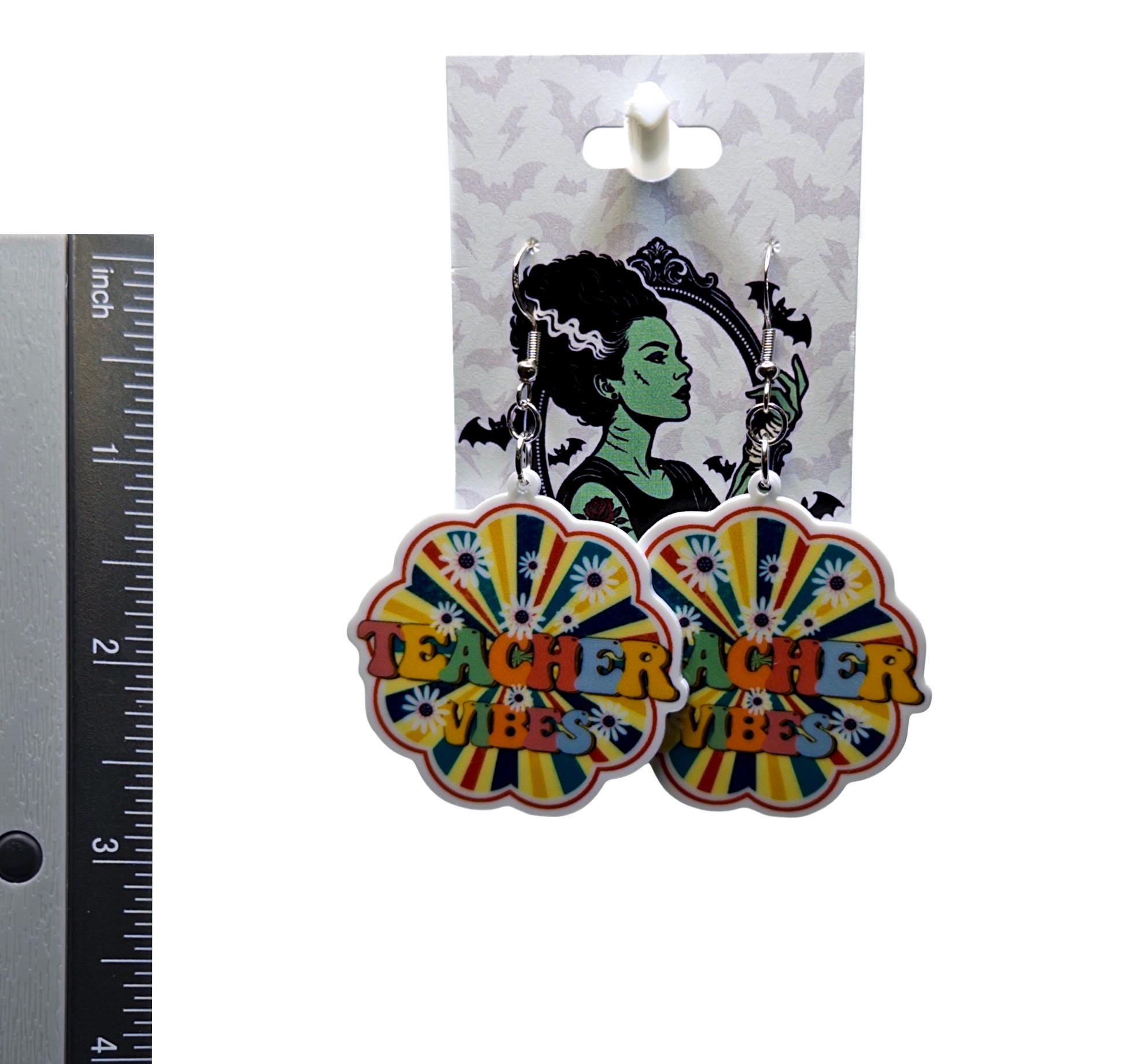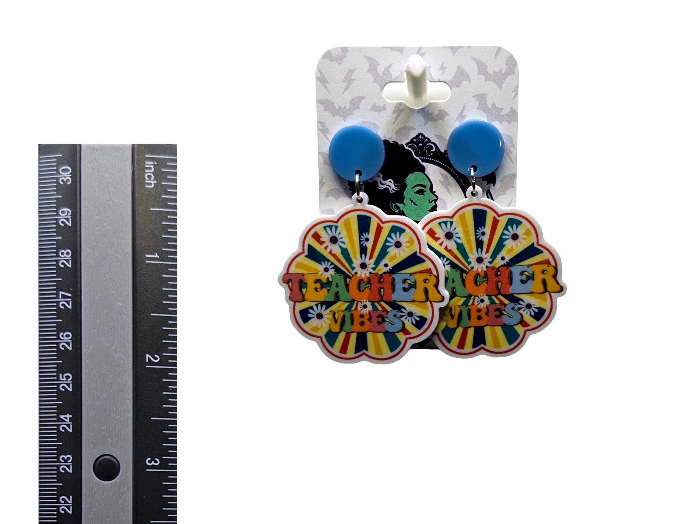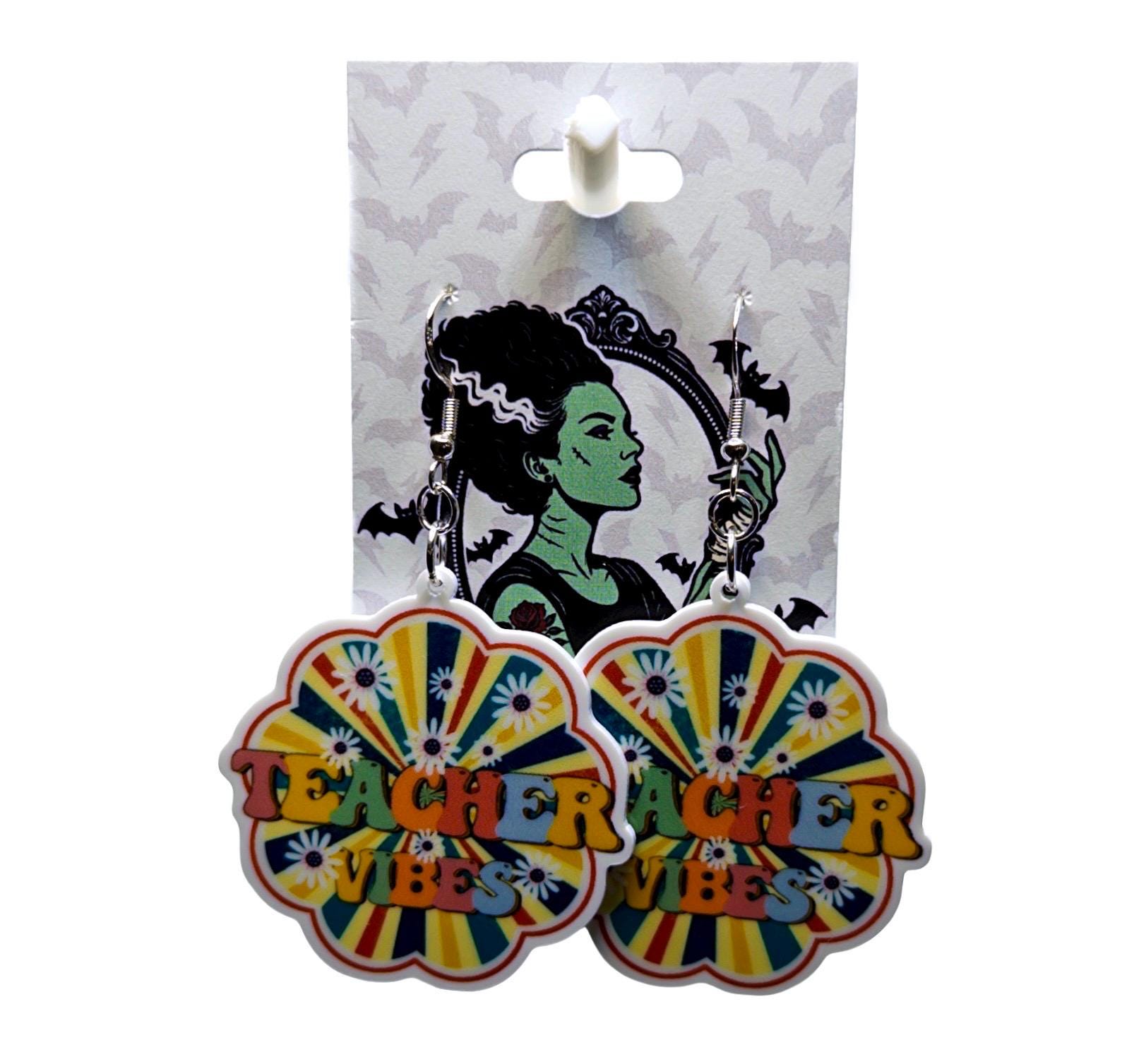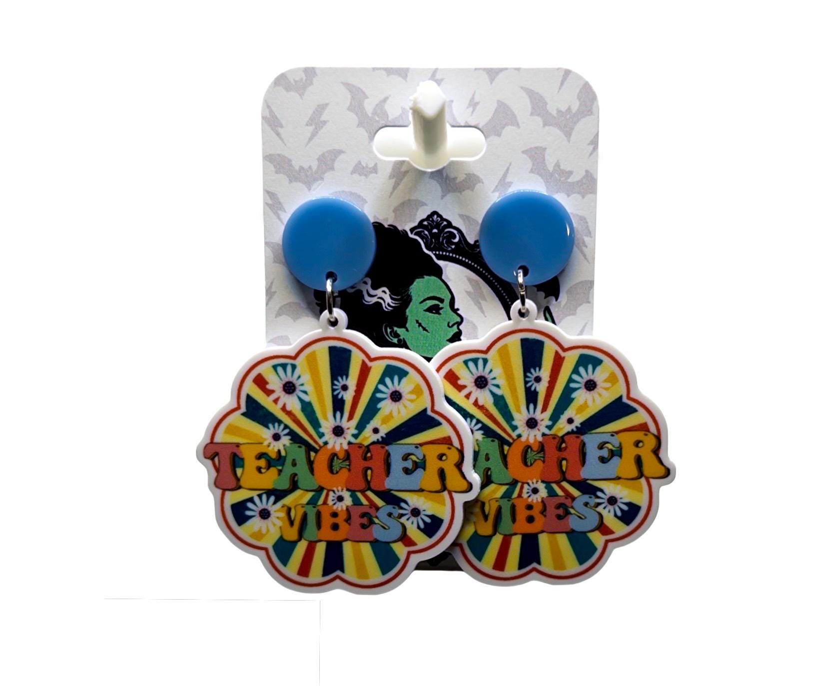 These “Teacher Vibes” statement earrings bring fun, colorful energy to your everyday style. Featuring a groovy rainbow burst design with playful lettering, they’re perfect for educators who love to show off their personality in and out of the classroom.