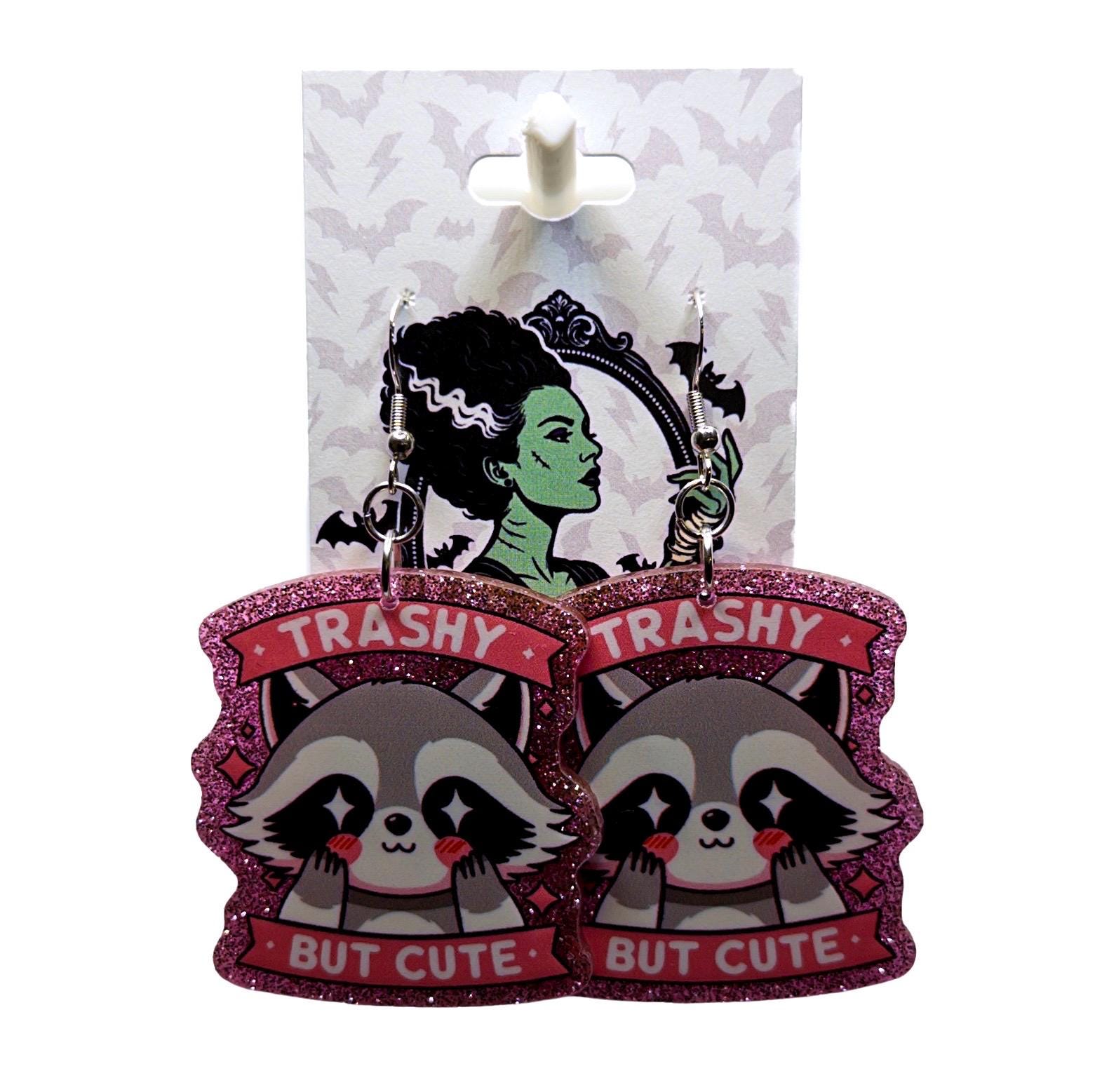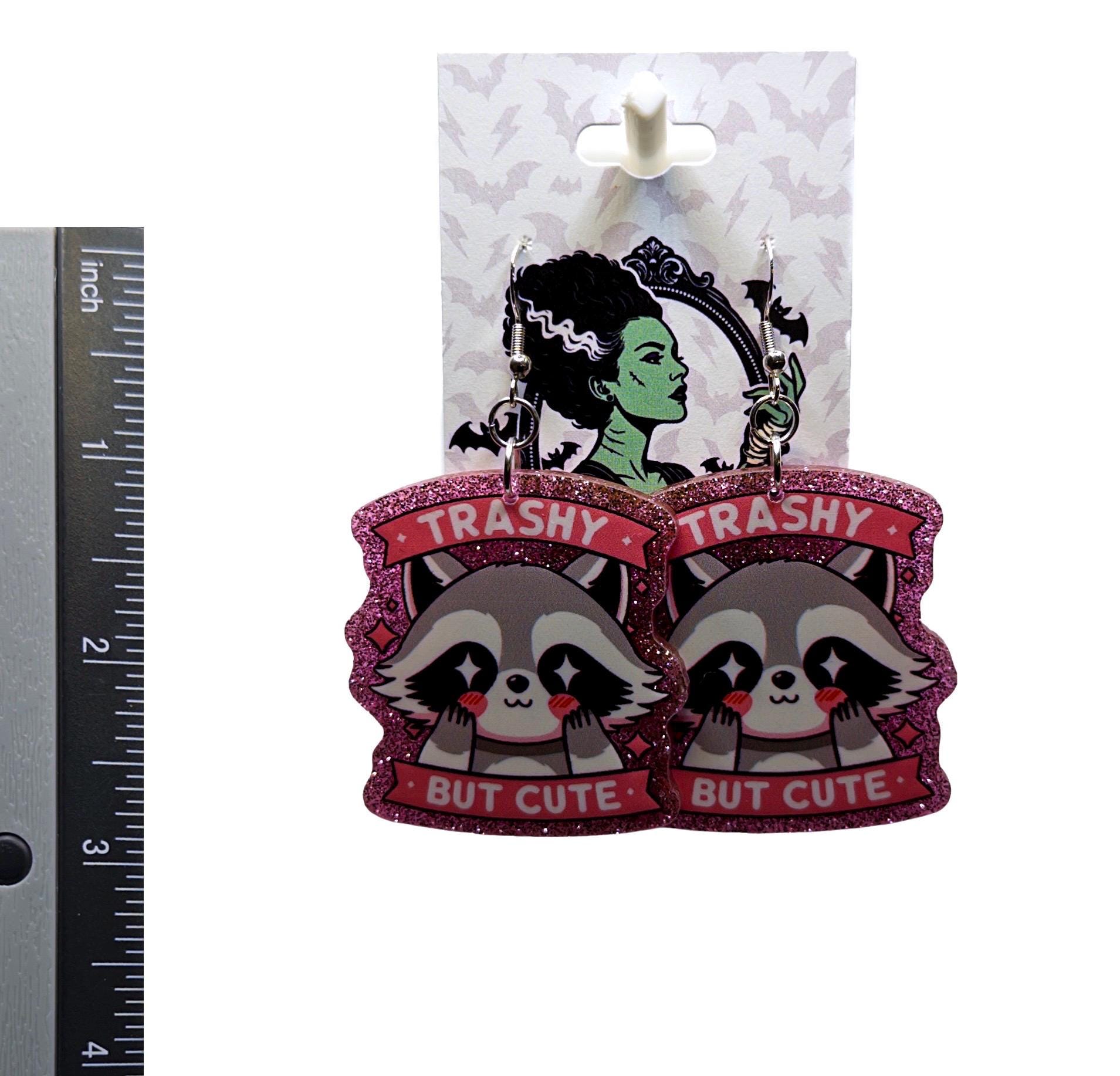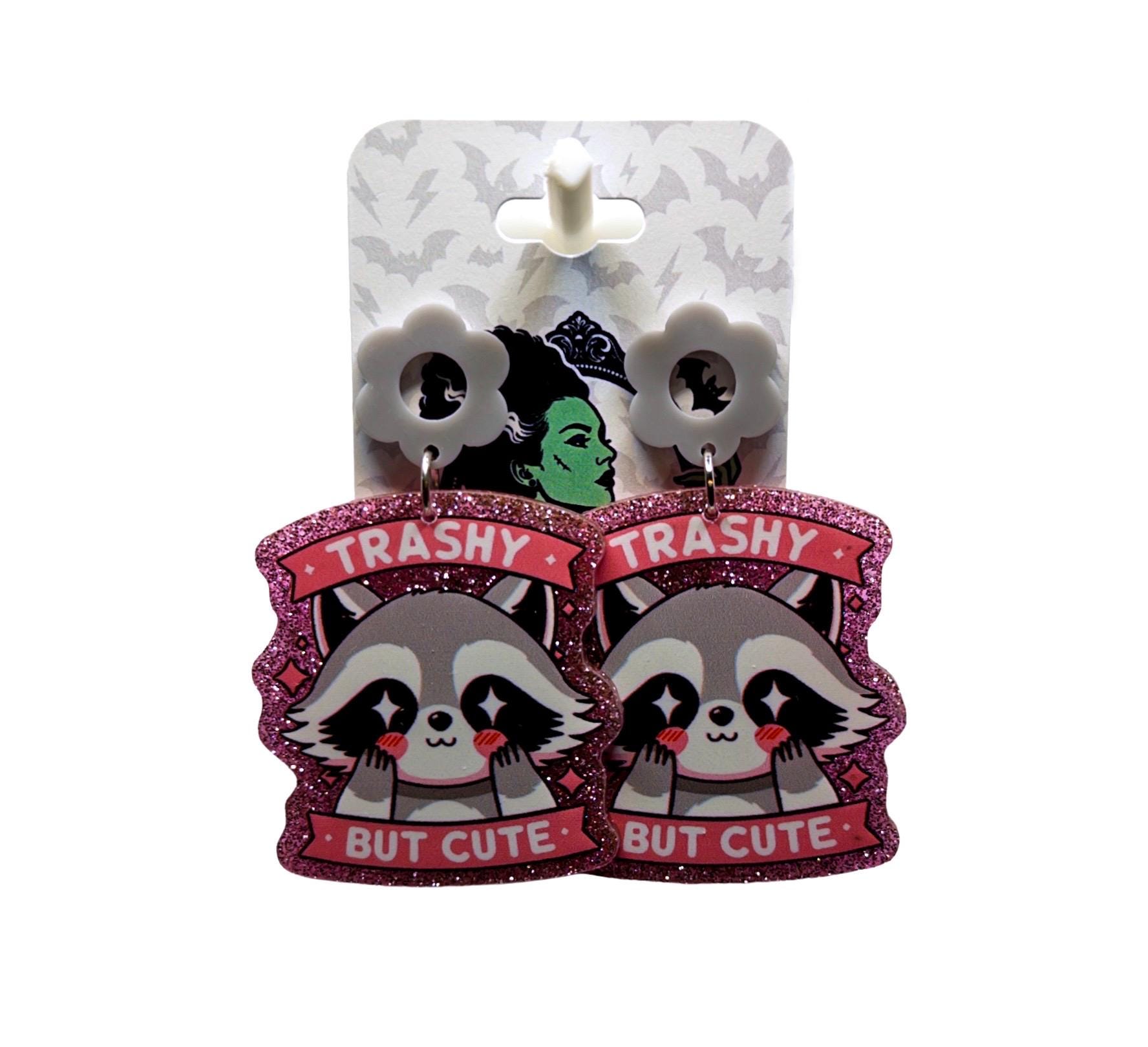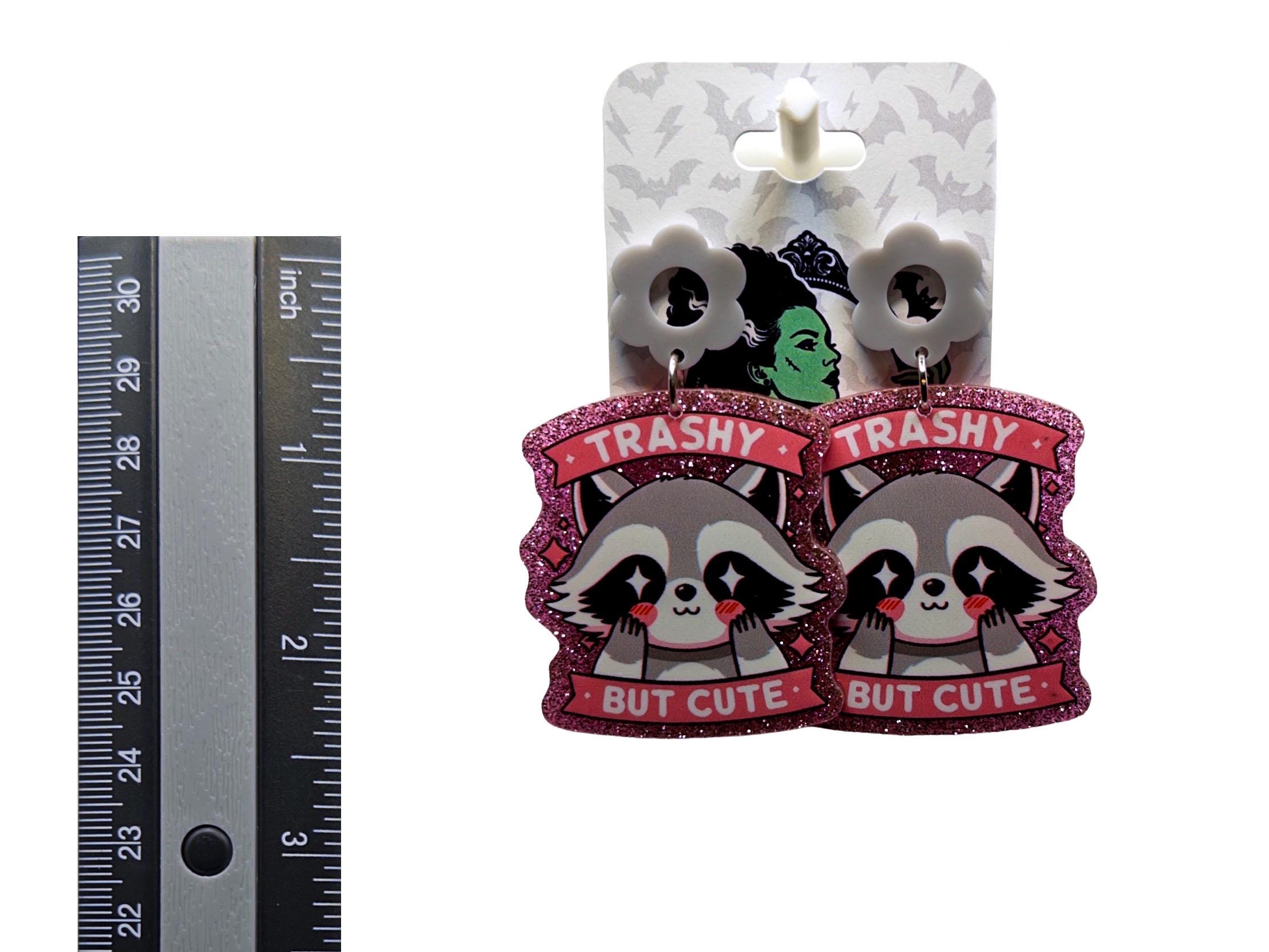 These adorable statement earrings feature a sweet little raccoon with sparkly pink glitter details and the ultimate mood: “Trashy But Cute.” Perfect for embracing your chaotic, cute energy while still serving a full look.