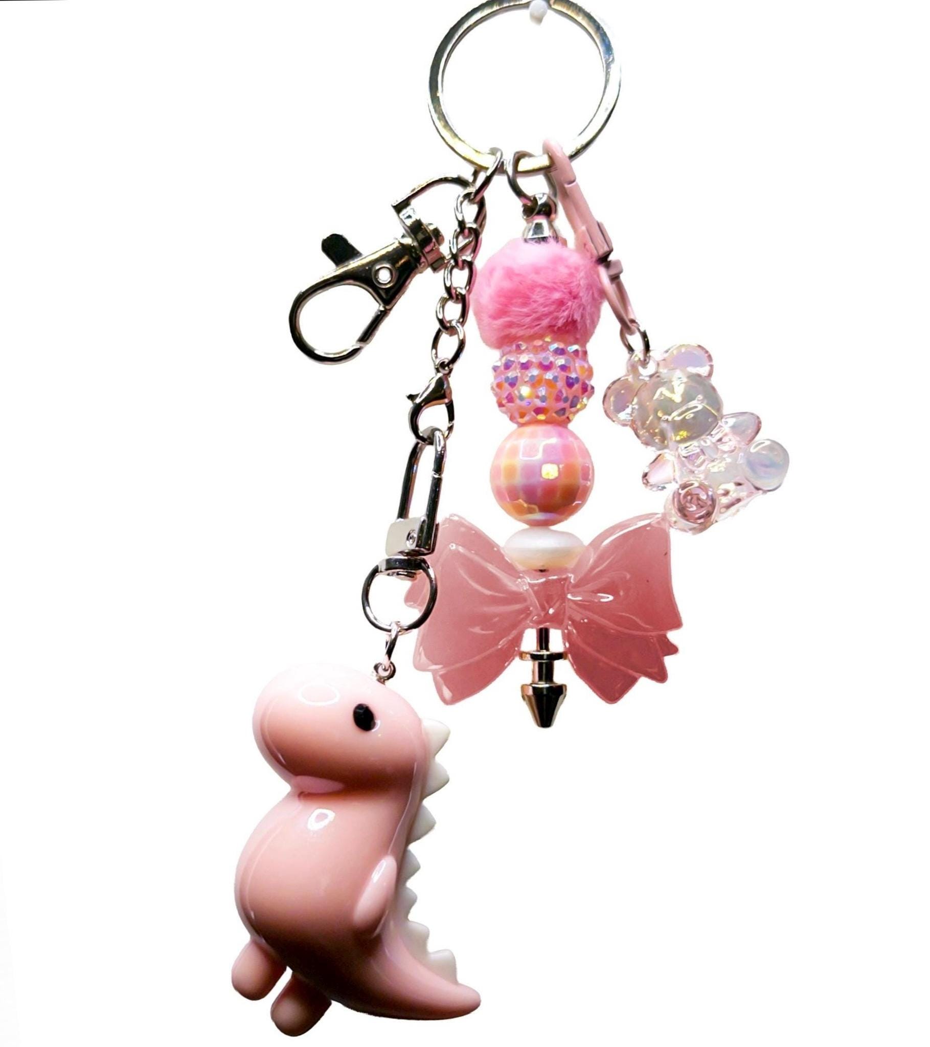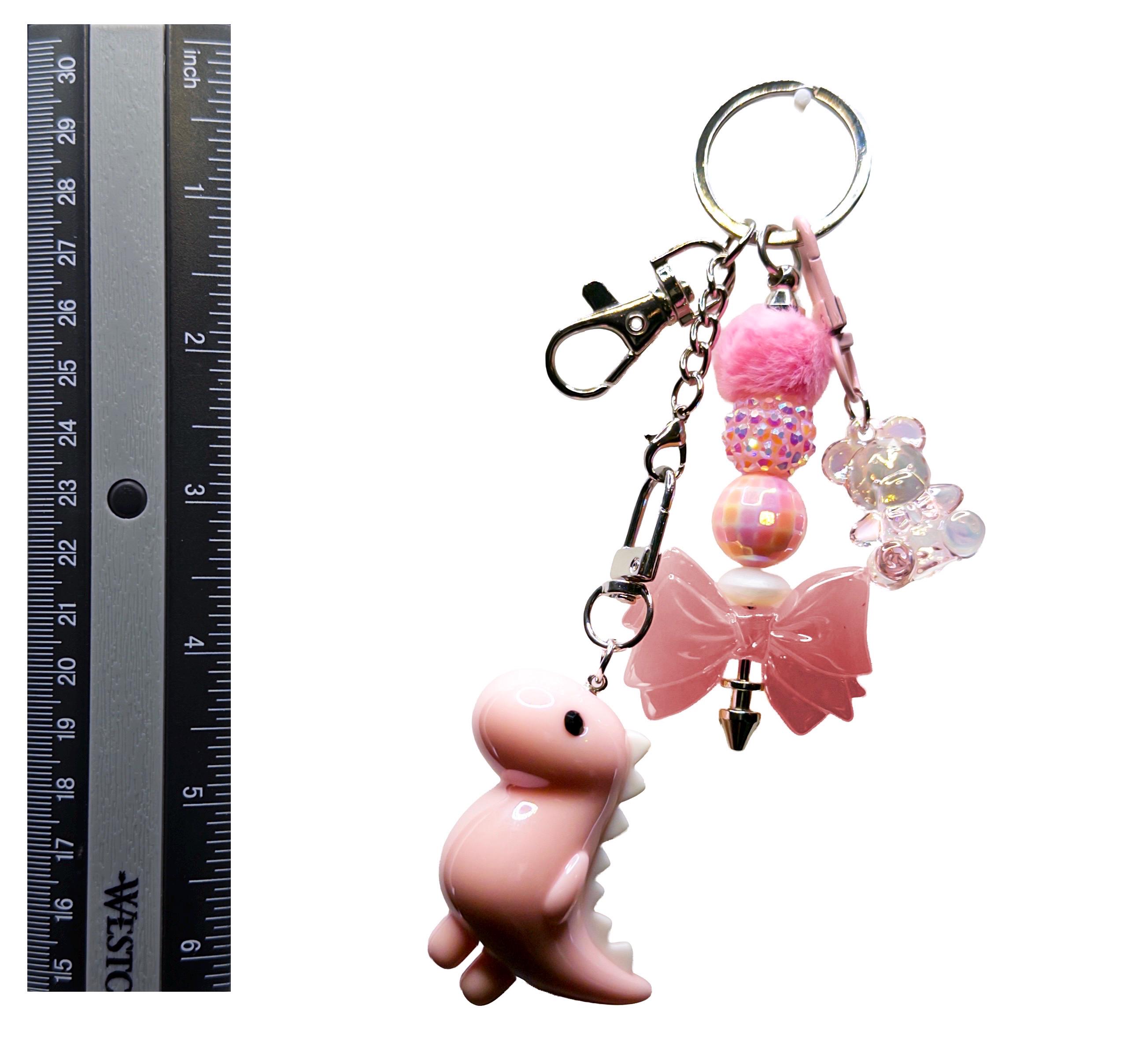 This pink dino keychain is the perfect mix of cute and whimsical, featuring a glossy pastel dinosaur charm paired with iridescent beads, a soft pom accent, and a delicate bow detail. Finished with a mini translucent teddy charm, it’s made to stand out while still feeling soft and dreamy.