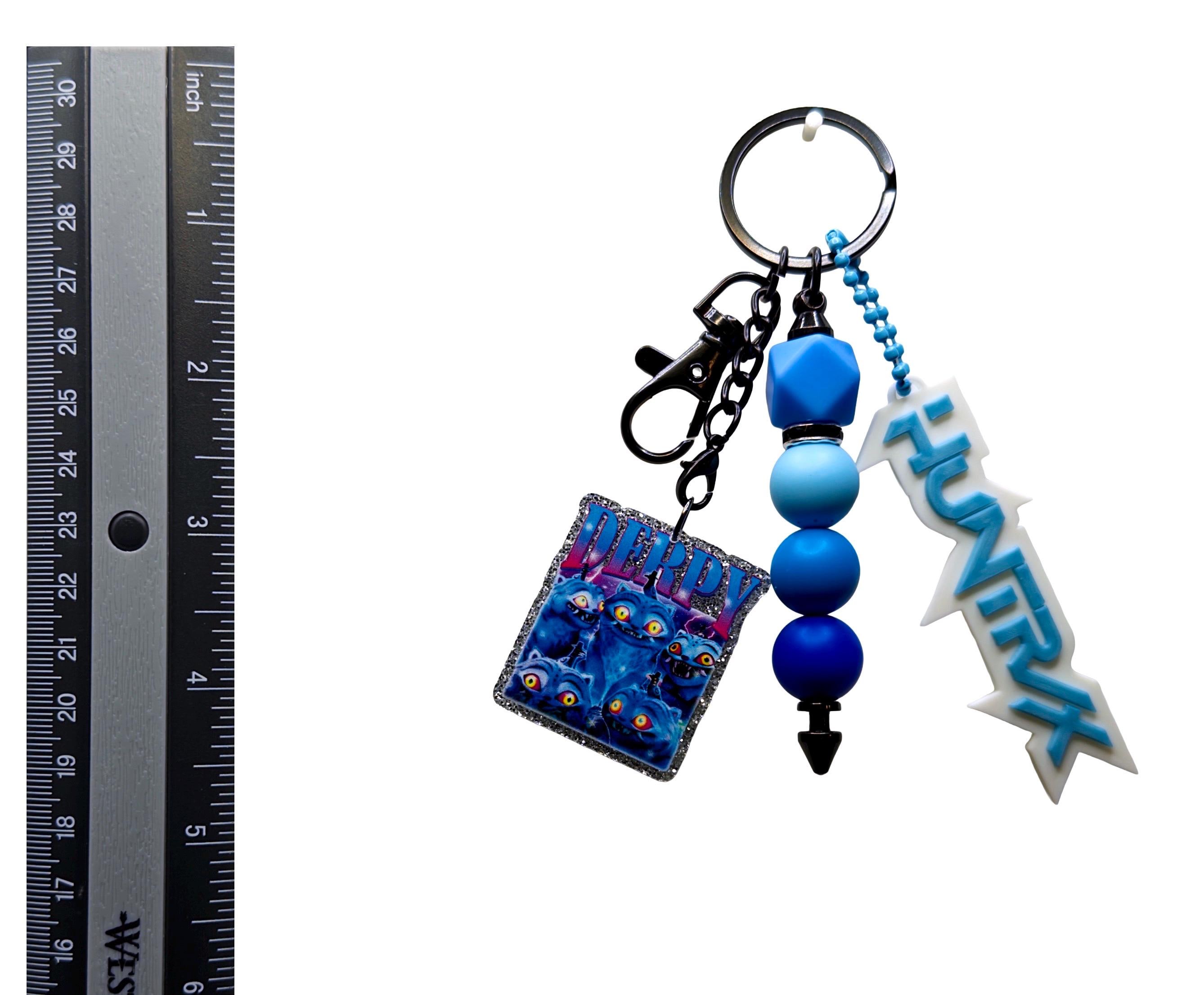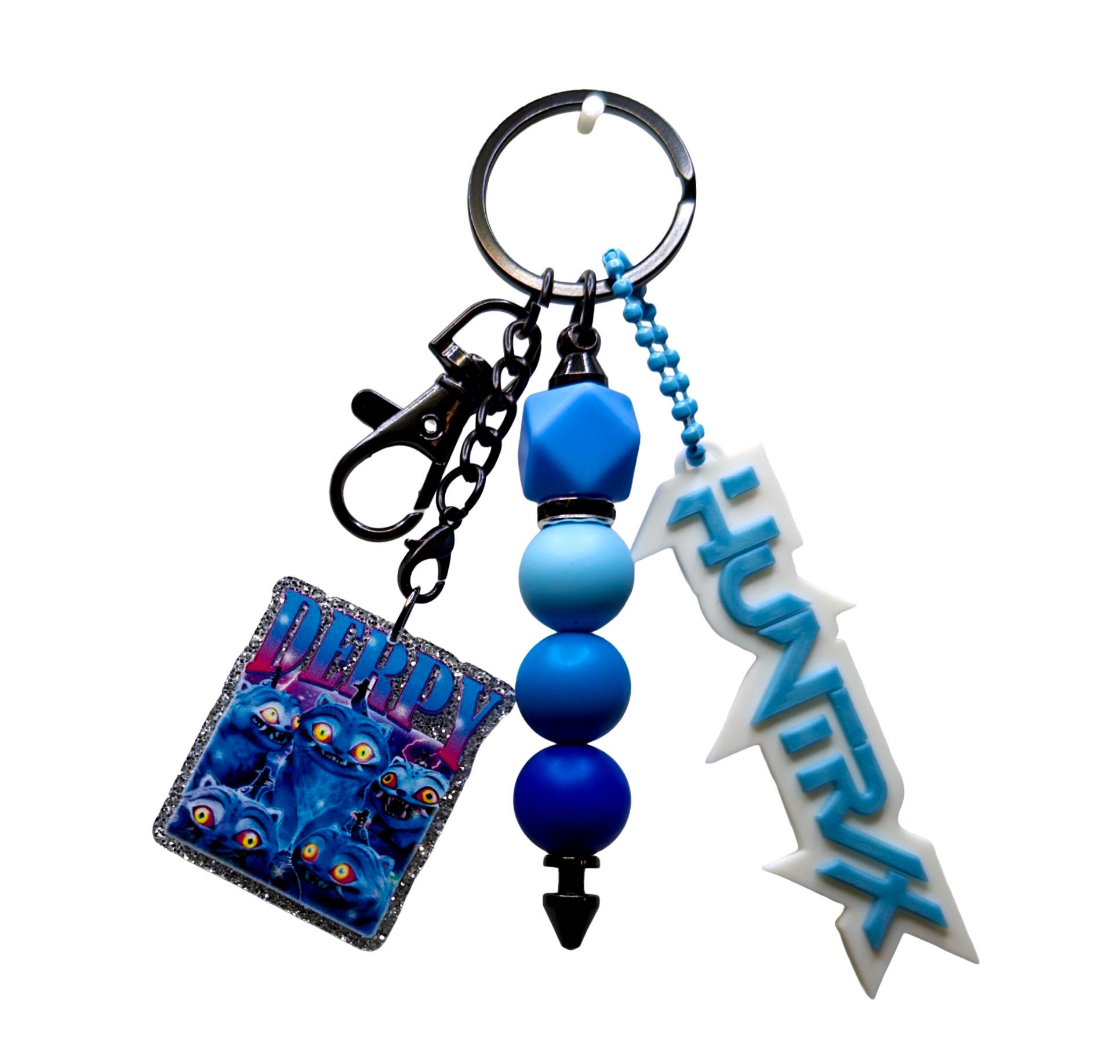 This blue-toned keychain features a haunting “Derpy” monster charm paired with layered shades of deep and icy blue beads, finished with a statement “HUNTRX” accent. It’s the perfect piece for anyone who loves creepy-cute aesthetics with a cool-toned edge.