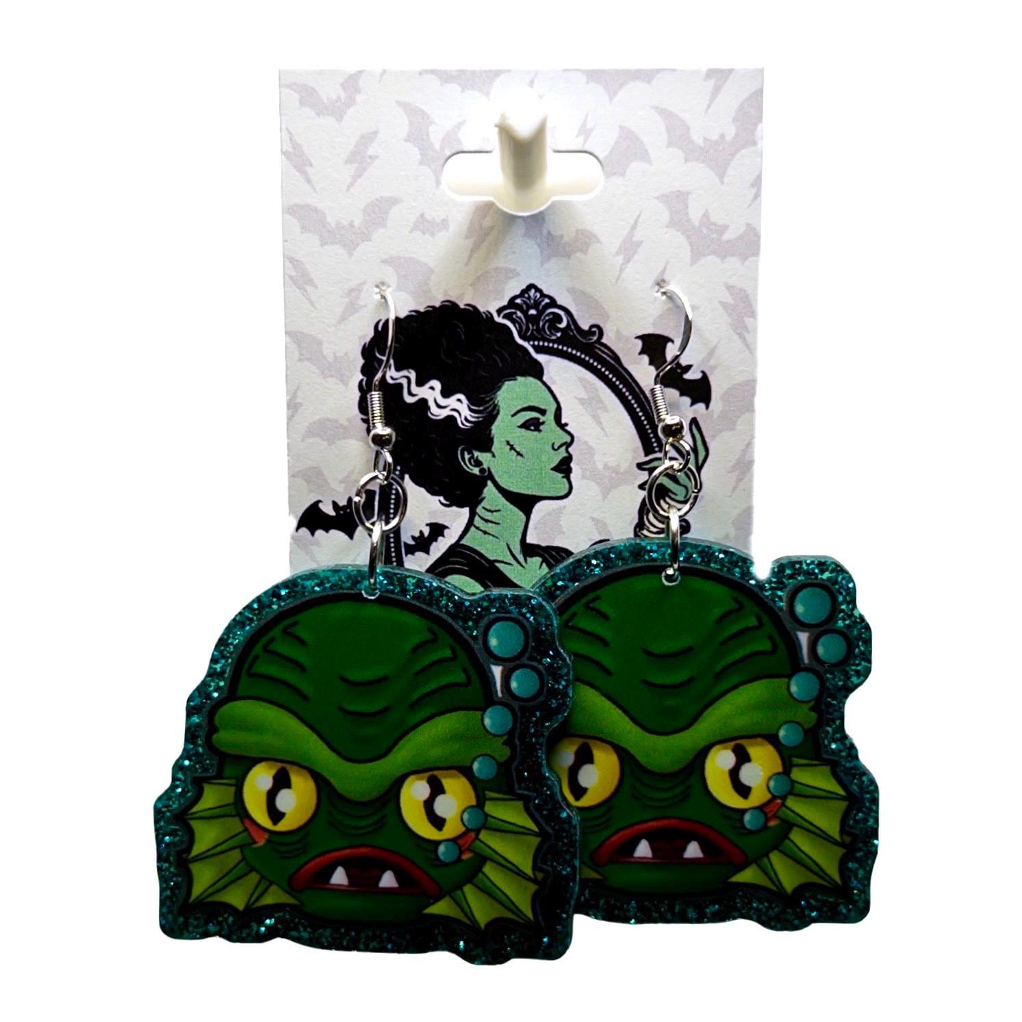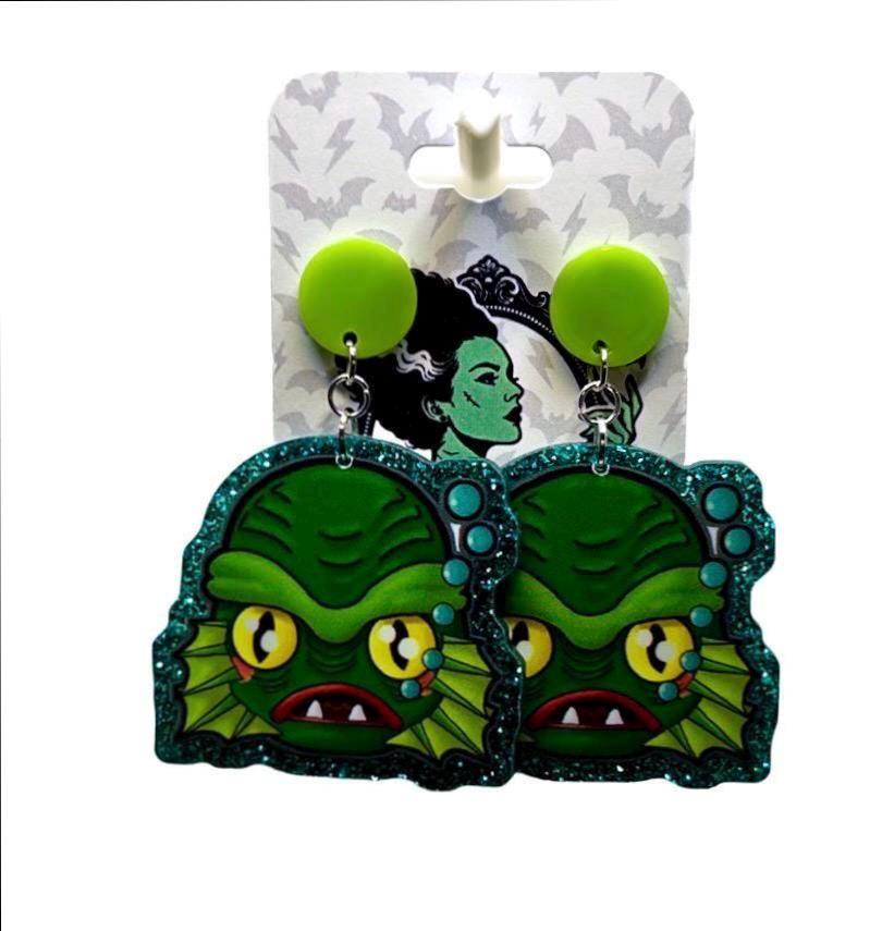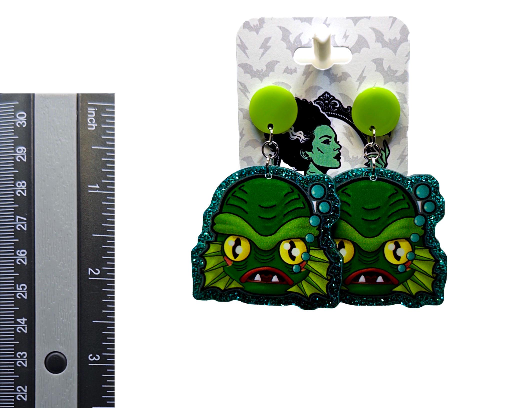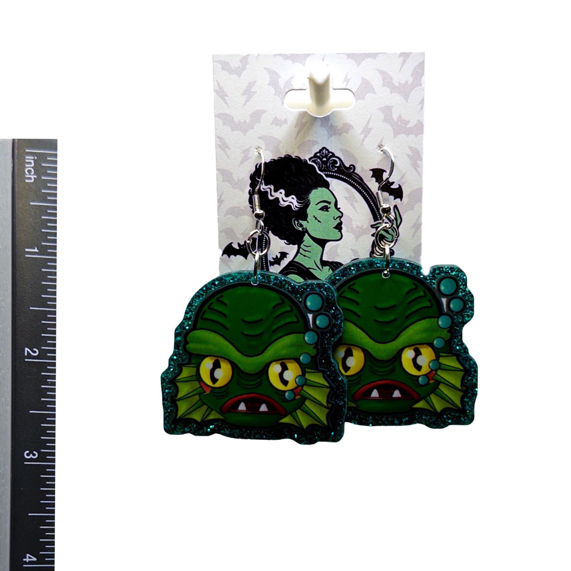 These bold statement earrings feature a classic monster-inspired design with big yellow eyes, fin details, and a glittery teal outline that makes them pop. Giving total vintage horror meets campy fun energy, they’re perfect for spooky season or anytime you’re feeling a little extra.